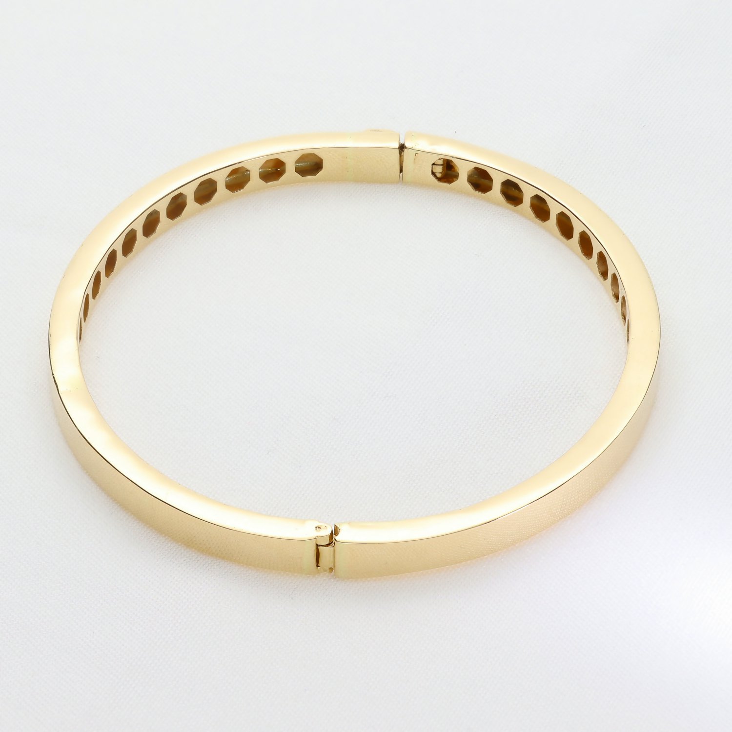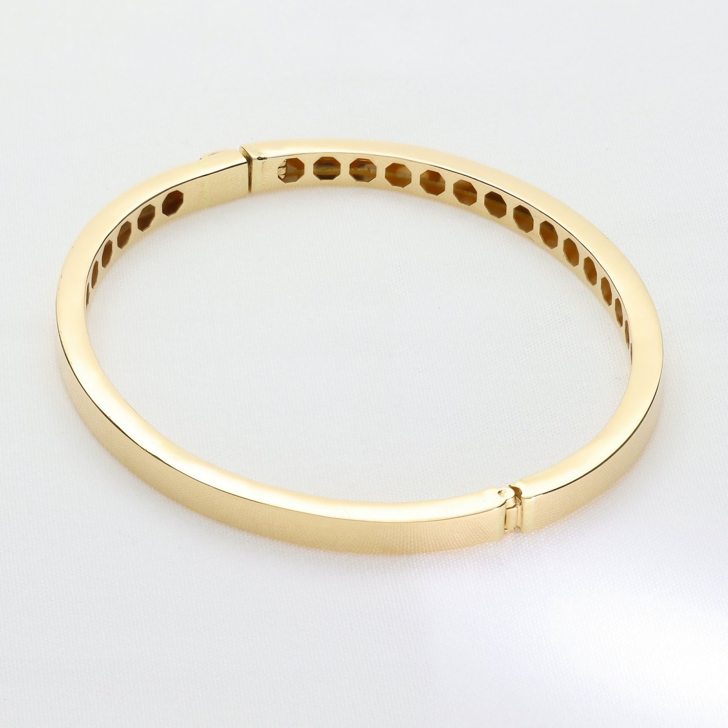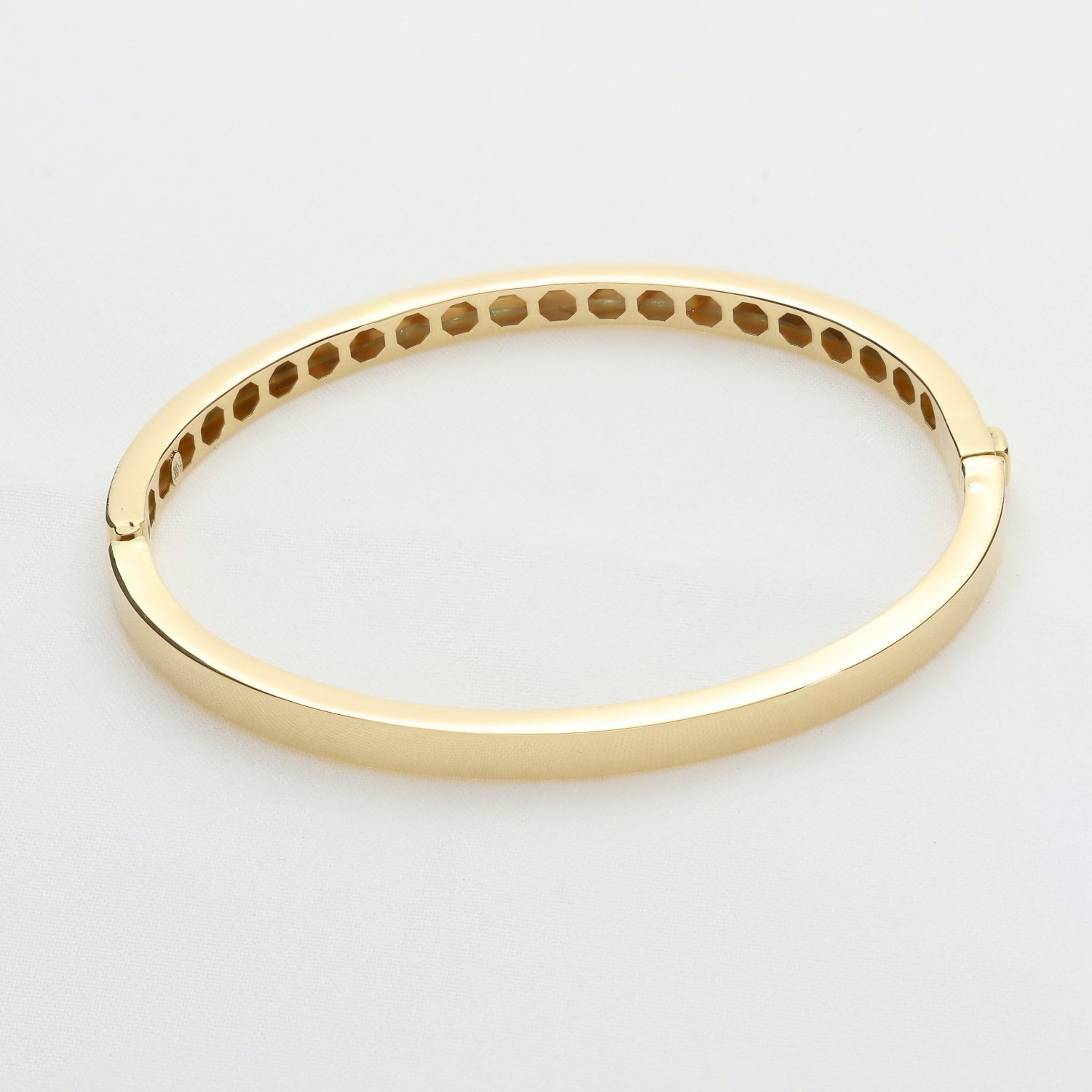 Ta złota bransoletka to uosobienie nowoczesnej elegancji i minimalizmu. Wykonana z lśniącego, żółtego złota, jej gładka, pełna forma pięknie układa się na nadgarstku, stając się subtelnym, ale wyrazistym akcentem.