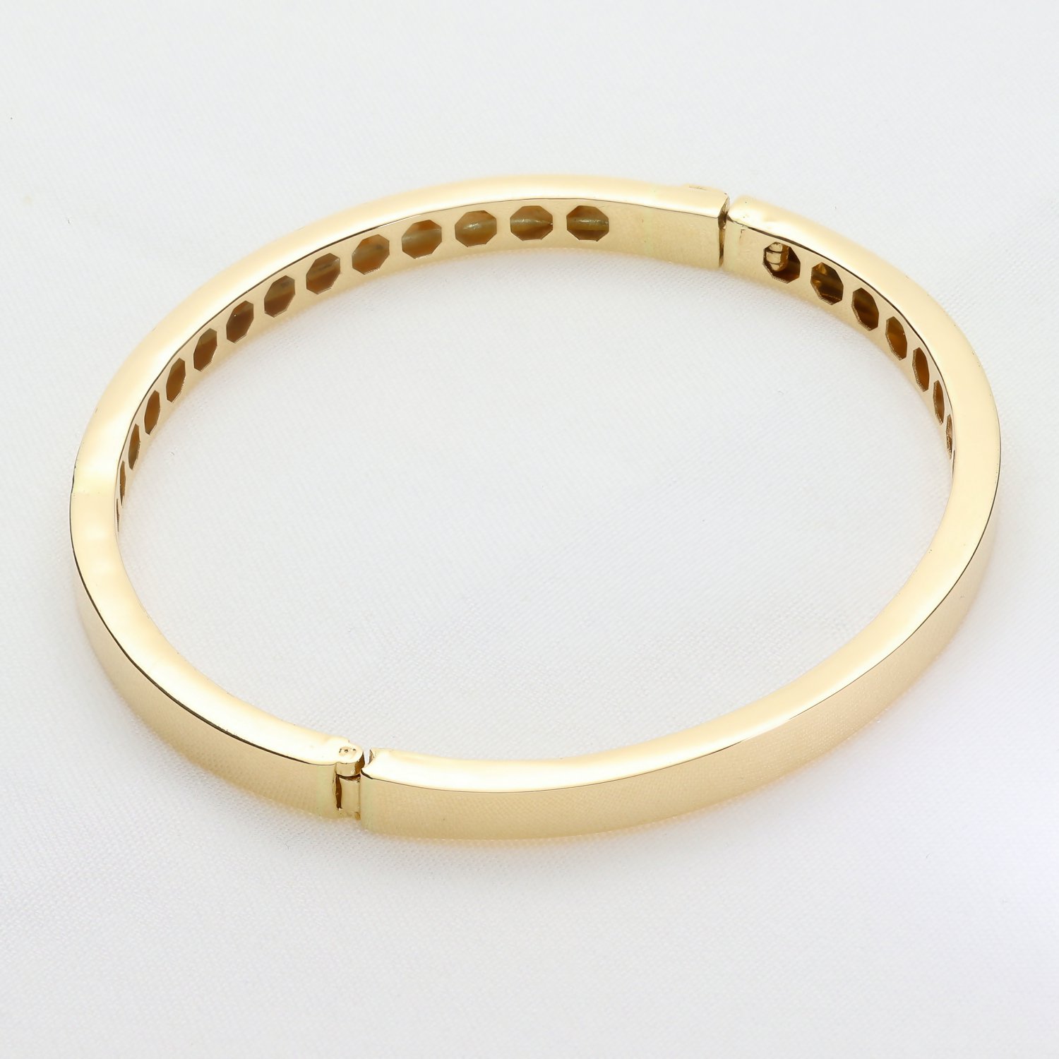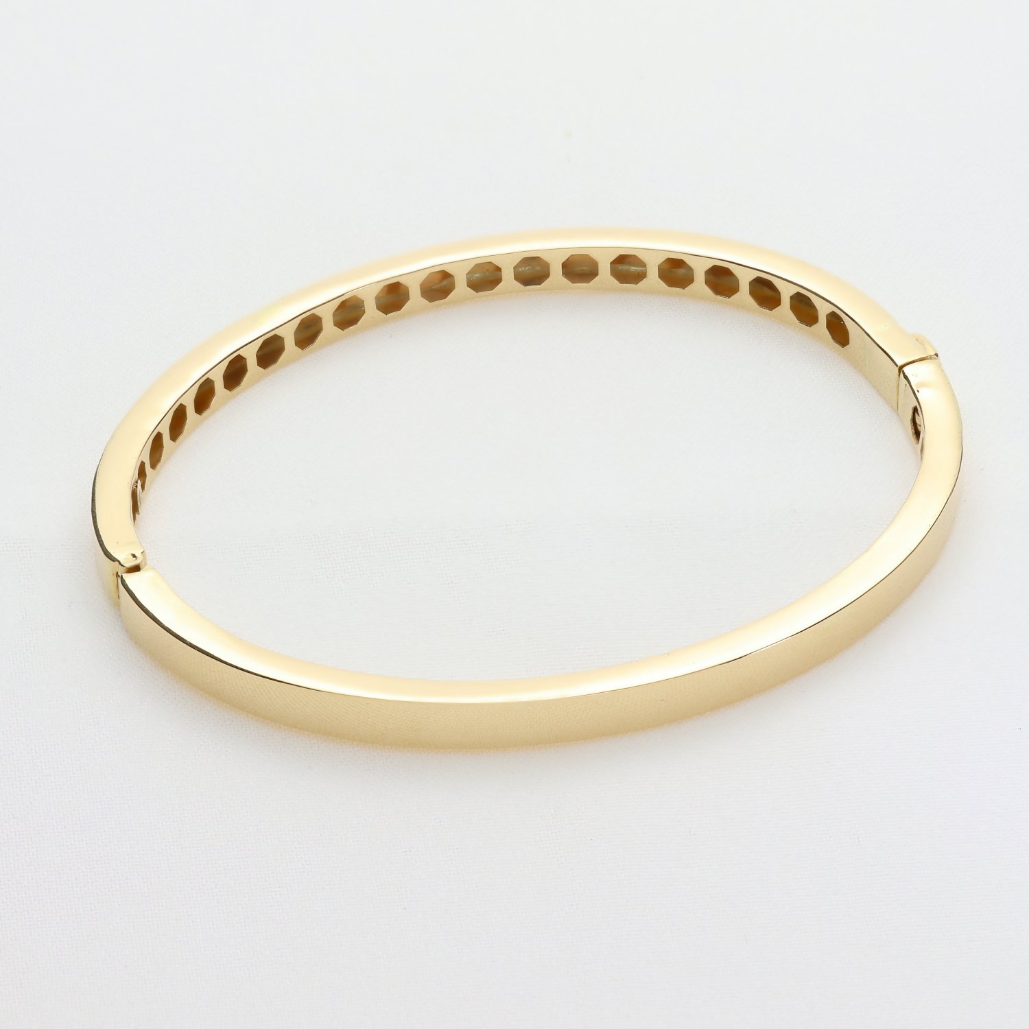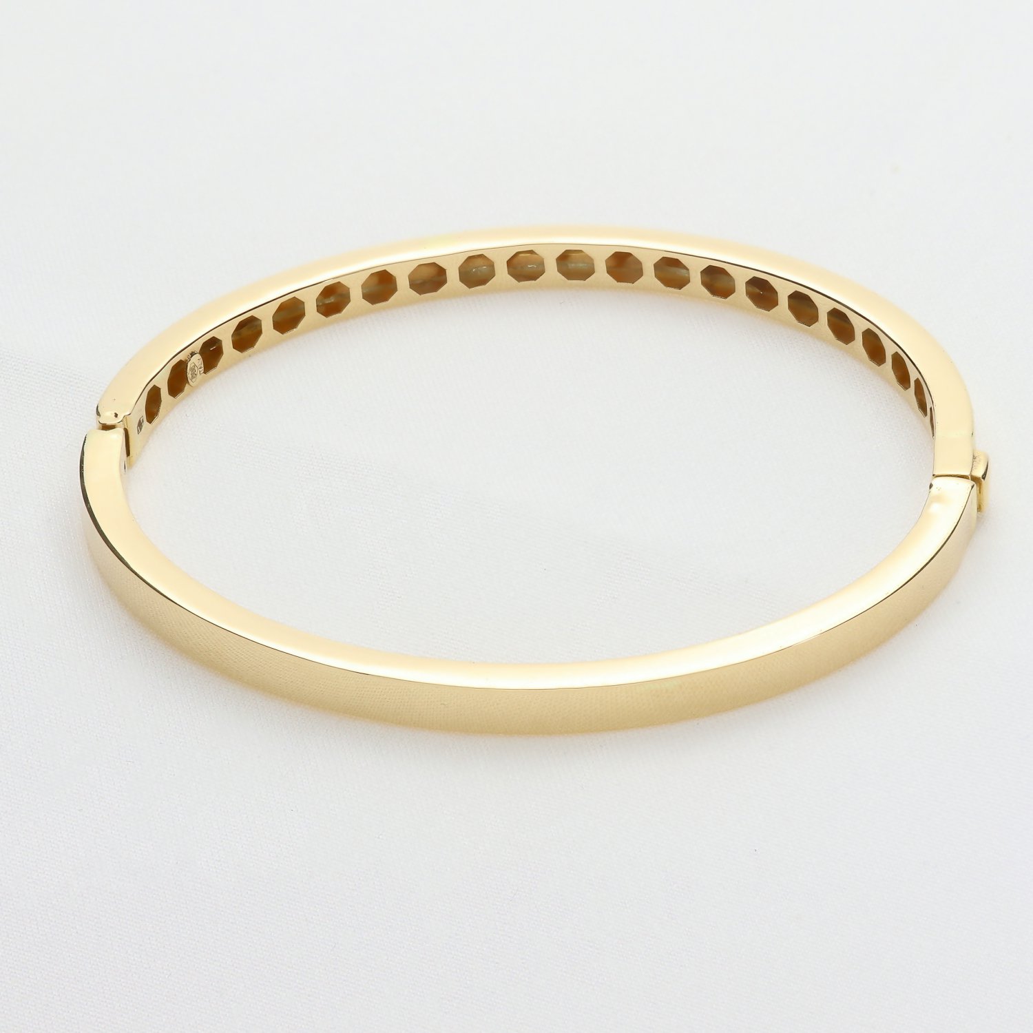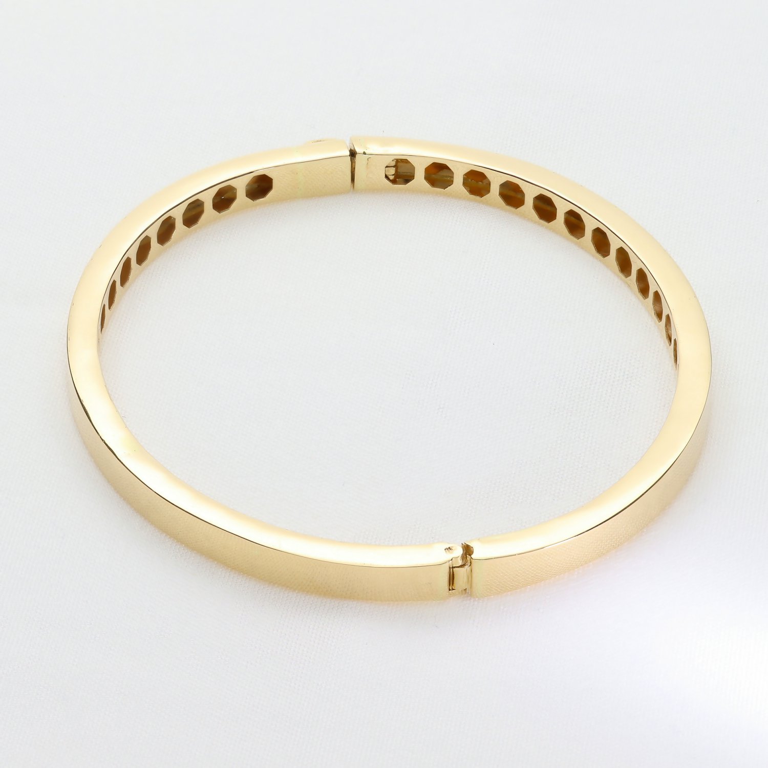 Ta złota bransoletka to uosobienie nowoczesnej elegancji i minimalizmu. Wykonana z lśniącego, żółtego złota, jej gładka, pełna forma pięknie układa się na nadgarstku, stając się subtelnym, ale wyrazistym akcentem.