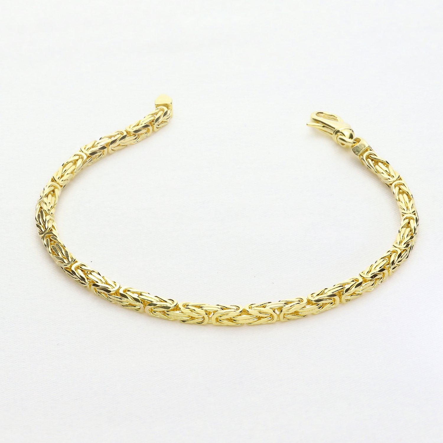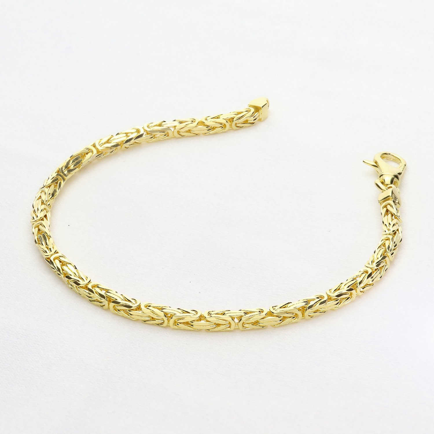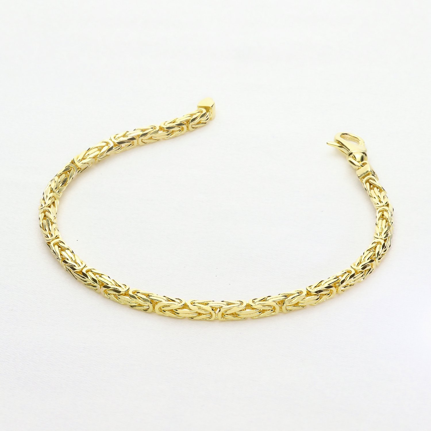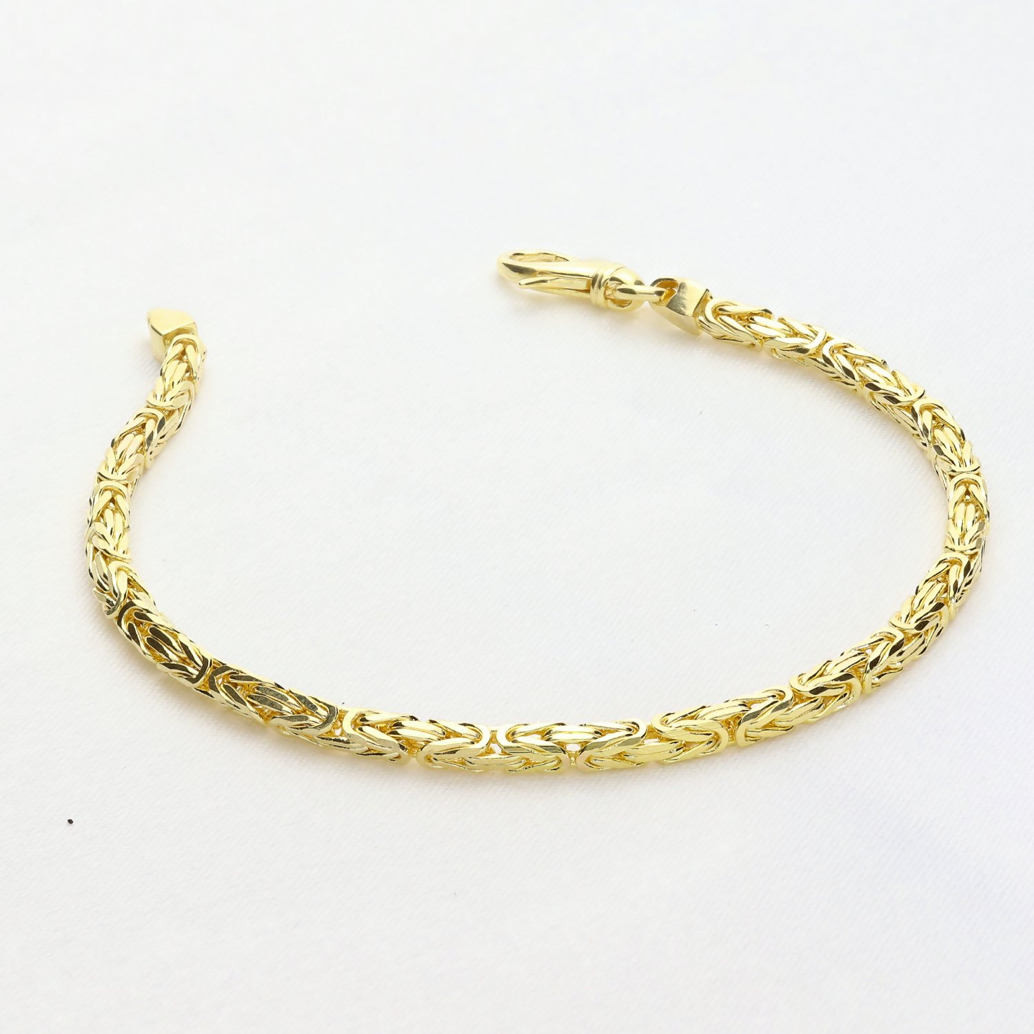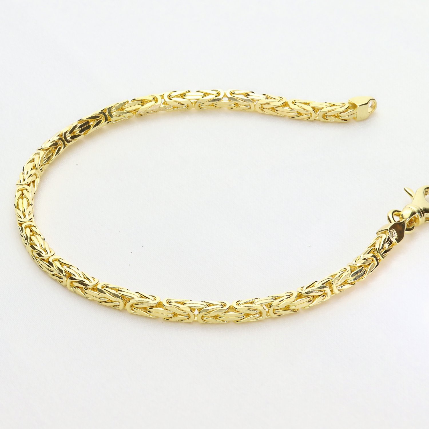 Przedstawiamy klasyczną, a zarazem wyjątkowo efektowną bransoletę wykonaną ze szlachetnego złota. Centralnym punktem tego modelu jest misterny splot królewski (bizantyjski), znany z dużej gęstości, trójwymiarowości i niepowtarzalnej tekstury, która pięknie odbija światło z każdego kąta. Splot królewski charakteryzuje się precyzyjnym łączeniem ogniw w regularny, złożony wzór. Jest to jeden z najbardziej cenionych i wytrzymałych splotów w jubilerstwie, symbolizujący luksus i trwałość. Wyposażona w solidne i bezpieczne zapięcie typu karabińczyk, które gwarantuje komfort noszenia i pewność, że bransoleta pozostanie na nadgarstku. Mimo swojej wyrazistej struktury, bransoleta ma uniwersalną grubość, co czyni ją idealną zarówno do codziennych, eleganckich stylizacji, jak i na wyjątkowe okazje. Doskonała zarówno dla kobiet, jak i mężczyzn ceniących klasyczną biżuterię wysokiej jakości.