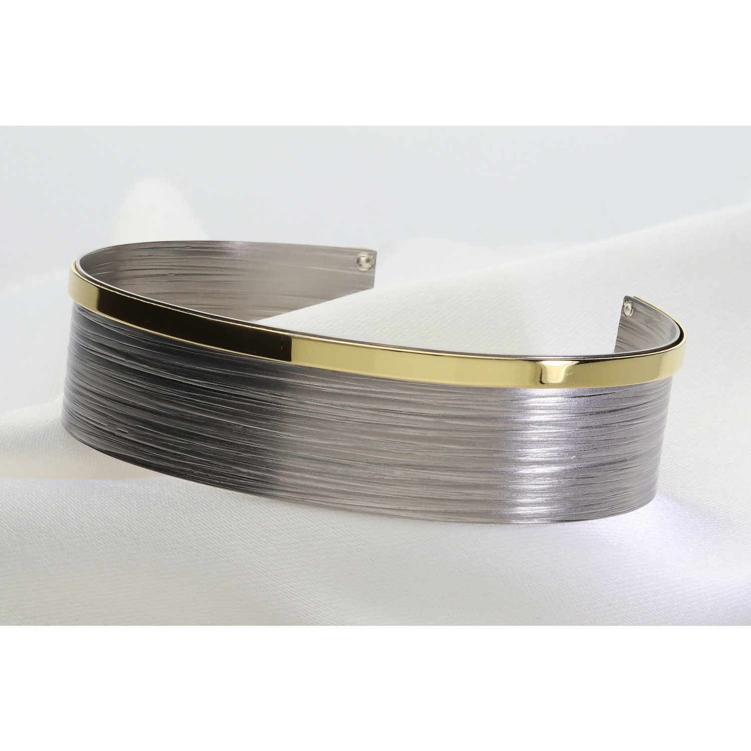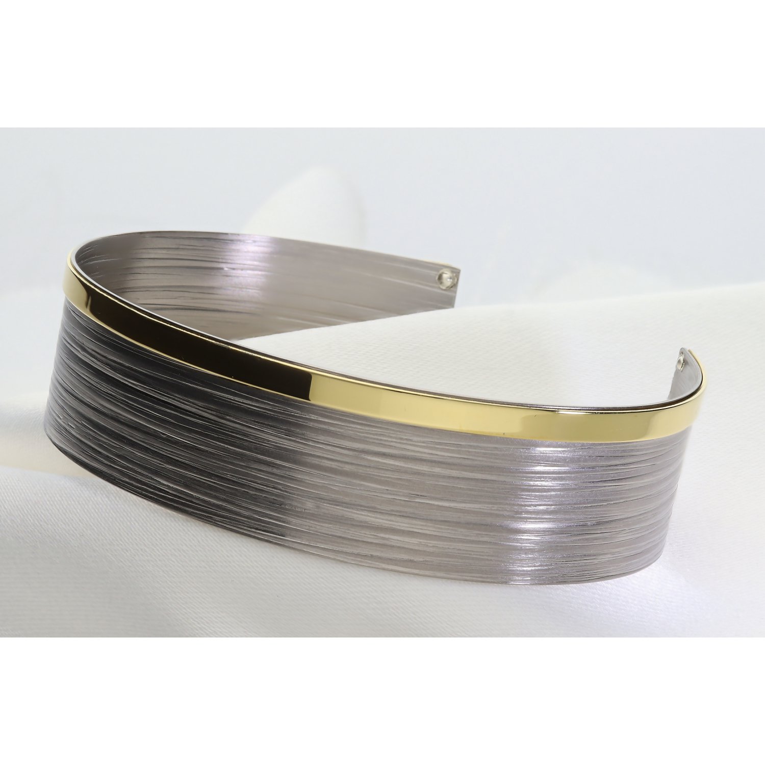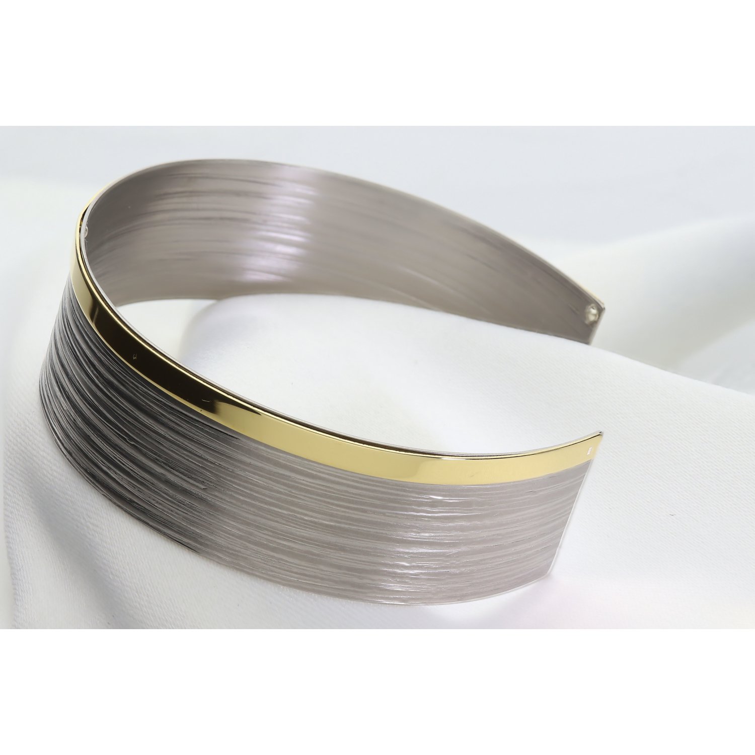 ​Baza bransolety wykonana jest z najwyższej jakości srebra, które przeszło zaawansowany proces wykończenia. Górna, szeroka część bransolety zachwyca satynową, szczotkowaną teksturą w odcieniach głębokiego, srebrnego szarości. Subtelne, poziome żłobienia nadają jej nowoczesny, wręcz architektoniczny charakter. Kontrastem dla surowej płaszczyzny jest dolna krawędź – polerowana na wysoki połysk, gładka listwa wykończona powłoką z tytanu w kolorze złota. To unikalne połączenie kolorów i faktur sprawia, że bransoleta prezentuje się niezwykle luksusowo i nowocześnie.