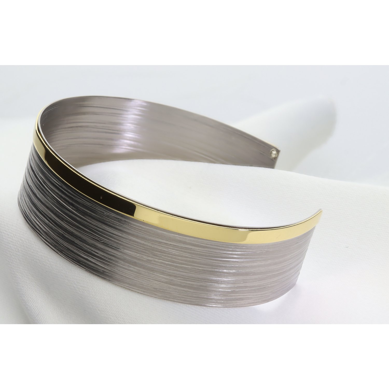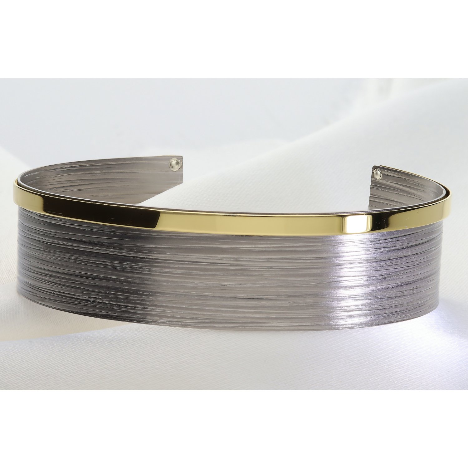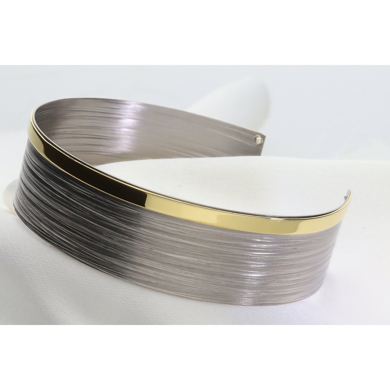 ​Baza bransolety wykonana jest z najwyższej jakości srebra, które przeszło zaawansowany proces wykończenia. Górna, szeroka część bransolety zachwyca satynową, szczotkowaną teksturą w odcieniach głębokiego, srebrnego szarości. Subtelne, poziome żłobienia nadają jej nowoczesny, wręcz architektoniczny charakter. Kontrastem dla surowej płaszczyzny jest dolna krawędź – polerowana na wysoki połysk, gładka listwa wykończona powłoką z tytanu w kolorze złota. To unikalne połączenie kolorów i faktur sprawia, że bransoleta prezentuje się niezwykle luksusowo i nowocześnie.