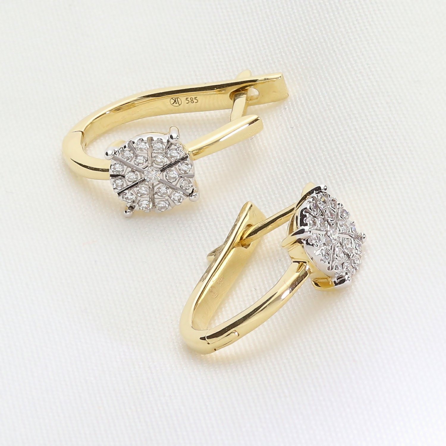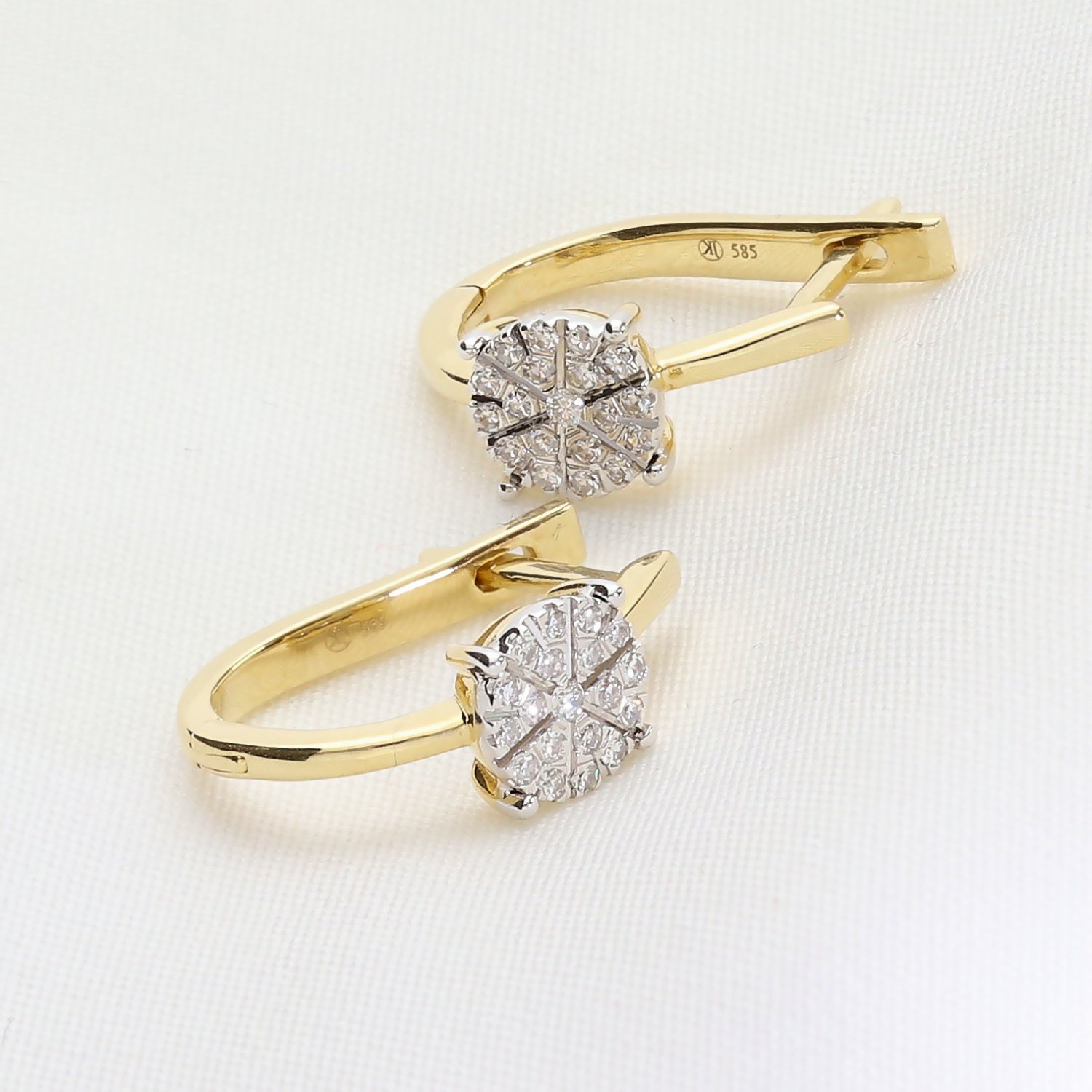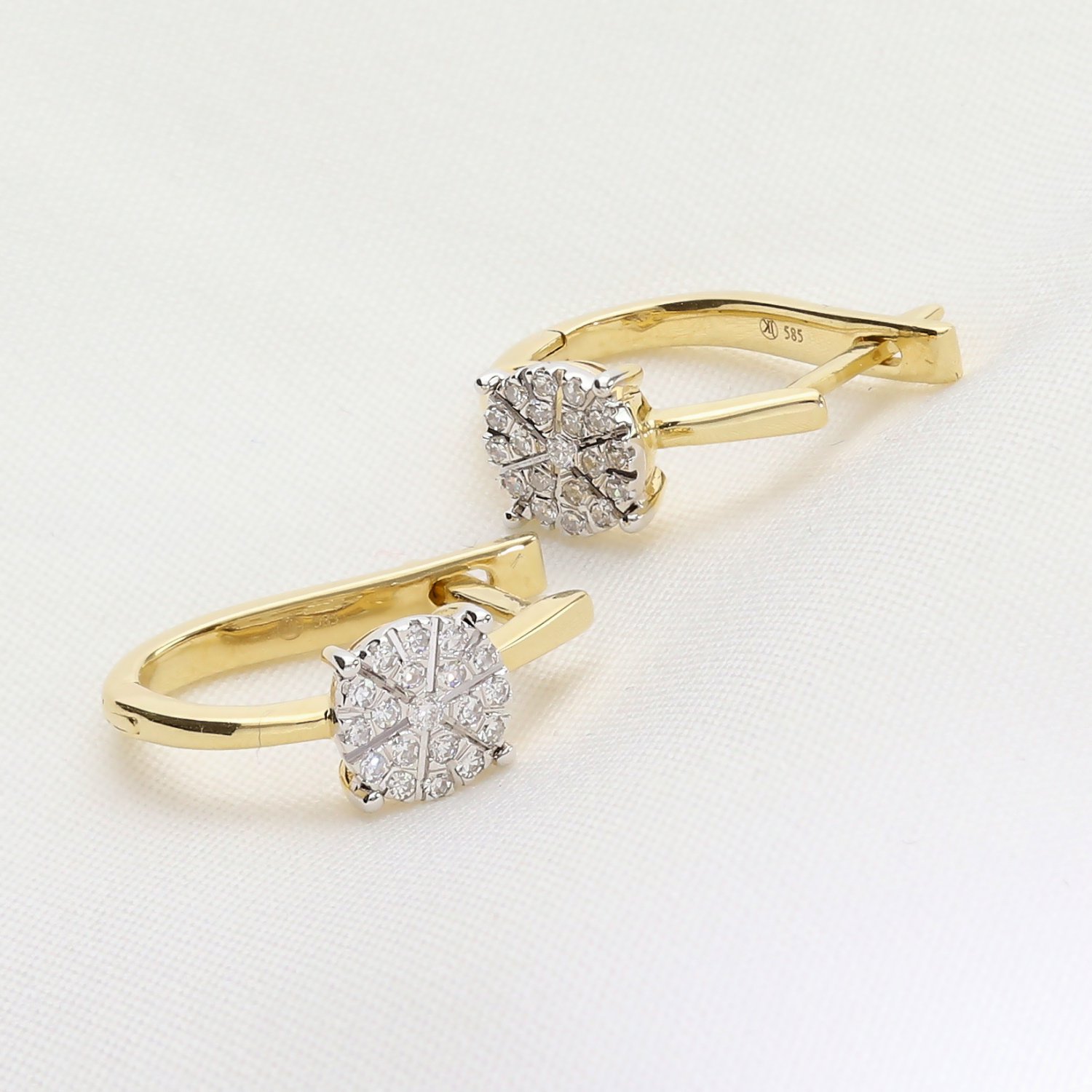 Eleganckie złote kolczyki z brylantami wykonane z wysokiej jakości złota próby 585. Subtelne, a jednocześnie efektowne – idealne połączenie klasyki i nowoczesnego designu. Centralny element zdobiony jest kompozycją z brylantów o szlifie okrągłym, ułożonych w kształt kwiatu, co nadaje biżuterii wyjątkowego blasku. Zapięcie typu angielskiego gwarantuje wygodę i bezpieczeństwo noszenia.