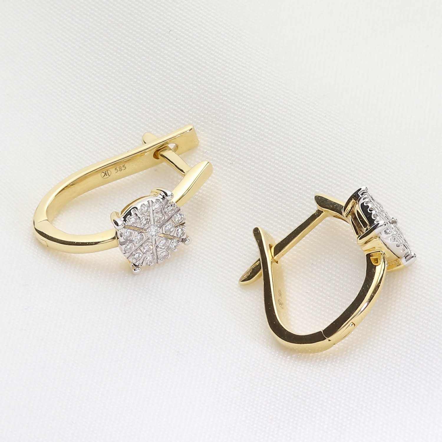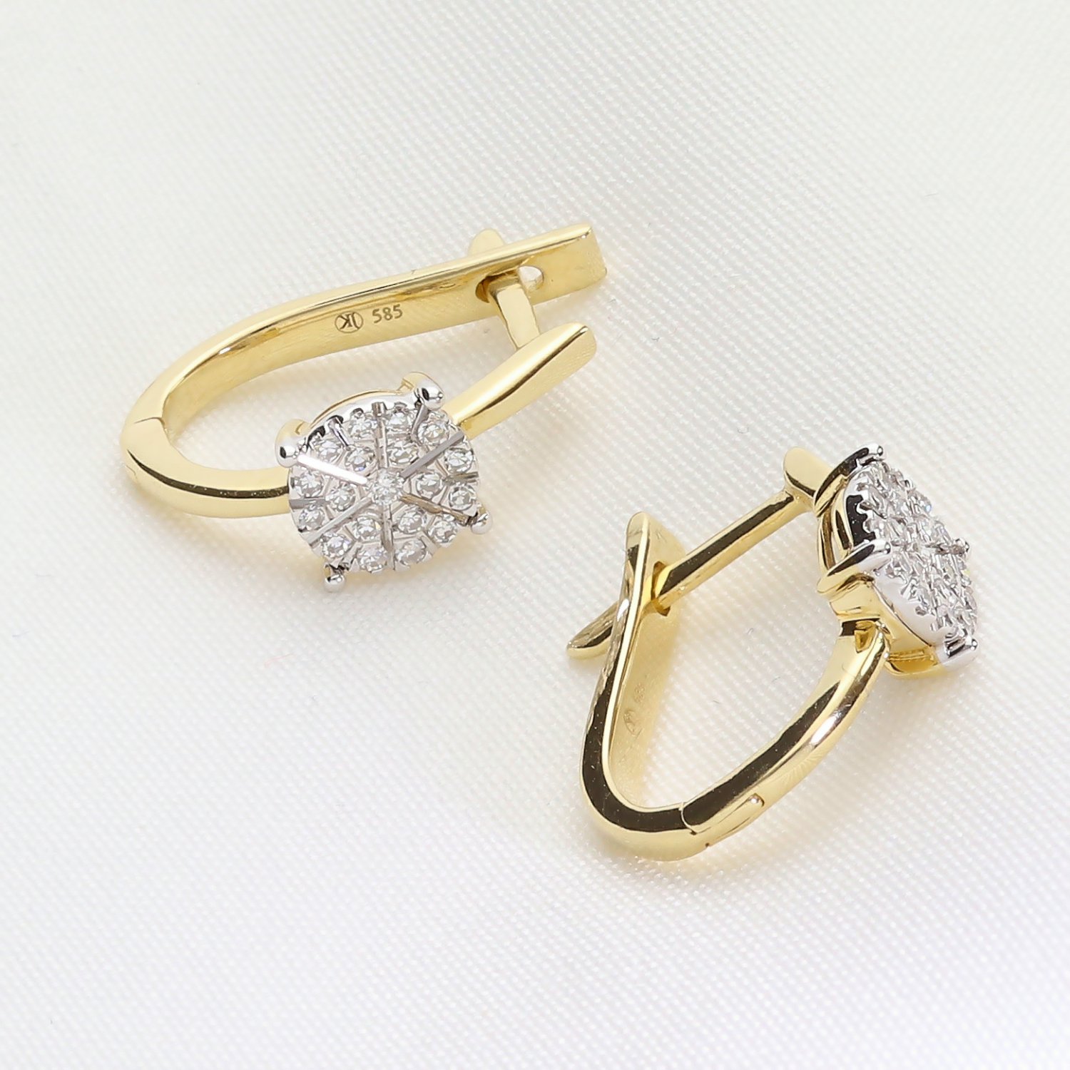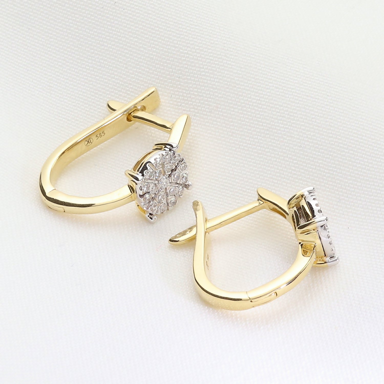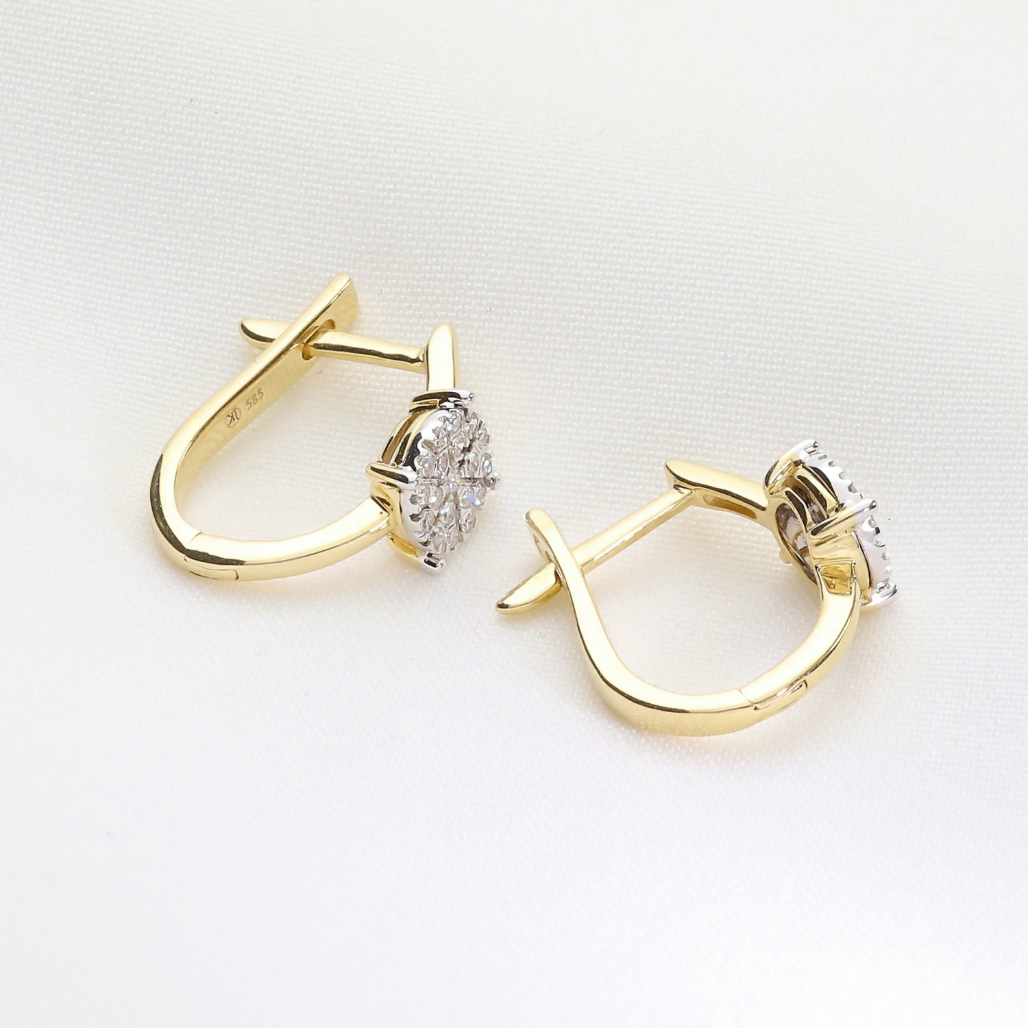 Eleganckie złote kolczyki z brylantami wykonane z wysokiej jakości złota próby 585. Subtelne, a jednocześnie efektowne – idealne połączenie klasyki i nowoczesnego designu. Centralny element zdobiony jest kompozycją z brylantów o szlifie okrągłym, ułożonych w kształt kwiatu, co nadaje biżuterii wyjątkowego blasku. Zapięcie typu angielskiego gwarantuje wygodę i bezpieczeństwo noszenia.