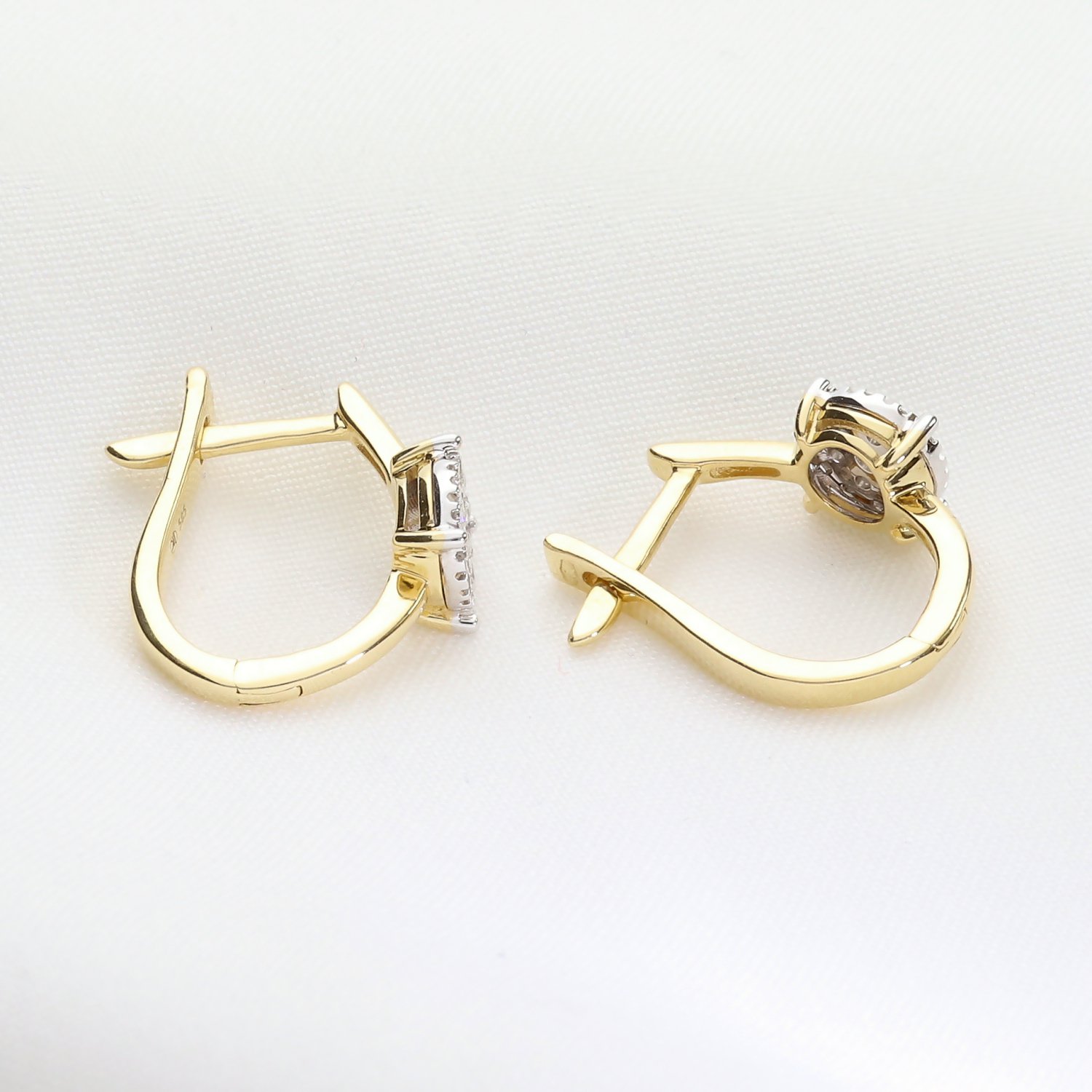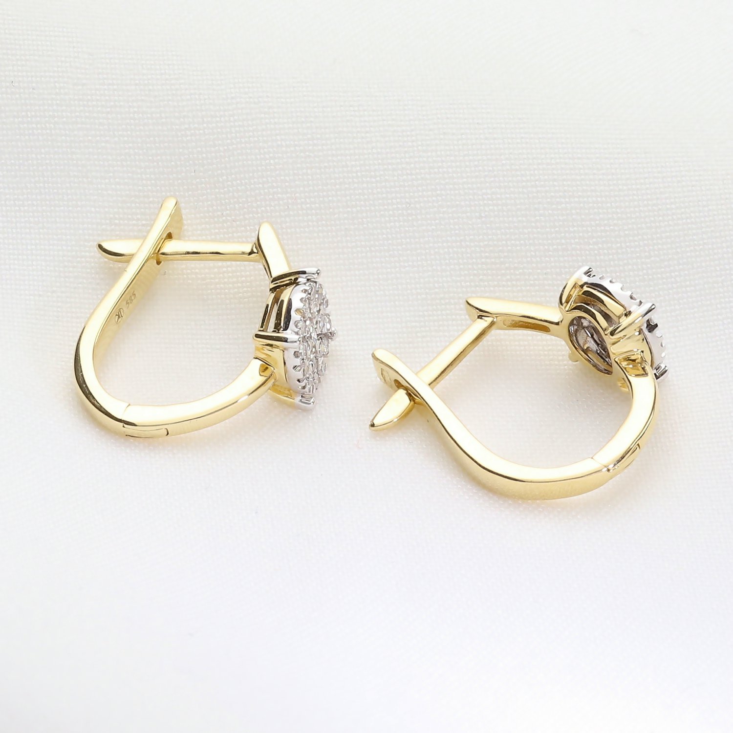 Kategoria: Kolczyki Kruszec: Złoto żółte Kamień: Brylanty, 38 szt. o łącznej masie 0,19 ct. Czystość: SI Barwa: GH Próba: 585 Masa: 3,23 g.