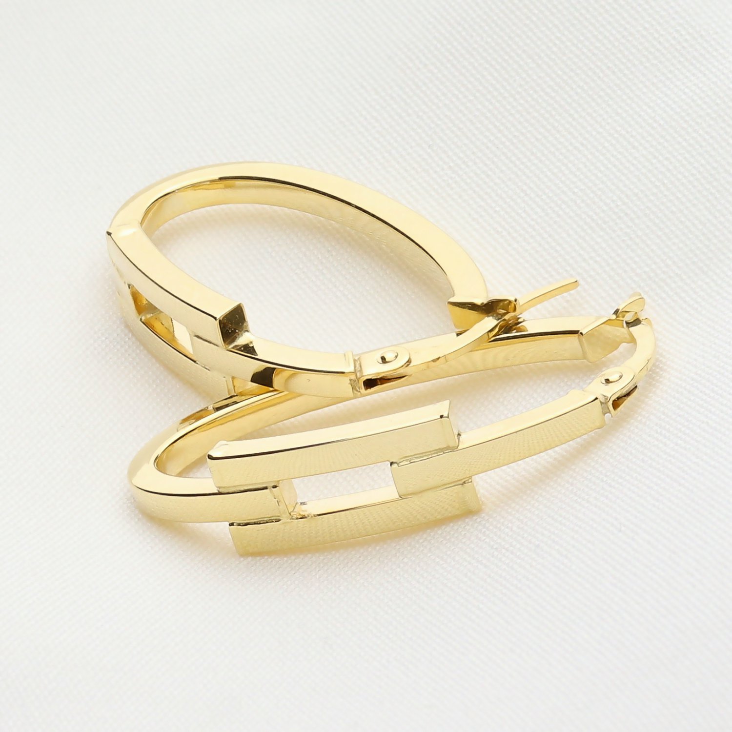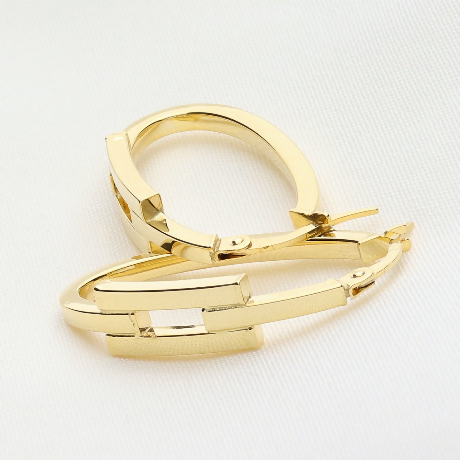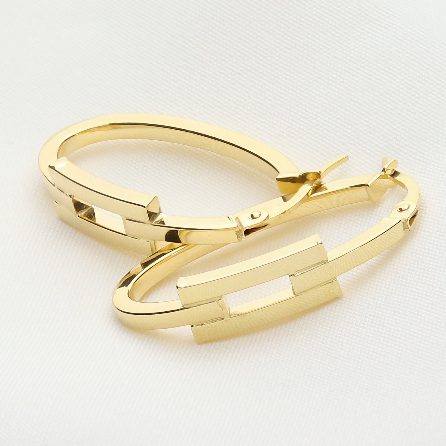 Eleganckie złote kolczyki o wyjątkowym, geometrycznym kształcie. Wykonane z wysokiej jakości złota, zachwycają prostotą i nowoczesnym designem. Delikatne, ale jednocześnie wyraziste — idealne zarówno do codziennych stylizacji, jak i na wyjątkowe okazje. Ich subtelny połysk i precyzyjne wykończenie podkreślają klasę i dobry gust właścicielki.
