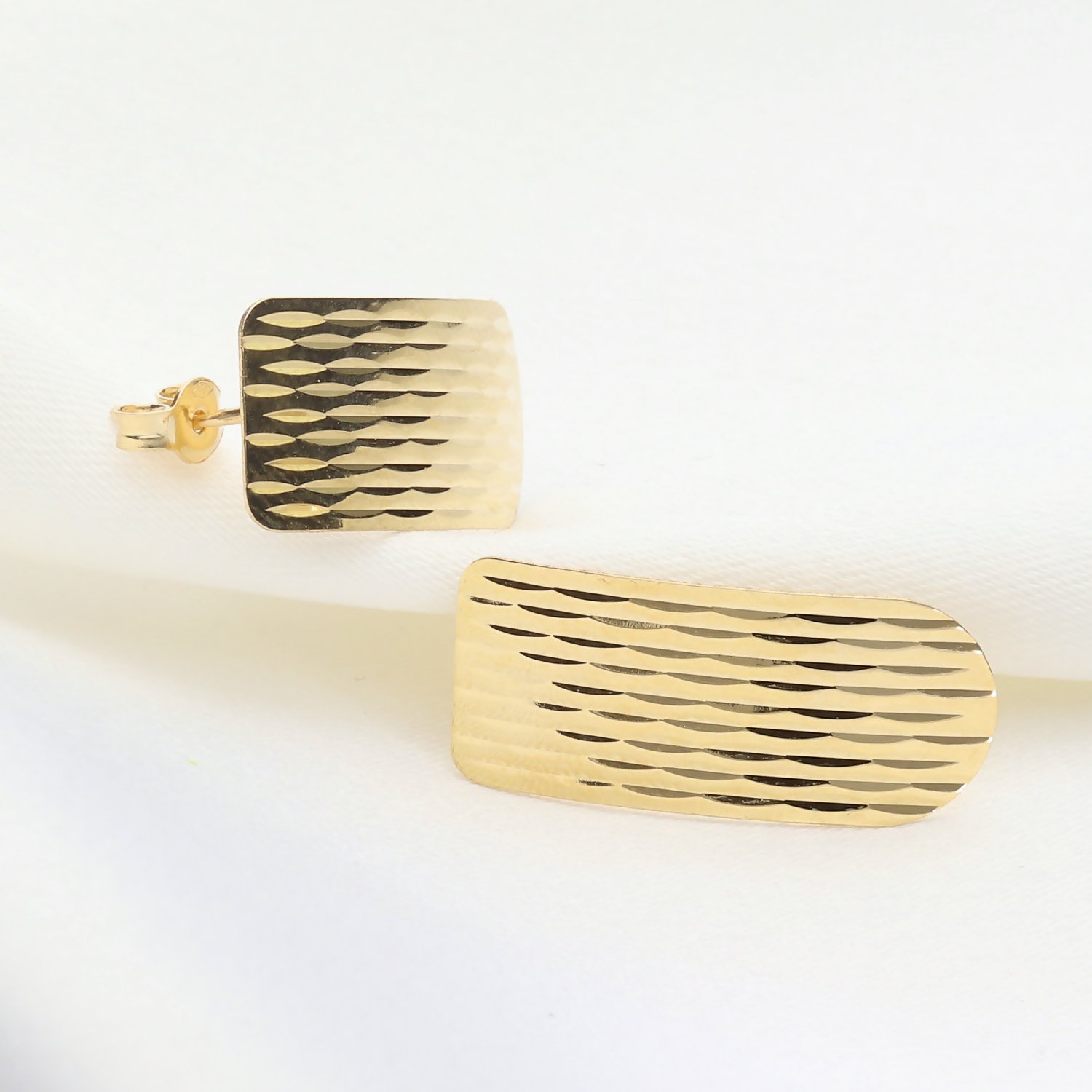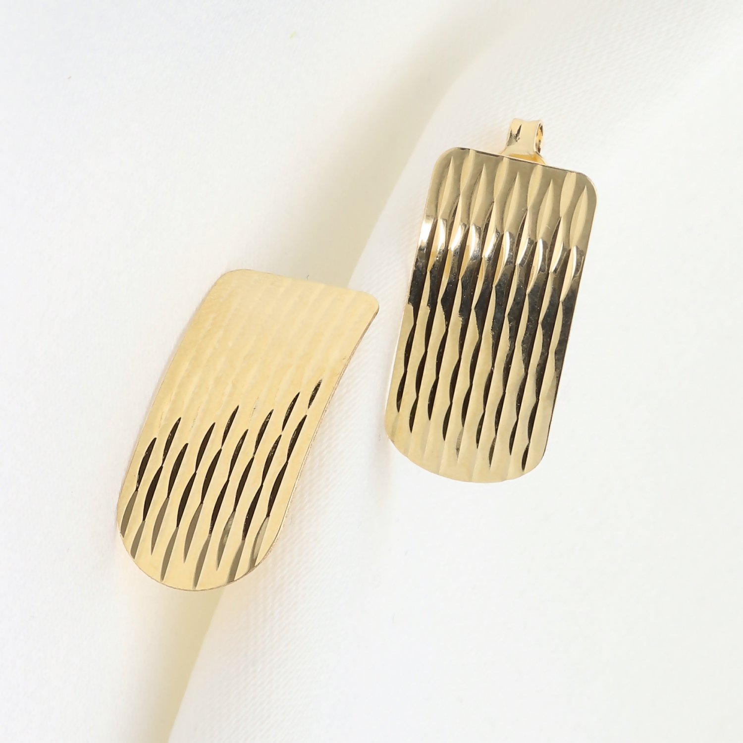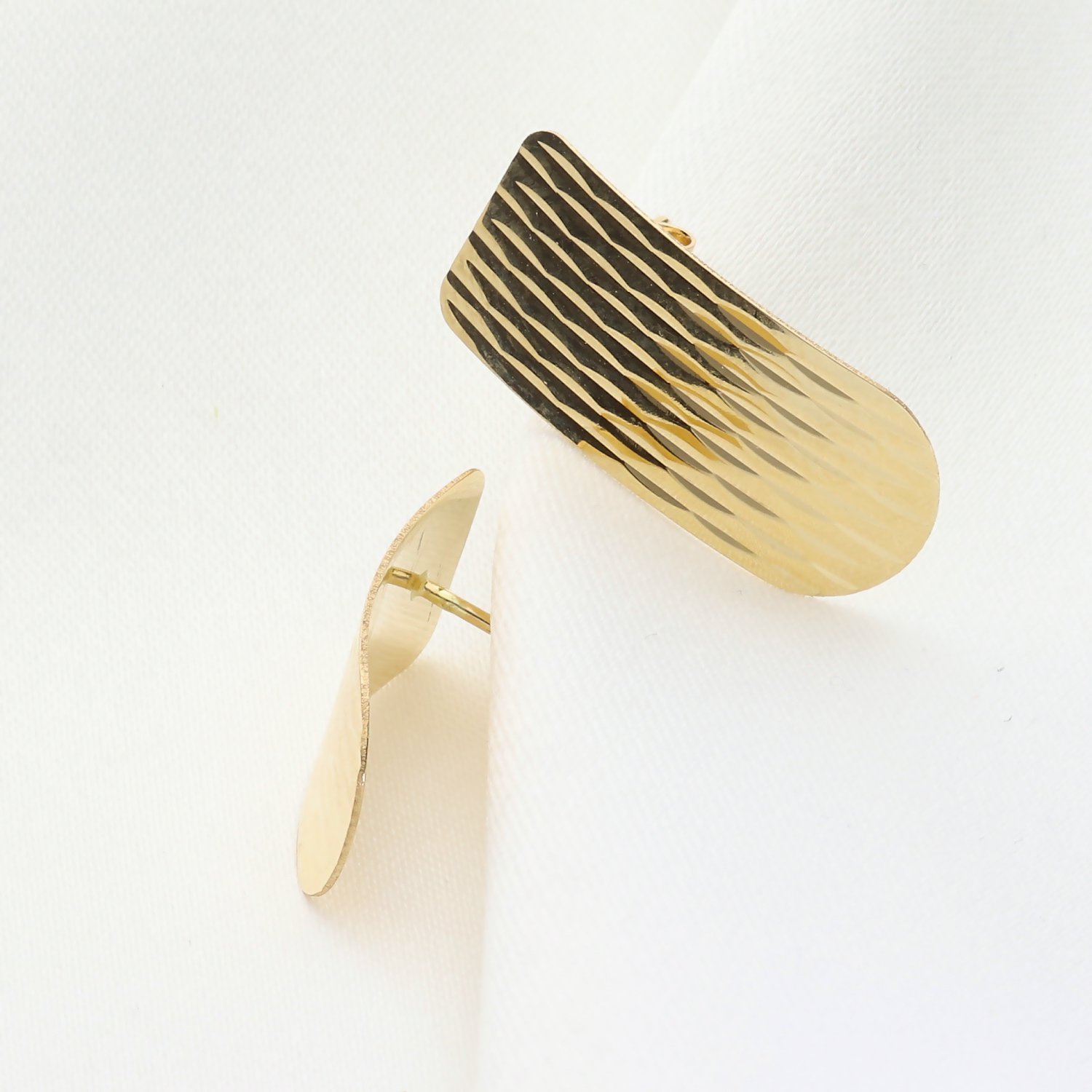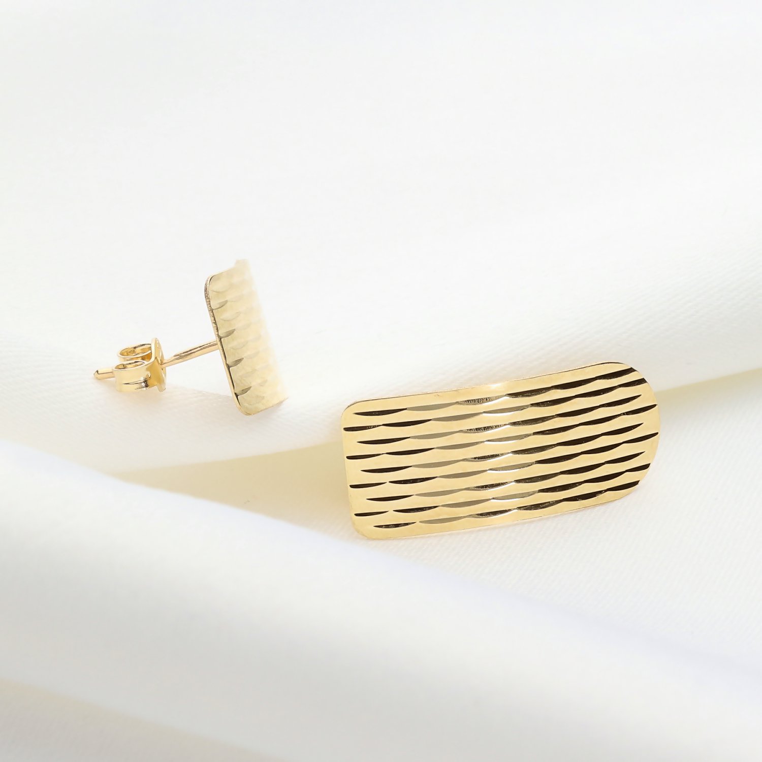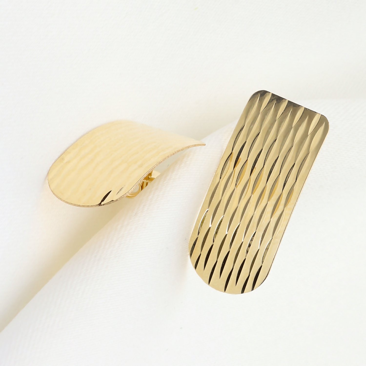 ​Kolczyki wyróżniają się długim, prostokątnym/owalnym kształtem, którego powierzchnia została ozdobiona efektem trójwymiarowych, nieregularnych fal lub pionowych nacięć. Tekstura ta pięknie odbija światło, nadając biżuterii dynamiczny i luksusowy charakter. Lekkie wygięcie kolczyków sprawia, że idealnie układają się w uchu, tworząc efektowny i jednocześnie subtelny akcent.