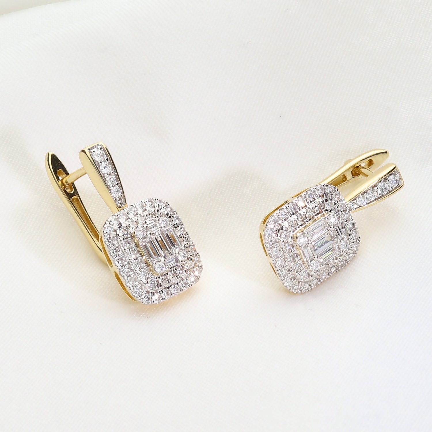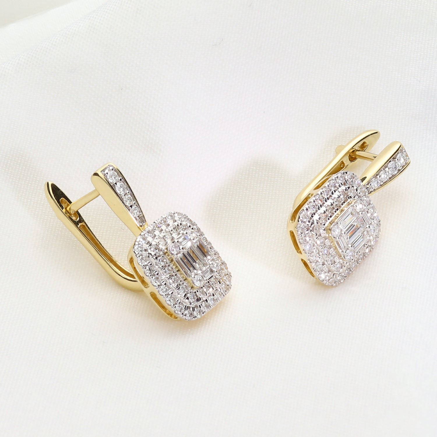 Luksusowe Złote Kolczyki z Diamentami – Kwadratowe Halo z Bagietami