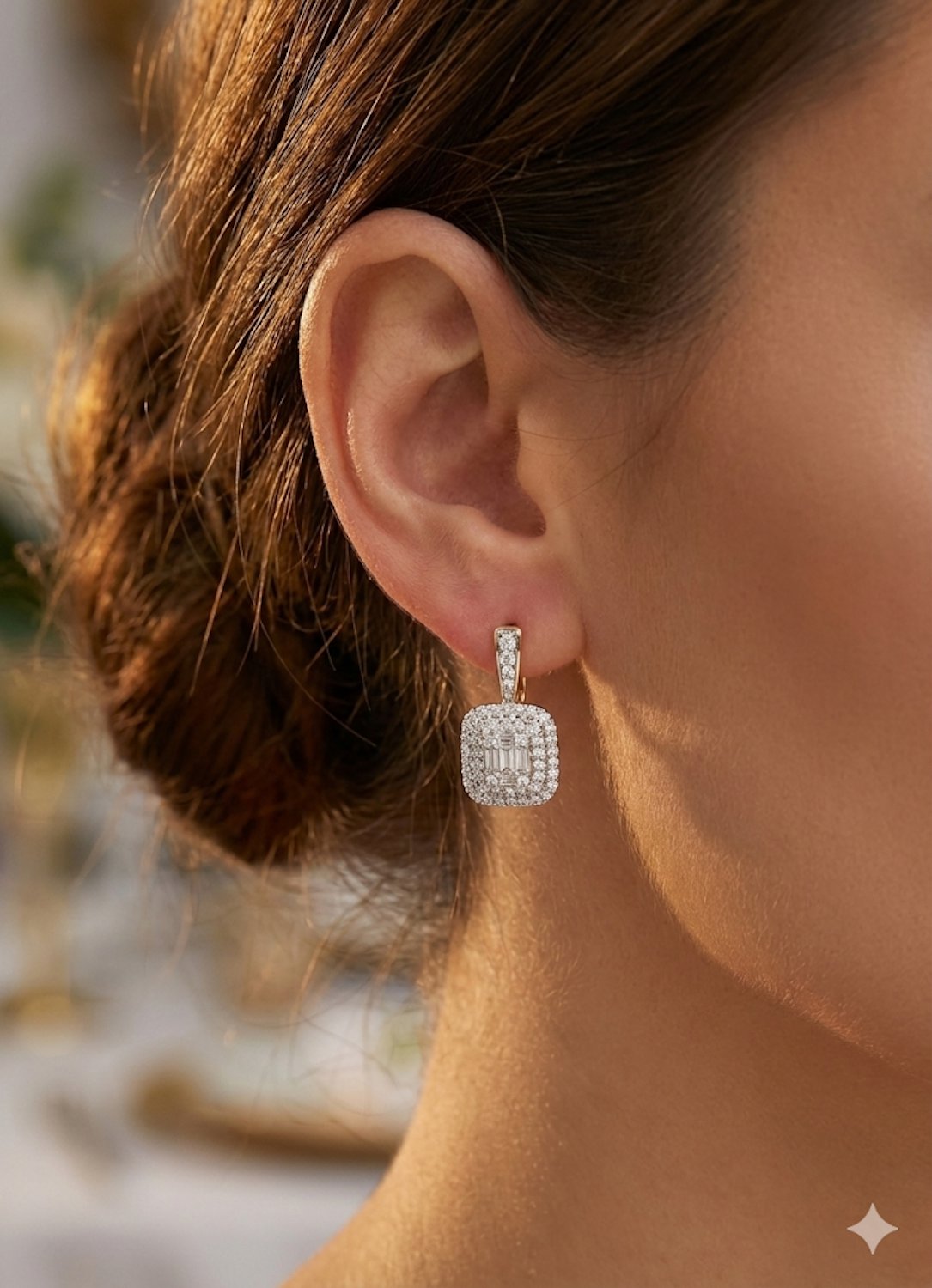 Centralnym punktem każdego kolczyka jest misterna kompozycja diamentów w szlifie bagietowym (prostokątnym), które tworzą taflę przypominającą jeden duży kamień szlachetny. Ten "iluzoryczny" środek został otoczony podwójną aureolą (double halo) drobniejszych diamentów w klasycznym szlifie brylantowym. Taka konstrukcja optycznie powiększa kolczyki i sprawia, że łapią światło pod każdym kątem, iskrząc się przy każdym ruchu głowy.