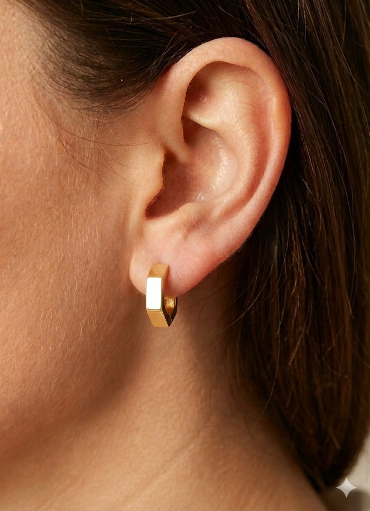 ​Te wyjątkowe kolczyki to kwintesencja nowoczesnego minimalizmu. Klasyczne koła zostały zastąpione wyrazistym, sześciokątnym kształtem (heksagon), który nadaje biżuterii unikalnego, architektonicznego charakteru.