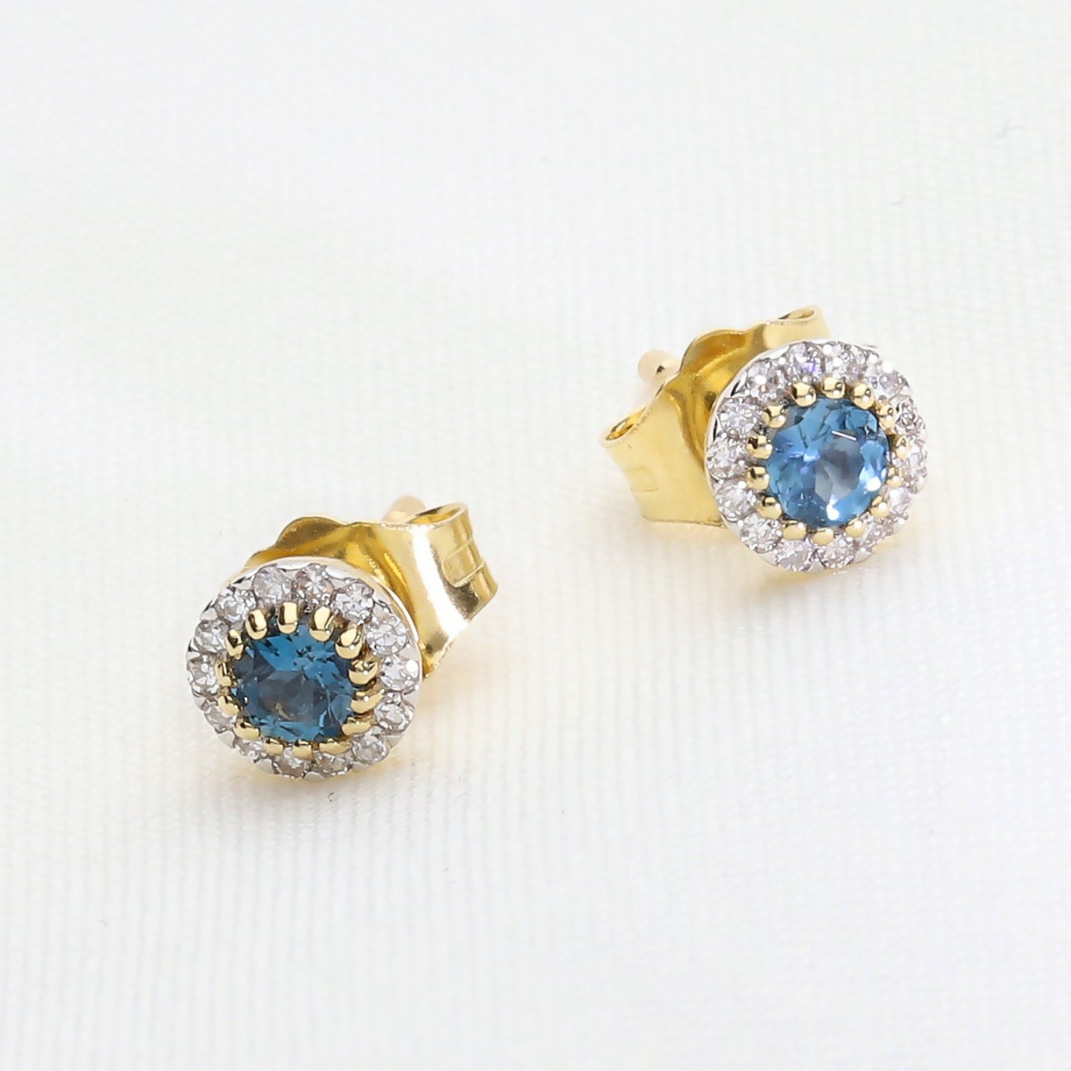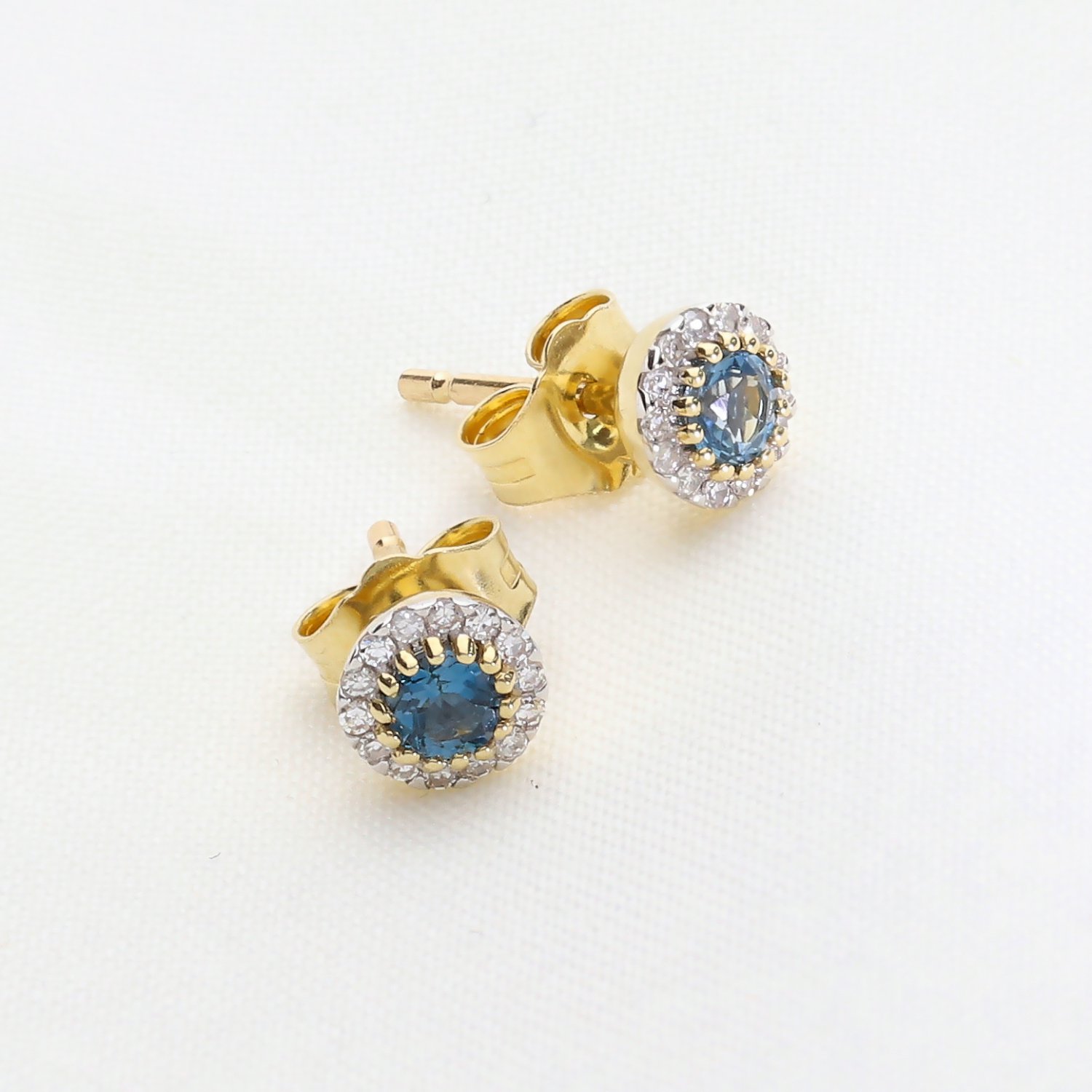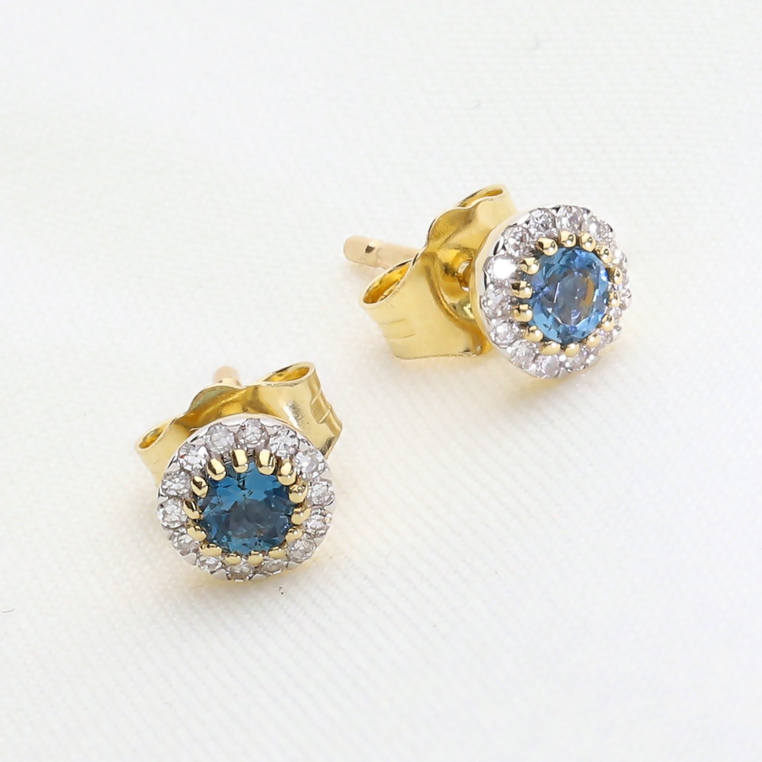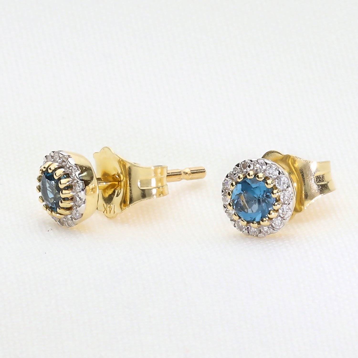 Eleganckie złote kolczyki sztyfty z topazami London Blue i brylantami