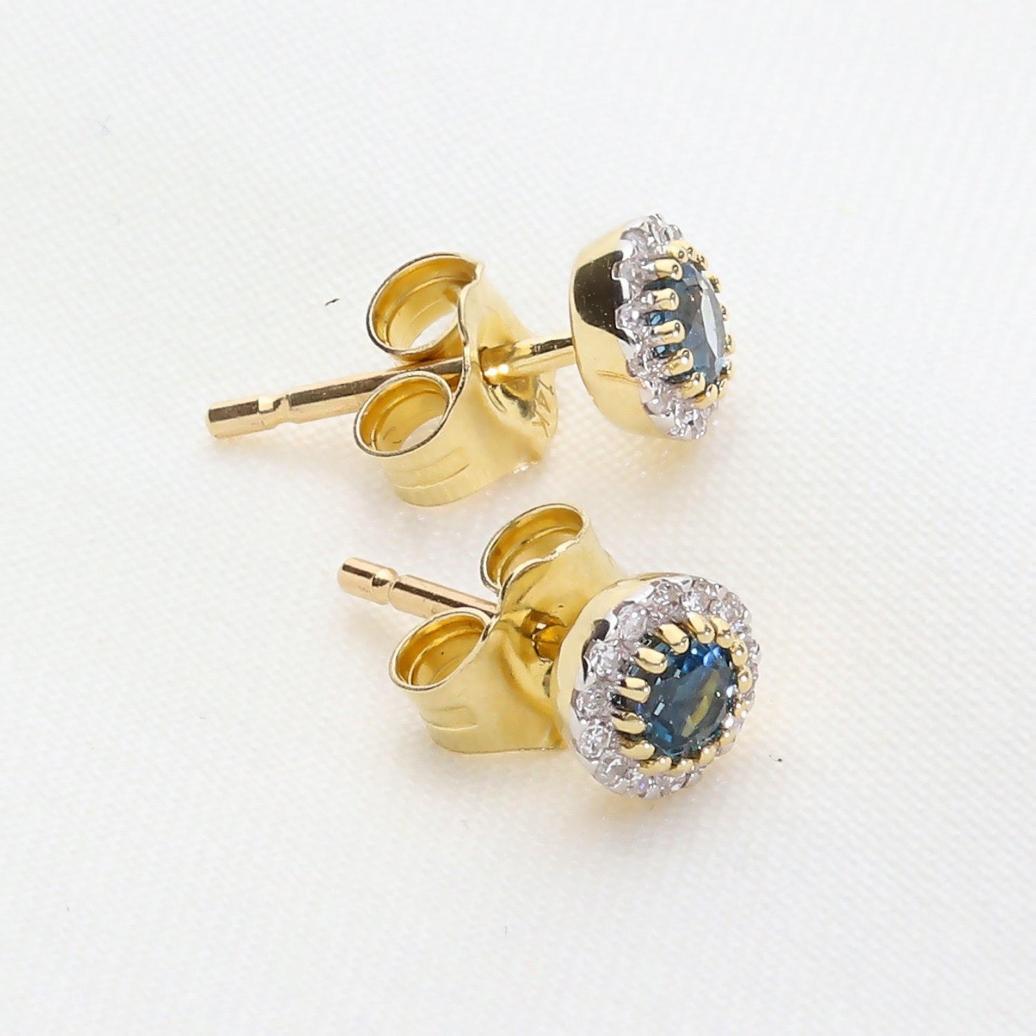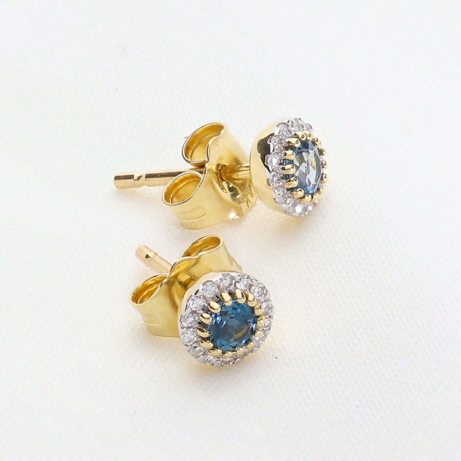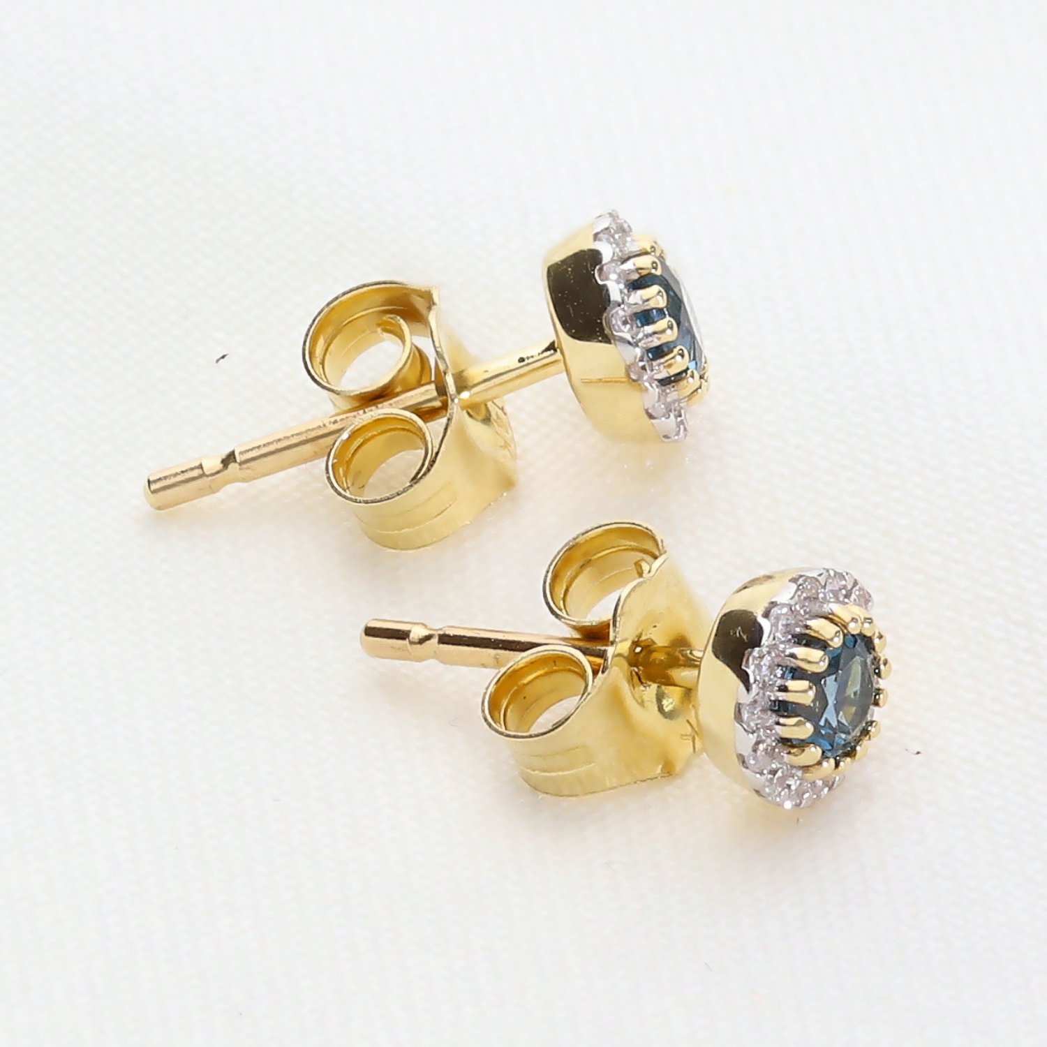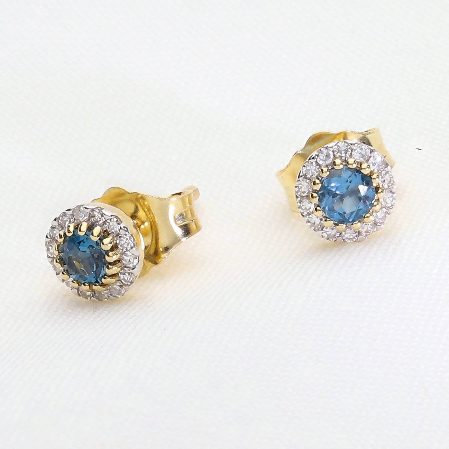 Eleganckie złote kolczyki sztyfty z topazami London Blue i brylantami