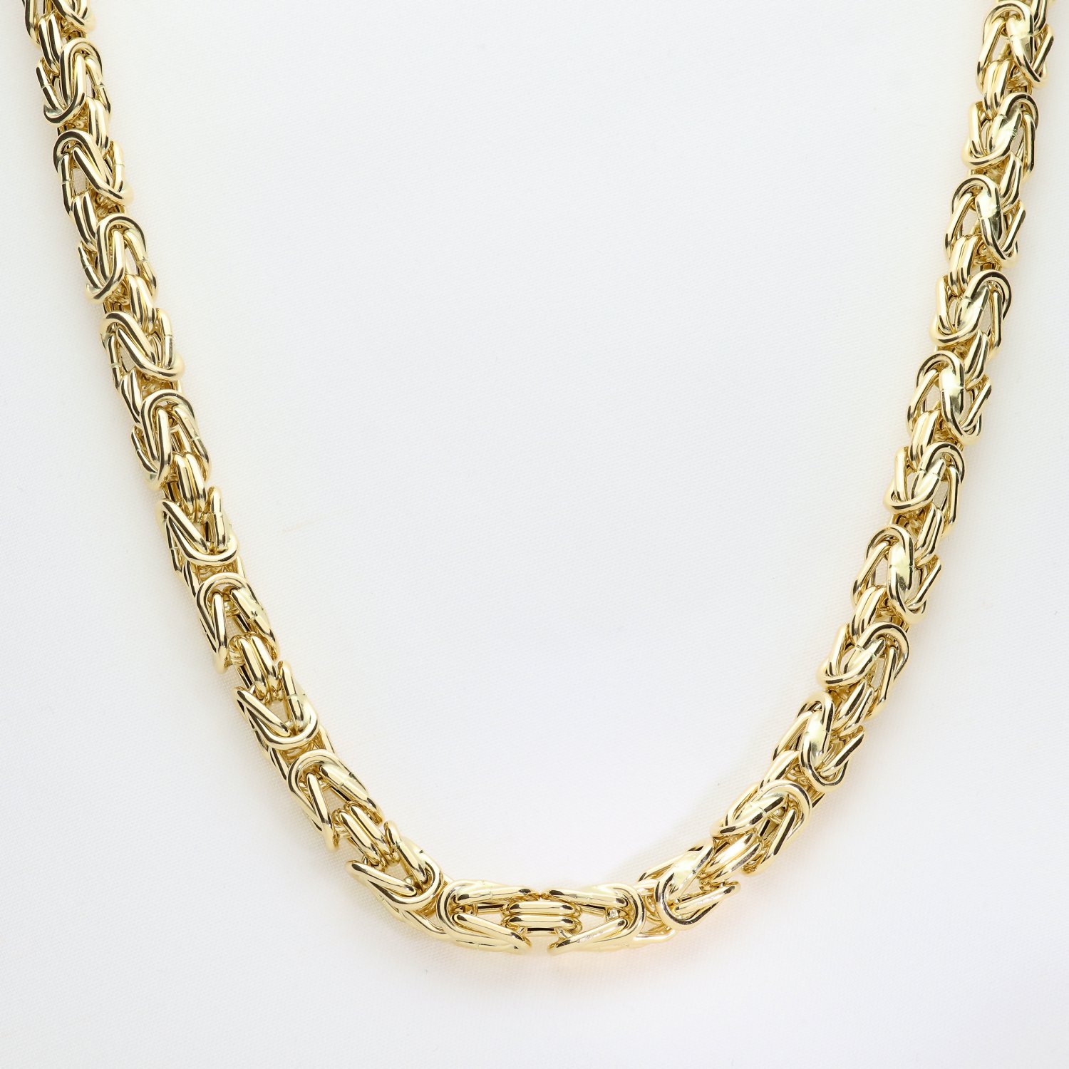 To wyjątkowy, złoty naszyjnik, który od razu przyciąga wzrok swoim majestatycznym splotem królewskim (zwanym również bizantyjskim). Jego skomplikowana i misternie wykonana struktura to symbol luksusu i rzemieślniczej precyzji. Każde ogniwo, splecione w unikalny wzór, tworzy gęstą, a zarazem płynną i komfortową w noszeniu całość.