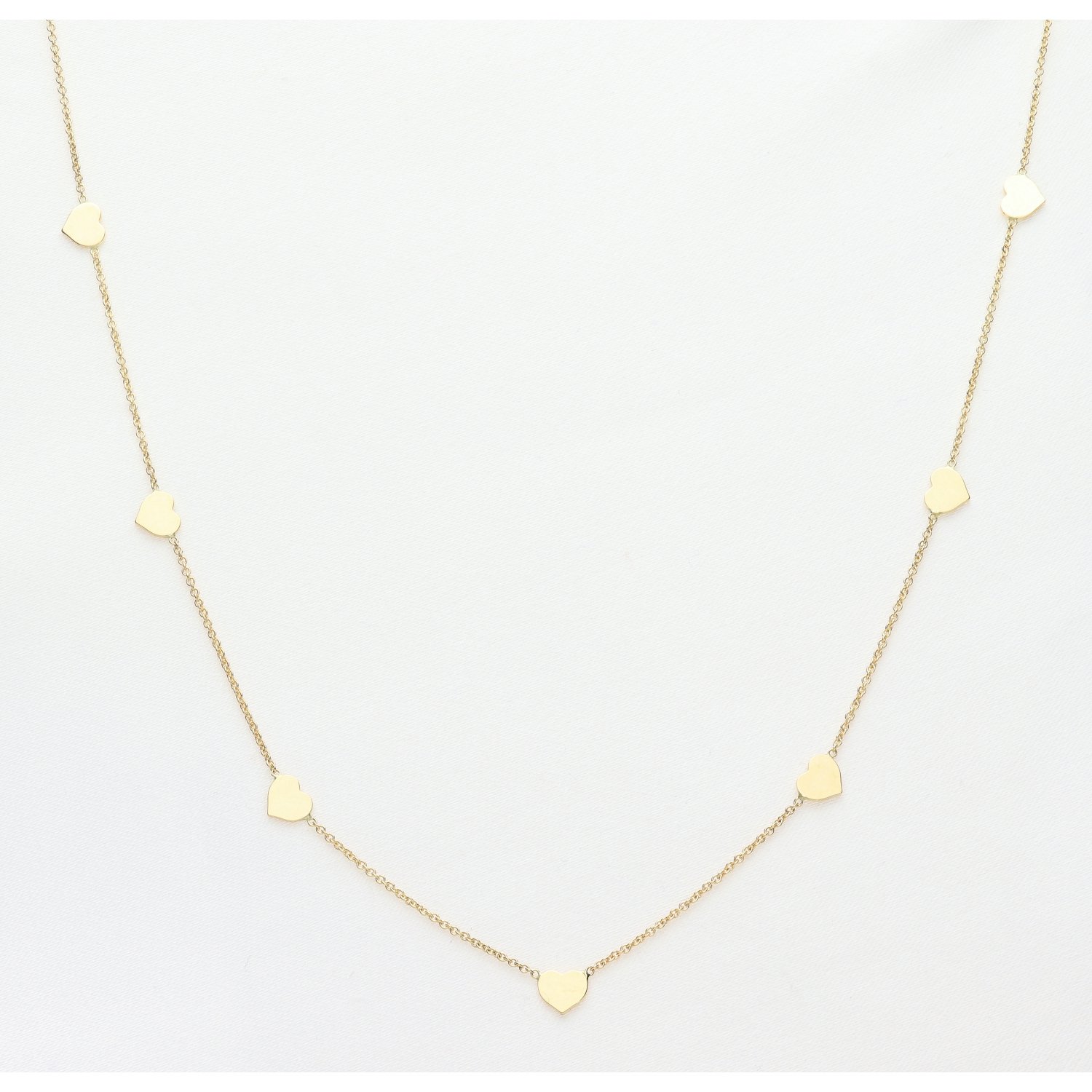 Delikatny złoty naszyjnik wykonany z wysokiej jakości złota. Ozdobiony subtelnymi zawieszkami w kształcie serduszek, równomiernie rozmieszczonymi na cienkim łańcuszku. Jego minimalistyczny design sprawia, że doskonale komponuje się zarówno z codziennymi stylizacjami, jak i eleganckimi kreacjami. To ponadczasowa biżuteria, która podkreśla kobiecość i dodaje blasku w każdej sytuacji.