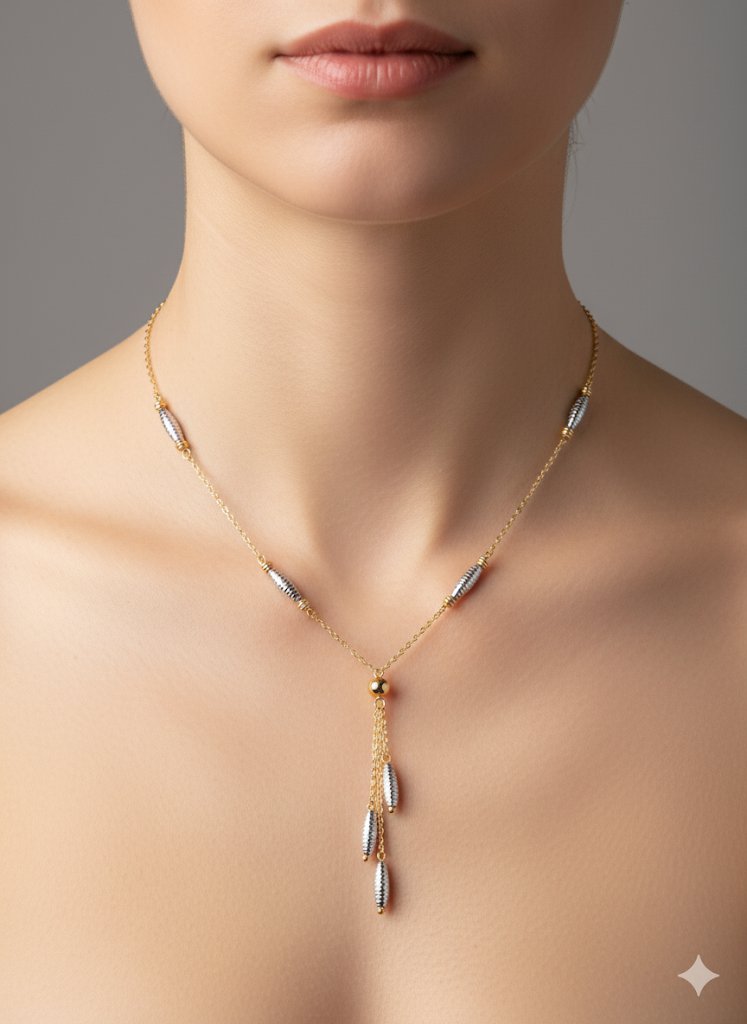​Centralnym punktem naszyjnika jest ozdobny krawat/y-kształtna zawieszka typu "Lariat". Składa się ona z małej, polerowanej kuleczki, od której swobodnie zwisają trzy łańcuszki o różnej długości, zakończone identycznymi dwukolorowymi, diamentowanymi koralikami. To asymetryczne zakończenie dodaje naszyjnikowi dynamiki i współczesnego charakteru.