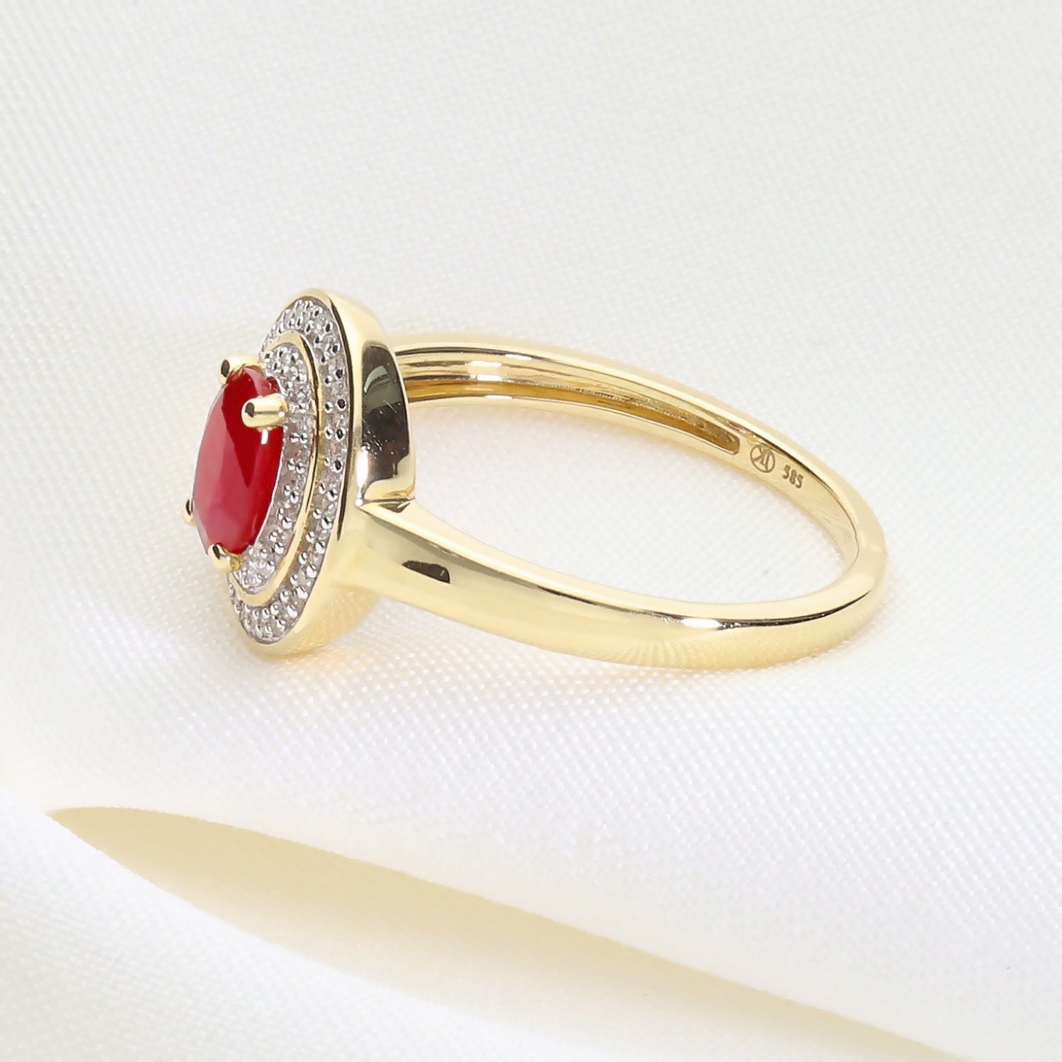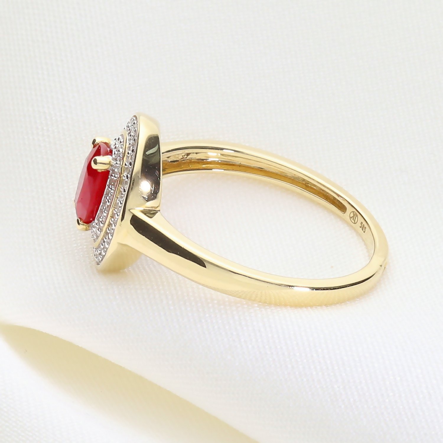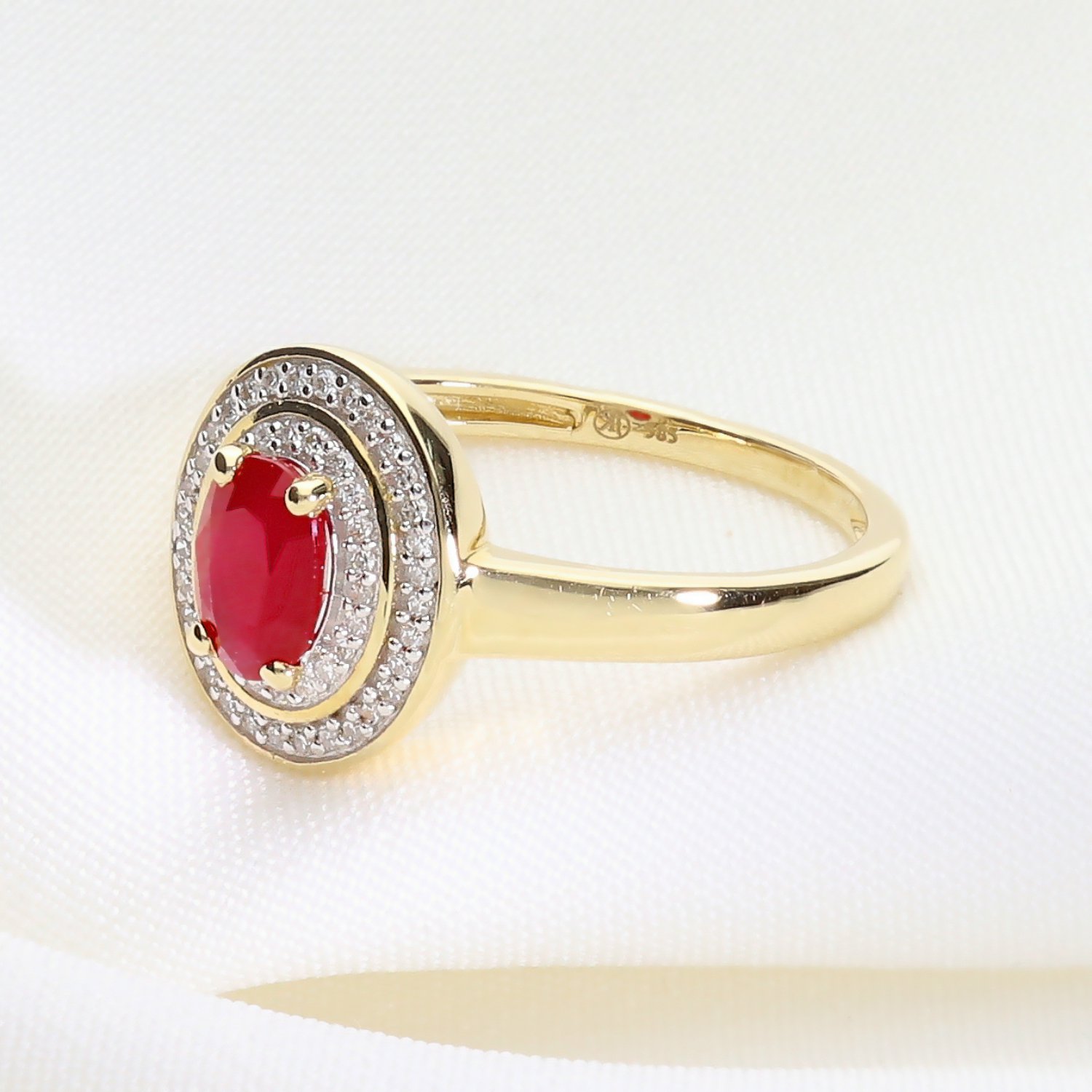 Odkryj niezwykły złoty pierścionek z rubinem i brylantami, który zachwyca elegancją i blaskiem. Centralny rubin o intensywnej czerwonej barwie symbolizuje miłość, pasję i siłę, a otaczające go brylanty nadają całości wyjątkowego, luksusowego charakteru. Pierścionek został wykonany z żółtego złota próby 585, co gwarantuje trwałość i ponadczasowy wygląd.