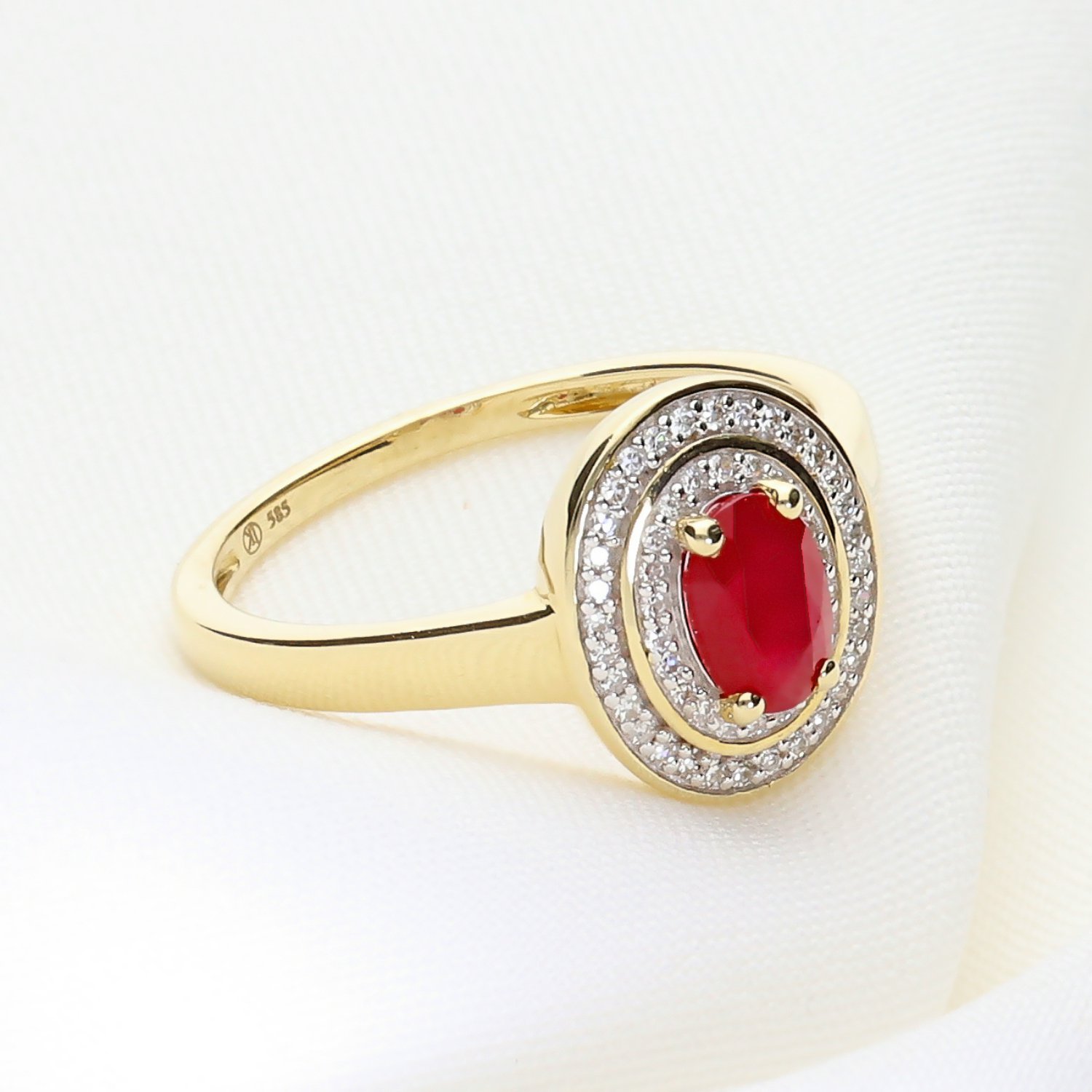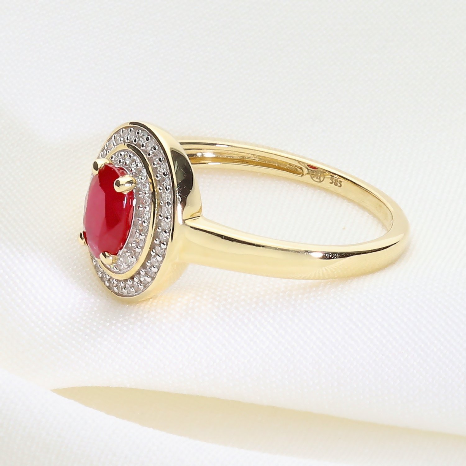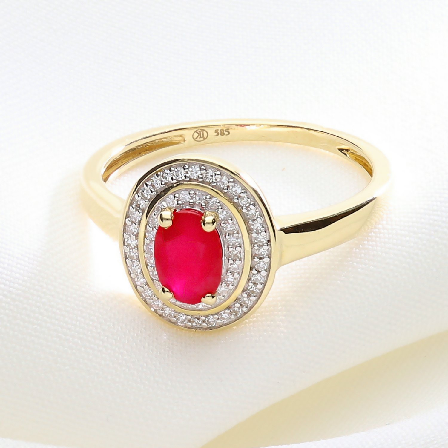 Odkryj niezwykły złoty pierścionek z rubinem i brylantami, który zachwyca elegancją i blaskiem. Centralny rubin o intensywnej czerwonej barwie symbolizuje miłość, pasję i siłę, a otaczające go brylanty nadają całości wyjątkowego, luksusowego charakteru. Pierścionek został wykonany z żółtego złota próby 585, co gwarantuje trwałość i ponadczasowy wygląd.