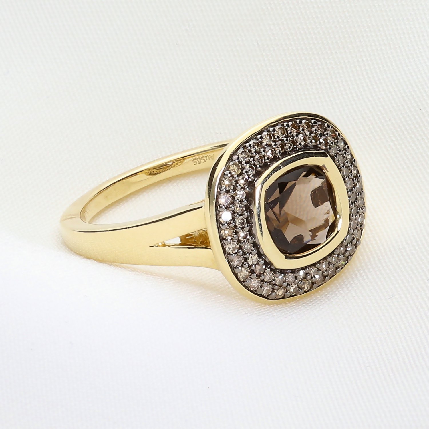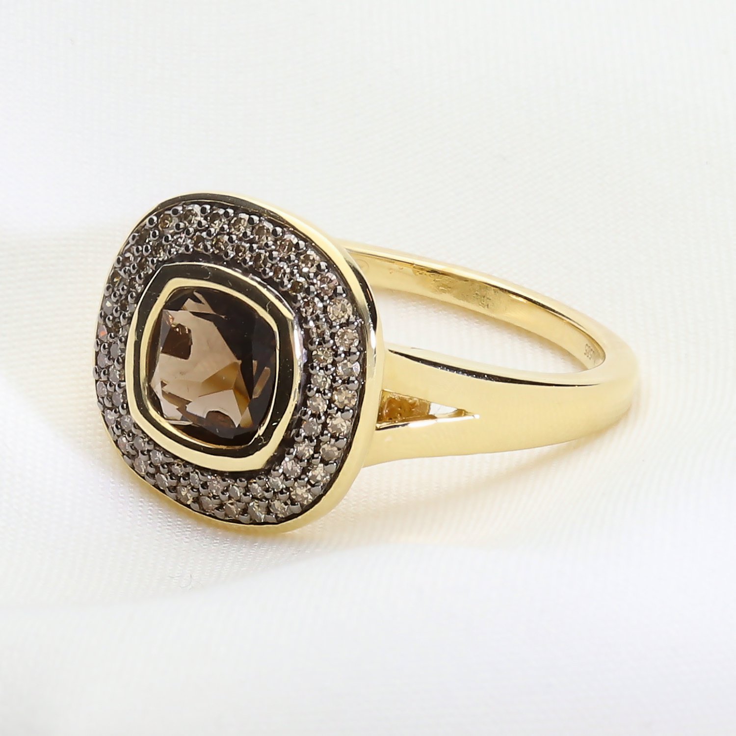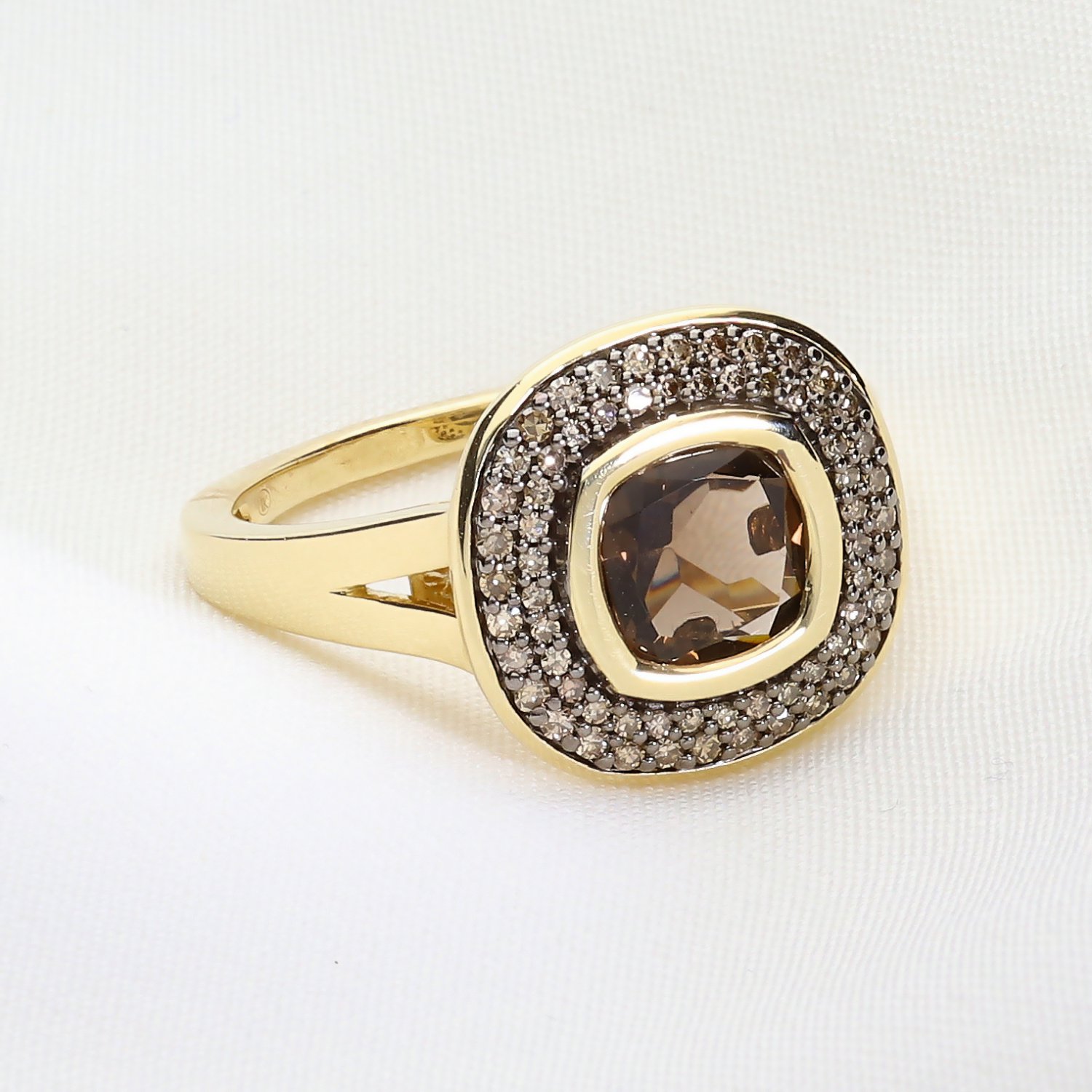 ​Centralnym elementem pierścionka jest duży, poduszkowy (ang. cushion) kwarc dymny o fascynującej, brązowej barwie. Ten kamień jest otoczony podwójnym, lśniącym halo z mniejszych kamieni. Zewnętrzny wieniec tworzą liczne, drobne brylanty (lub diamenty o barwie champagne/brązowej, co nadaje całości ciepłego, monochromatycznego blasku).
