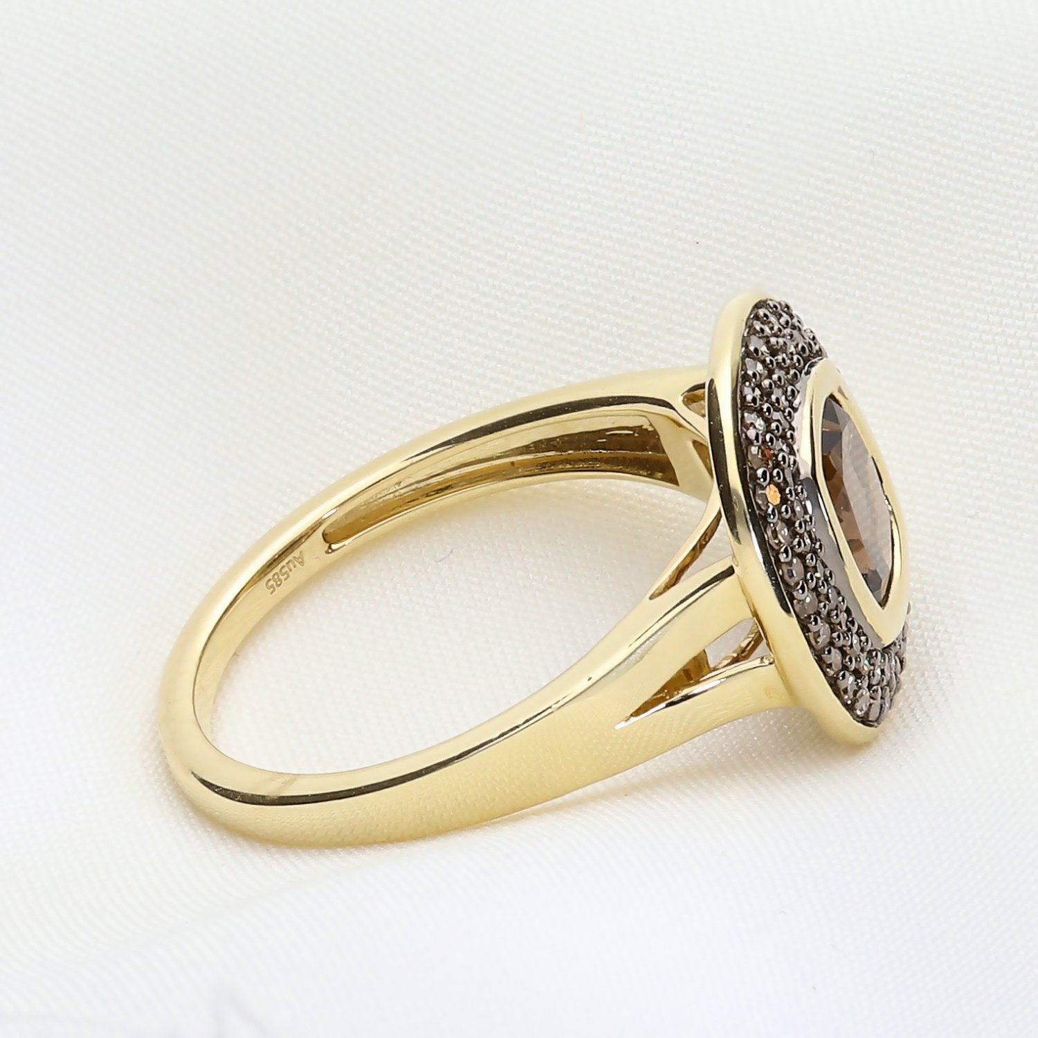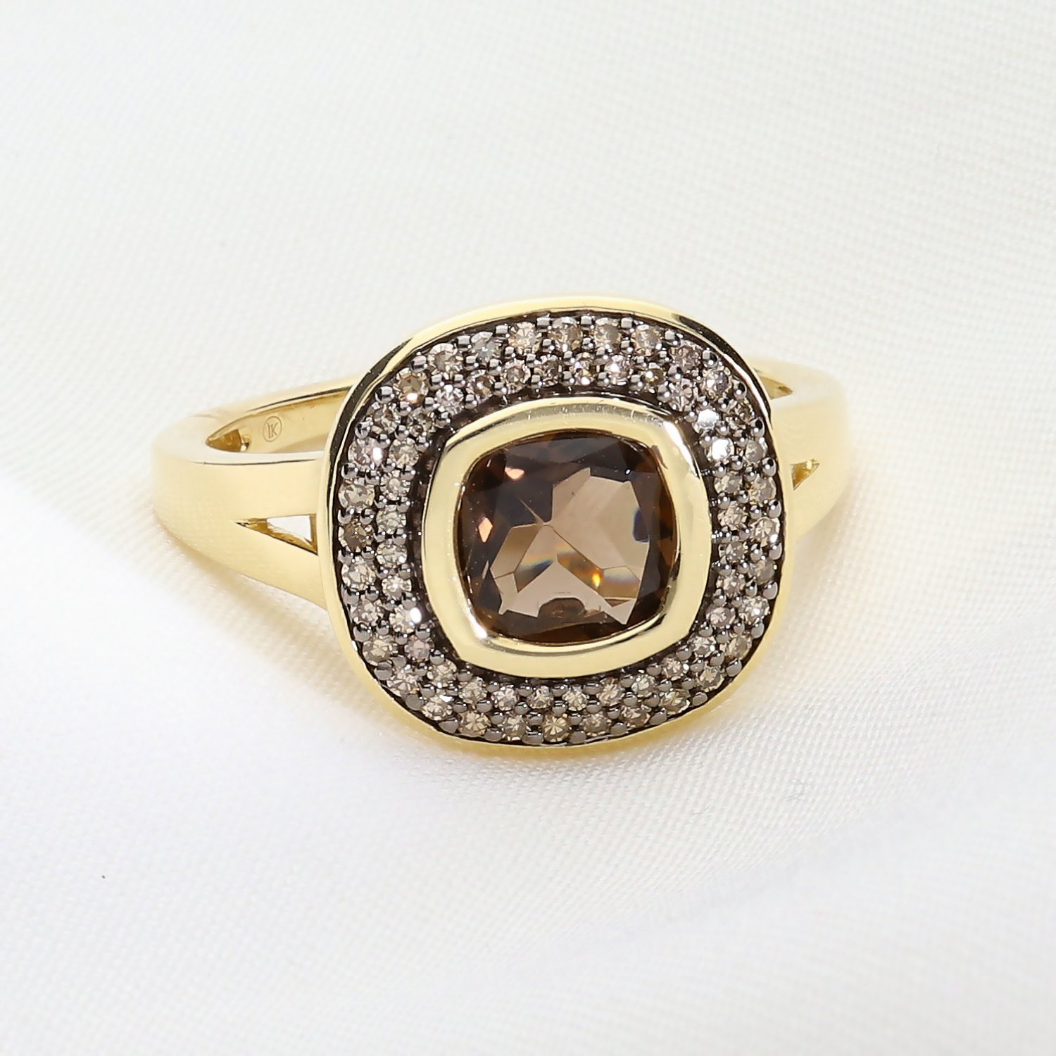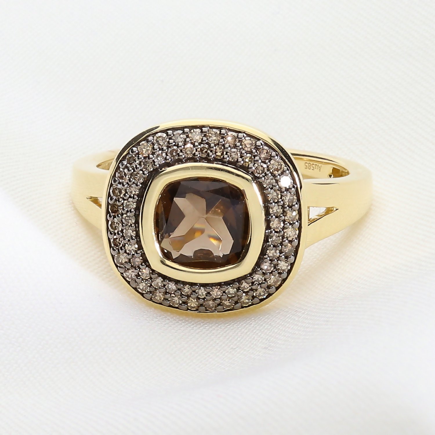 ​Centralnym elementem pierścionka jest duży, poduszkowy (ang. cushion) kwarc dymny o fascynującej, brązowej barwie. Ten kamień jest otoczony podwójnym, lśniącym halo z mniejszych kamieni. Zewnętrzny wieniec tworzą liczne, drobne brylanty (lub diamenty o barwie champagne/brązowej, co nadaje całości ciepłego, monochromatycznego blasku).