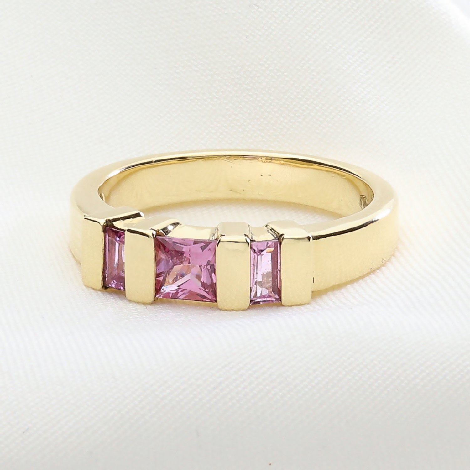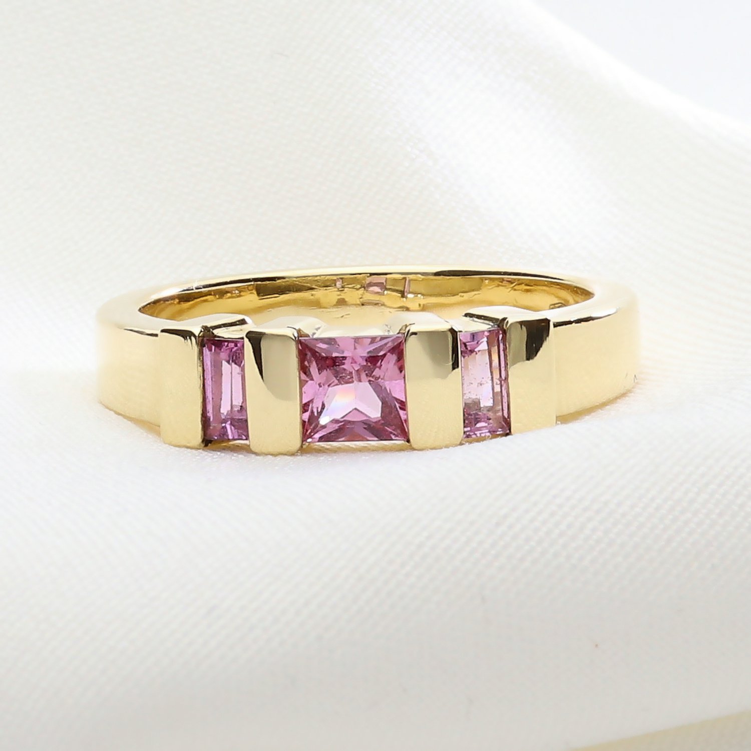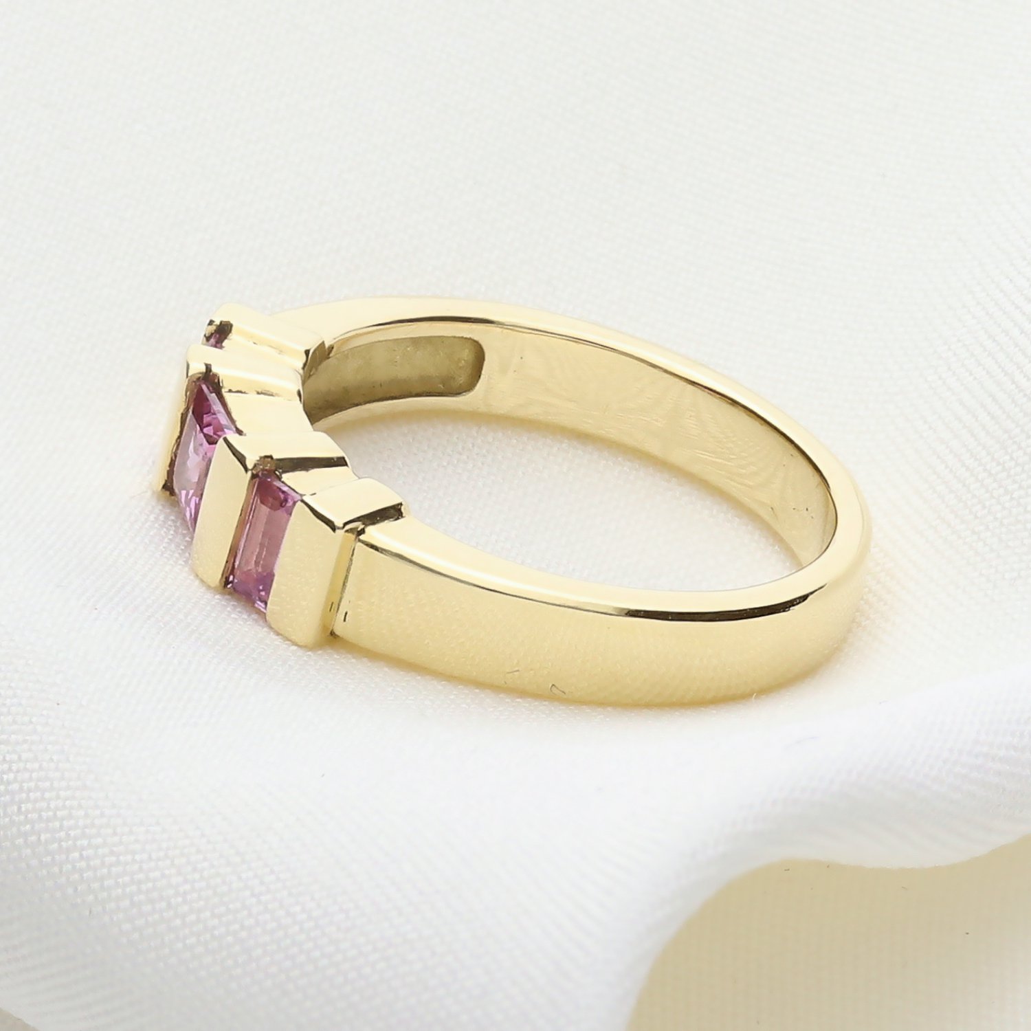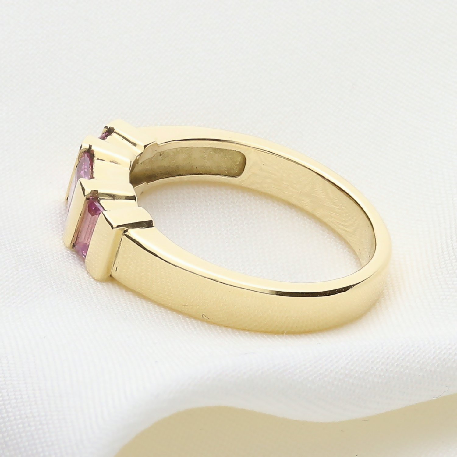 Złoty pierścionek z różowymi szafirami to elegancka biżuteria, która łączy klasykę z nowoczesnym stylem. Wykonany z najwyższej jakości złota, zachwyca harmonijnym połączeniem blasku metalu i subtelnego różowego odcienia kamieni. Trzy prostokątne szafiry w geometrycznej oprawie nadają całości wyjątkowego charakteru – symbolizują delikatność, miłość i kobiecość.