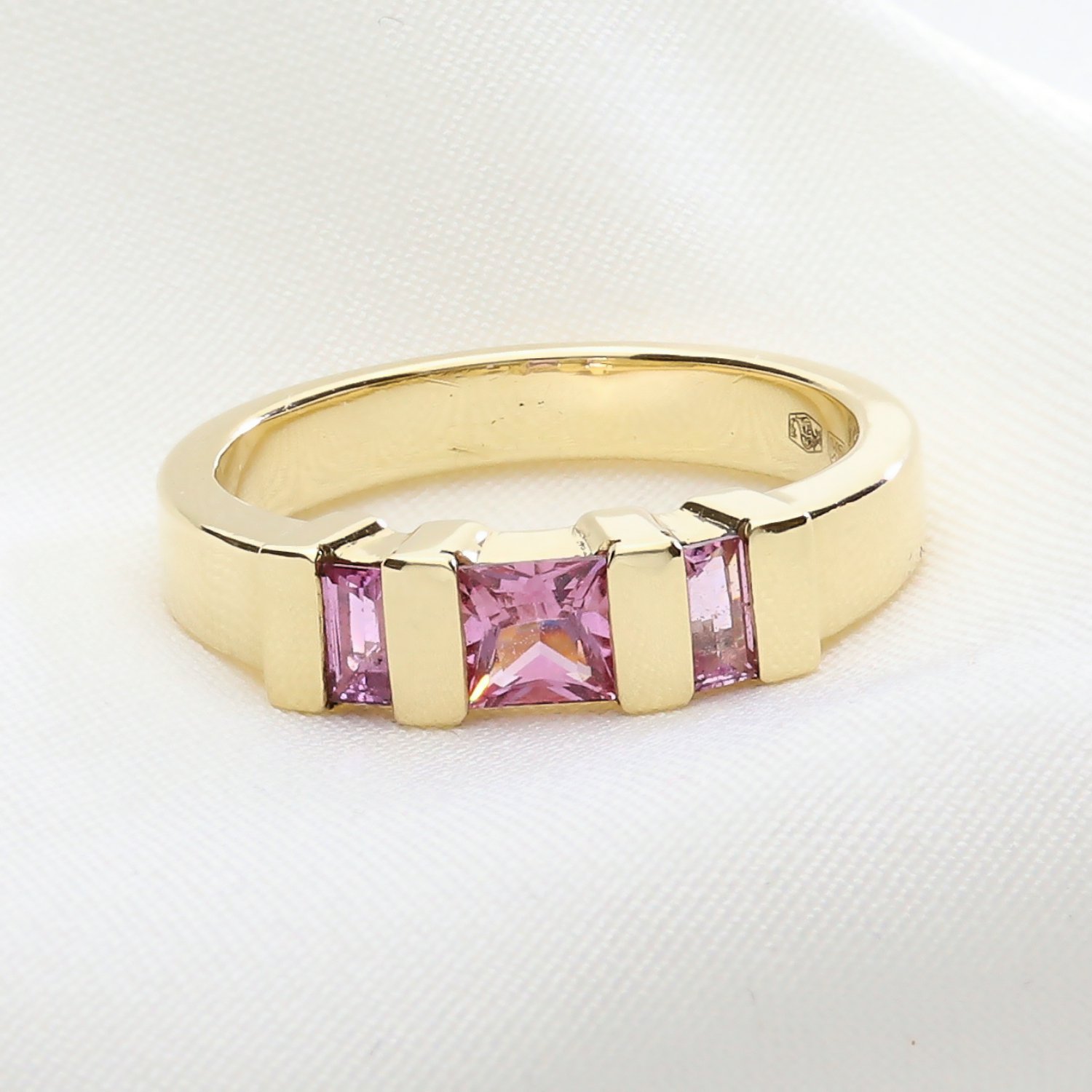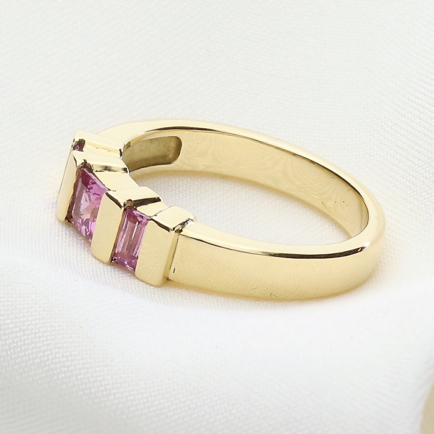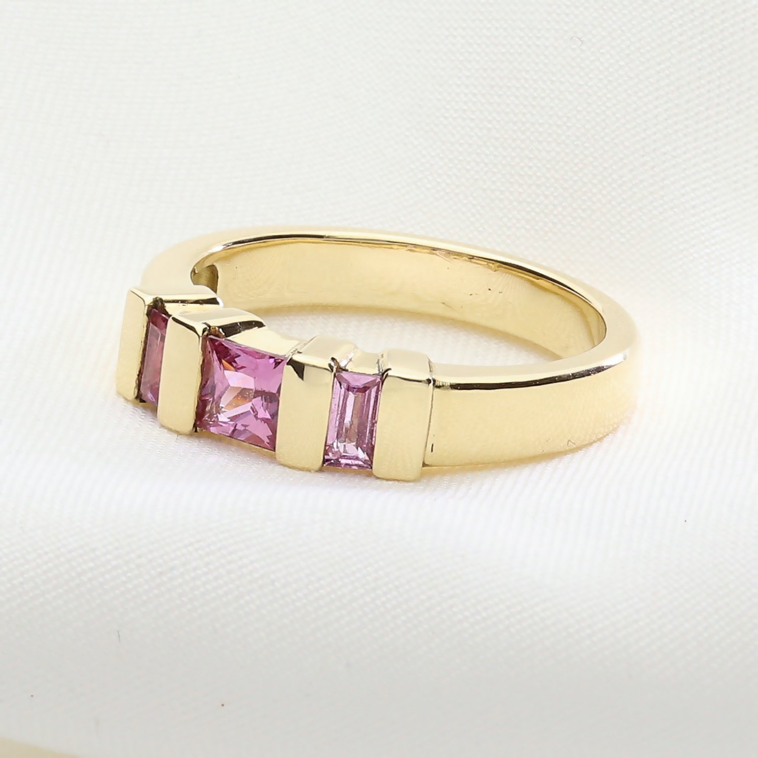 Złoty pierścionek z różowymi szafirami to elegancka biżuteria, która łączy klasykę z nowoczesnym stylem. Wykonany z najwyższej jakości złota, zachwyca harmonijnym połączeniem blasku metalu i subtelnego różowego odcienia kamieni. Trzy prostokątne szafiry w geometrycznej oprawie nadają całości wyjątkowego charakteru – symbolizują delikatność, miłość i kobiecość.