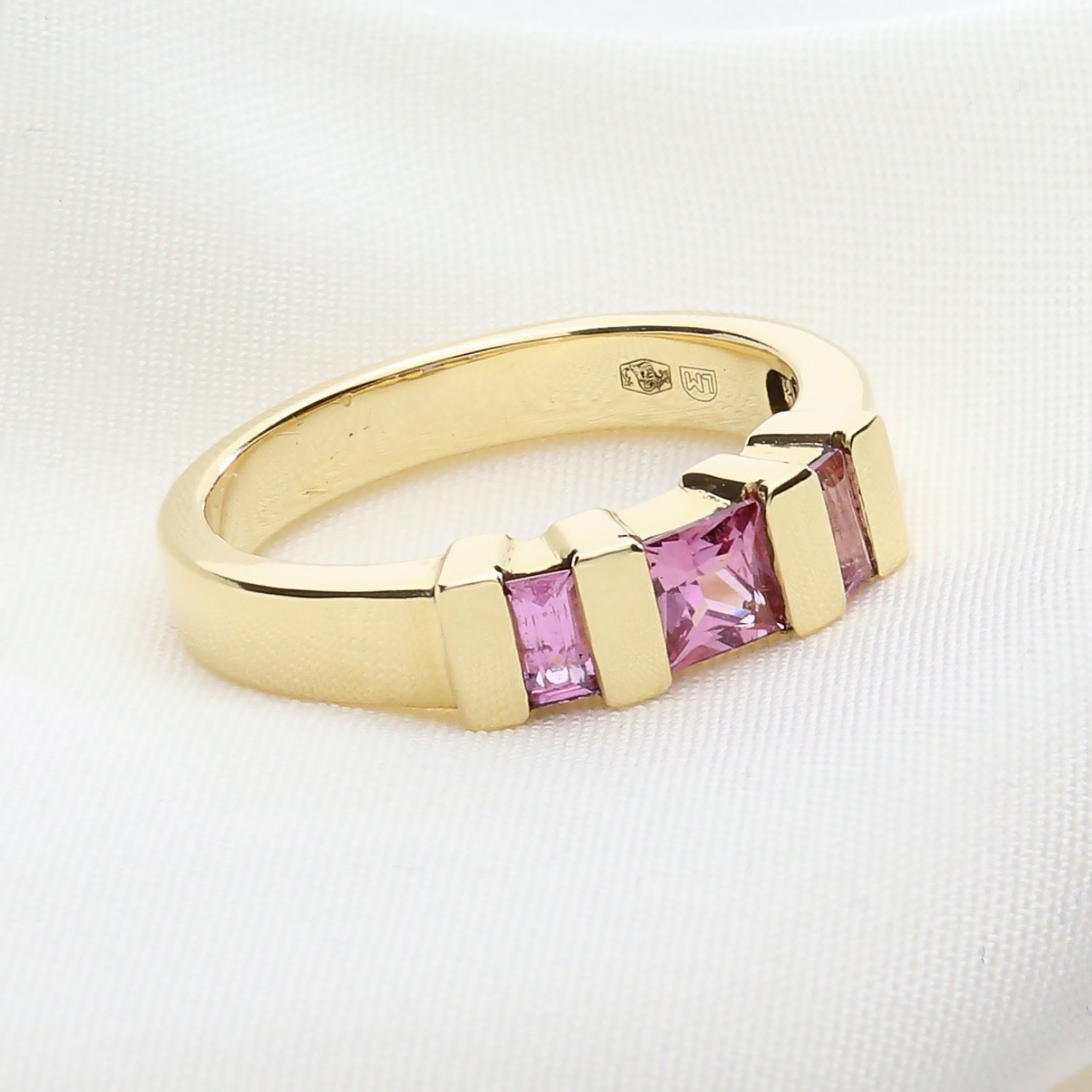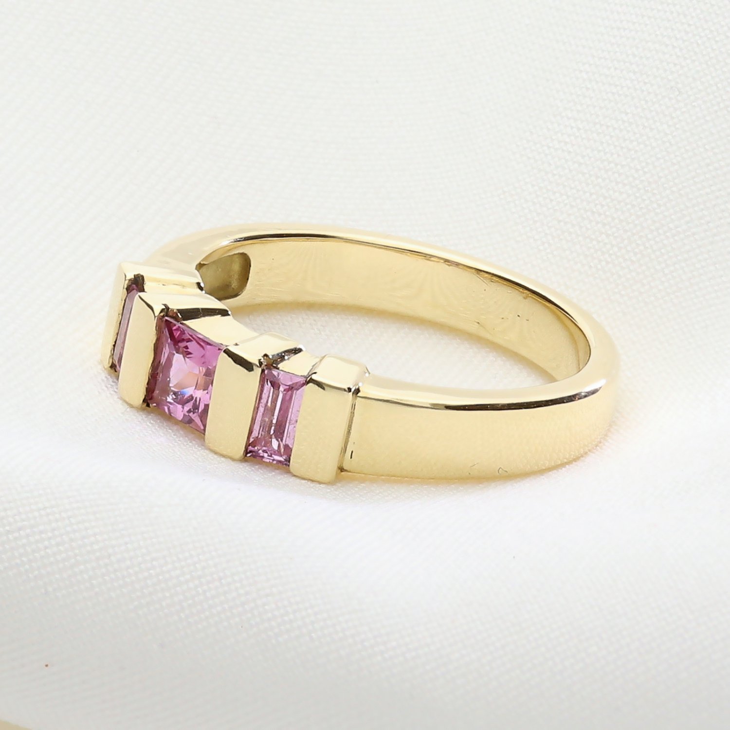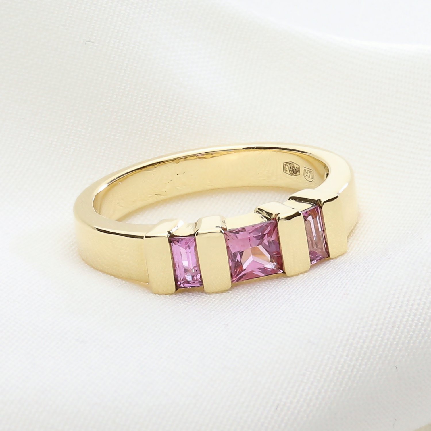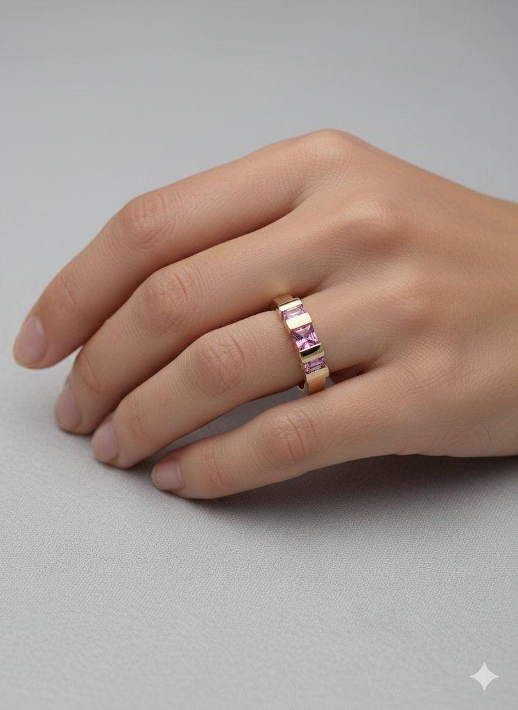 Złoty pierścionek z różowymi szafirami to elegancka biżuteria, która łączy klasykę z nowoczesnym stylem. Wykonany z najwyższej jakości złota, zachwyca harmonijnym połączeniem blasku metalu i subtelnego różowego odcienia kamieni. Trzy prostokątne szafiry w geometrycznej oprawie nadają całości wyjątkowego charakteru – symbolizują delikatność, miłość i kobiecość.
