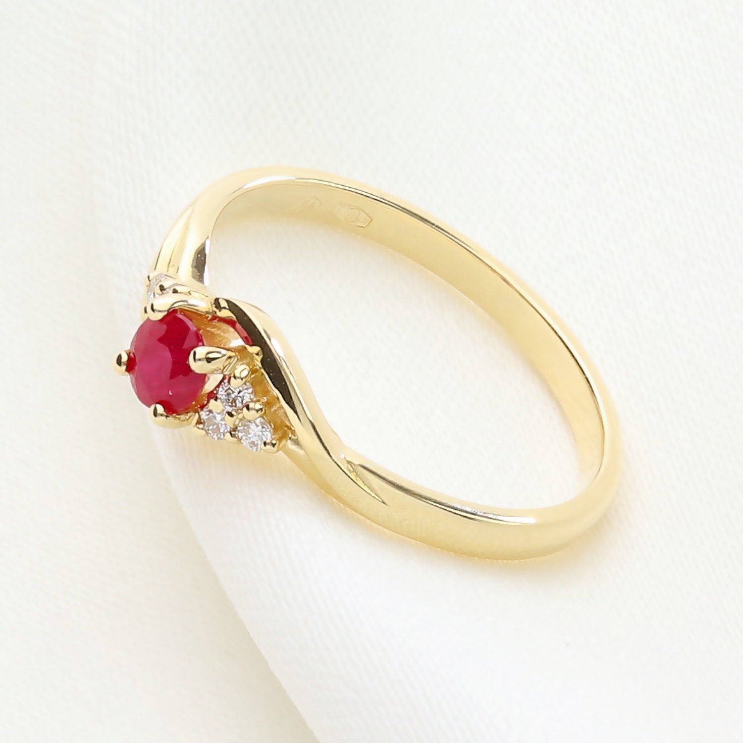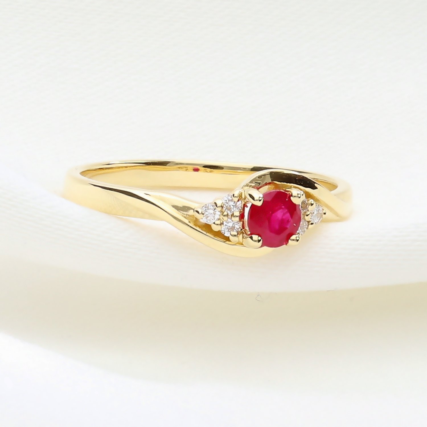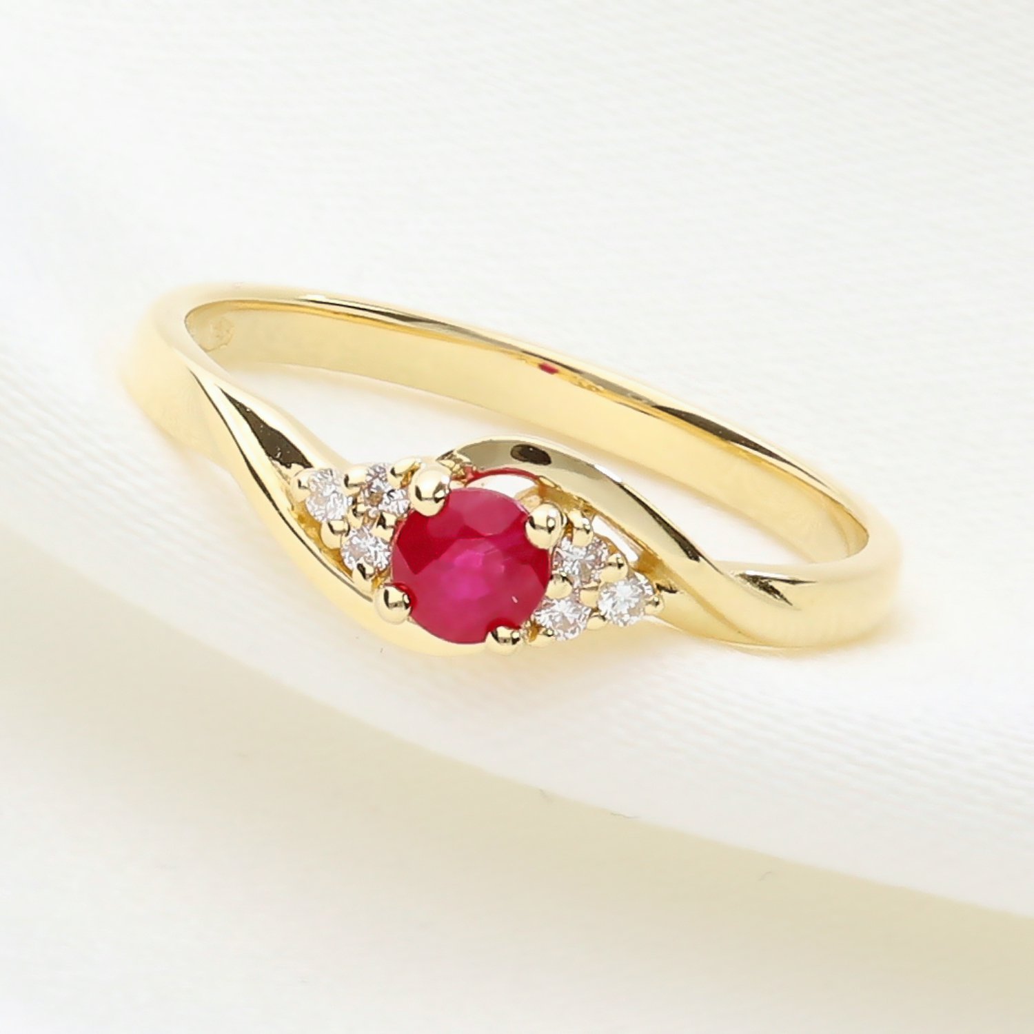 Kategoria: Pierścionki Kruszec: Złoto żółte Kamień centralny: Rubin o masie 0,29 ct. Kamień boczny: Brylanty, 6 szt. o łącznej masie 0,07 ct. Czystość: VS1-VS2 Barwa: G Próba: 585 Masa: 2,1 g.