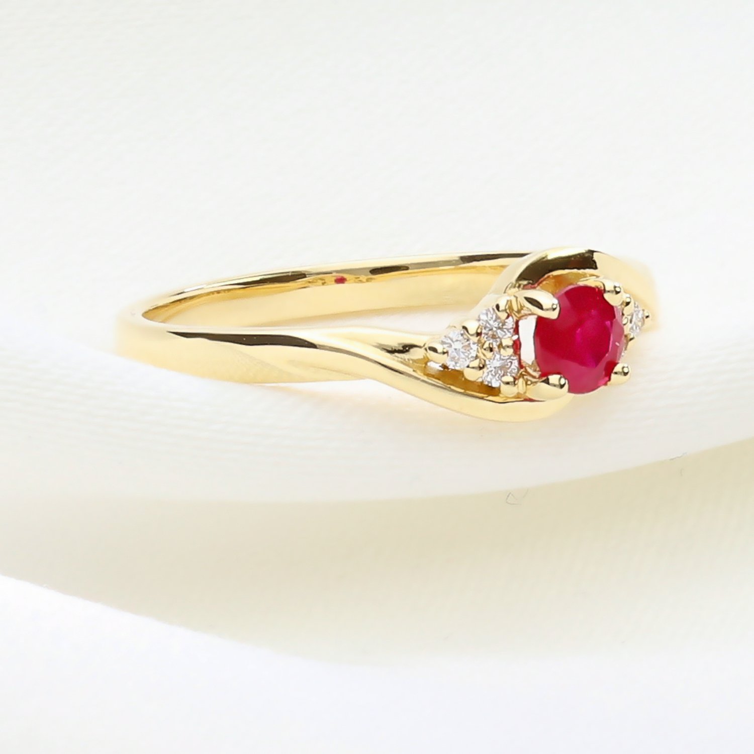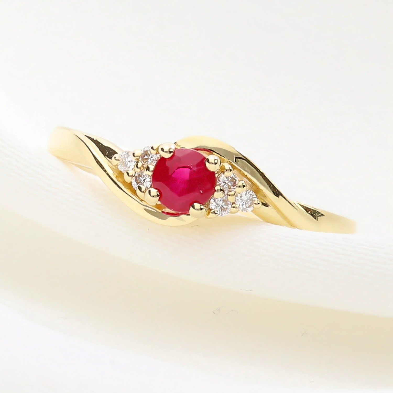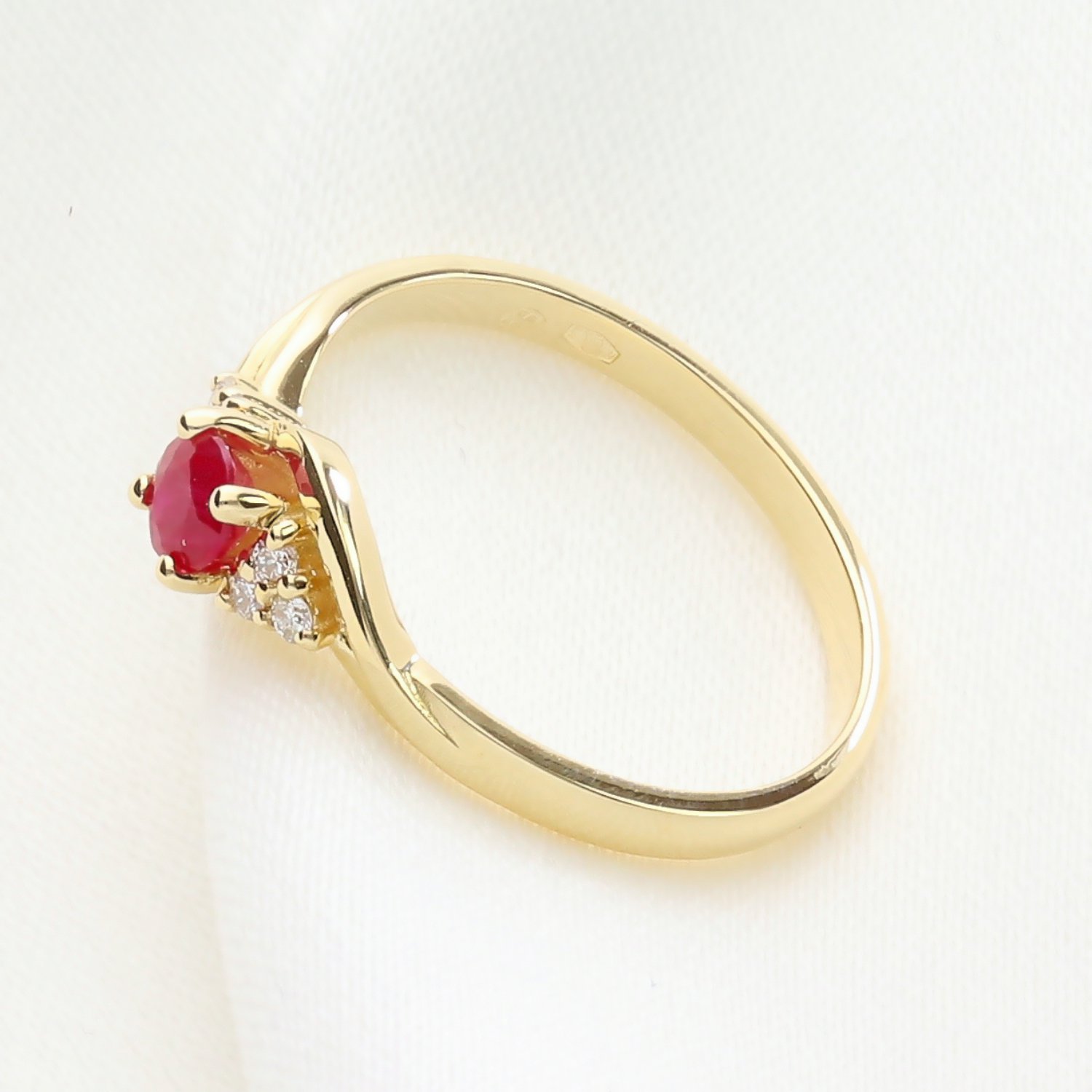 Kategoria: Pierścionki Kruszec: Złoto żółte Kamień centralny: Rubin o masie 0,29 ct. Kamień boczny: Brylanty, 6 szt. o łącznej masie 0,07 ct. Czystość: VS1-VS2 Barwa: G Próba: 585 Masa: 2,1 g.