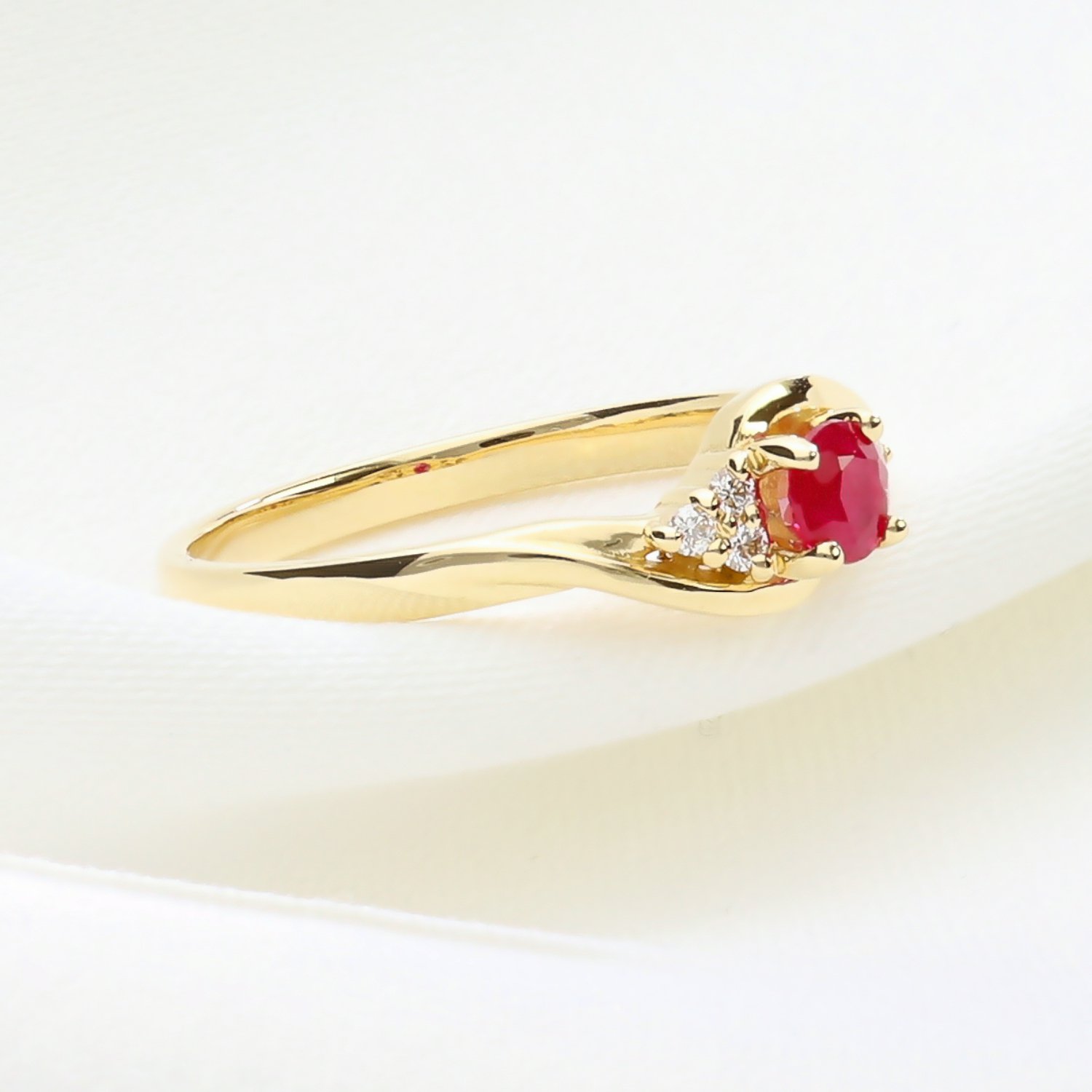 ​Rubin otoczony jest kaskadą migoczących brylantów, ułożonych w eleganckie, przecinające się linie. Drobne diamenty dodają kompozycji blasku i luksusowego charakteru, jednocześnie podkreślając głębię koloru rubinu.