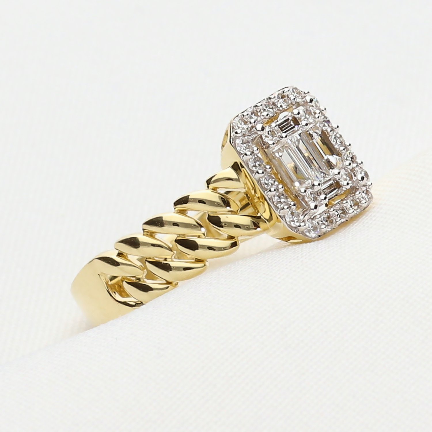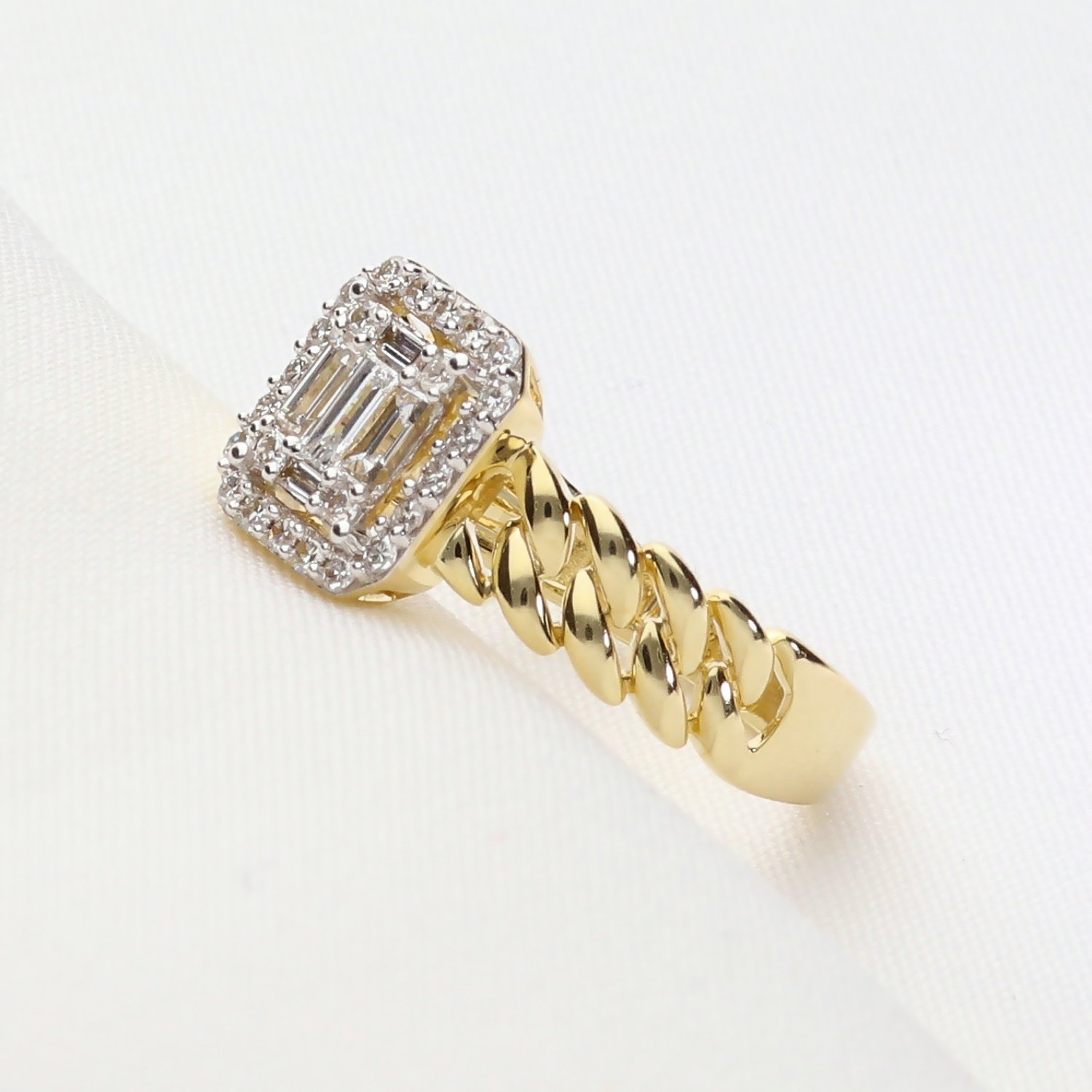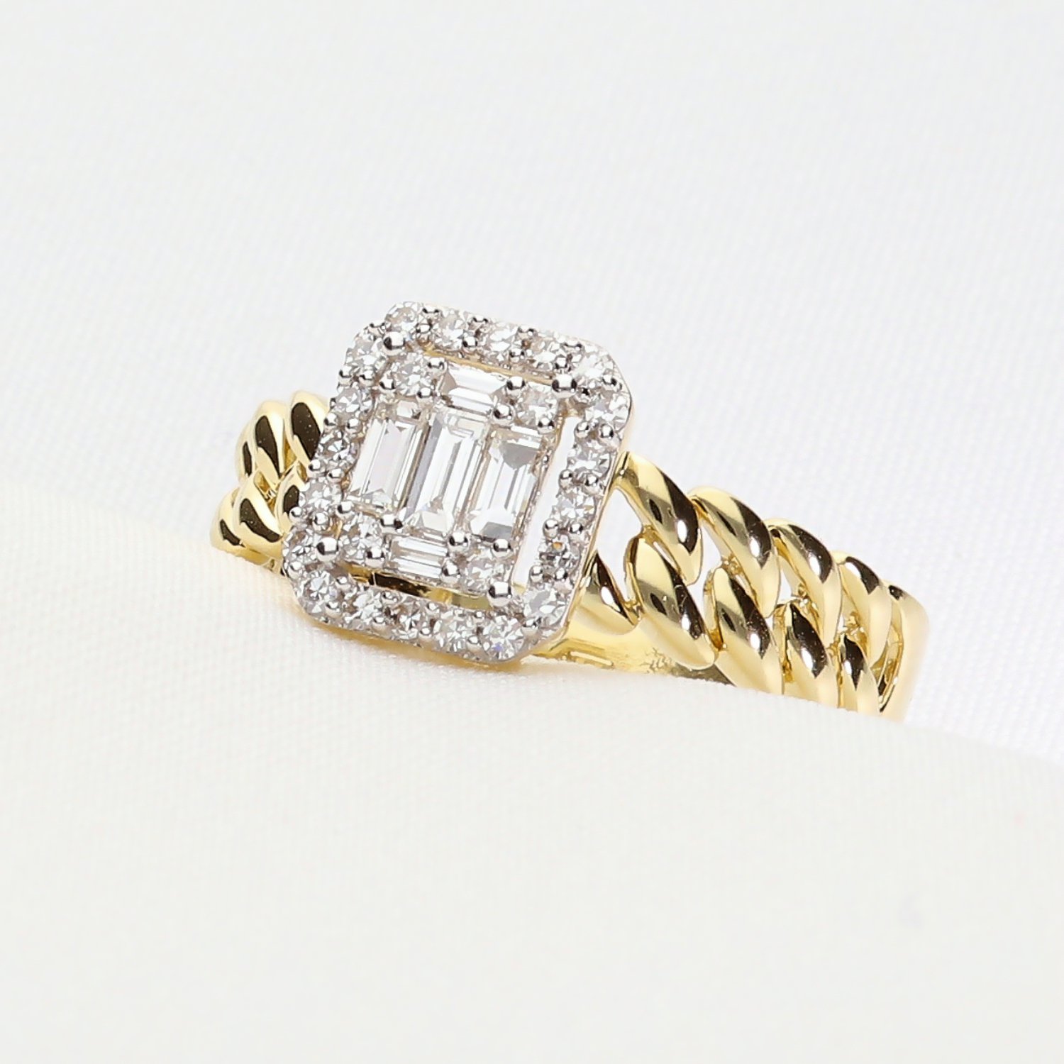 Główną osnowę pierścionka stanowi szyna wykonana w stylu splotu pancerka (Cuban Link). To solidne, wyraziste ogniwa z żółtego złota, które nadają biżuterii charakteru i sprawiają, że pięknie układa się na dłoni.