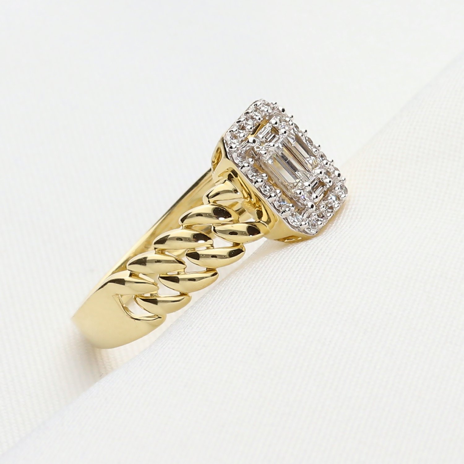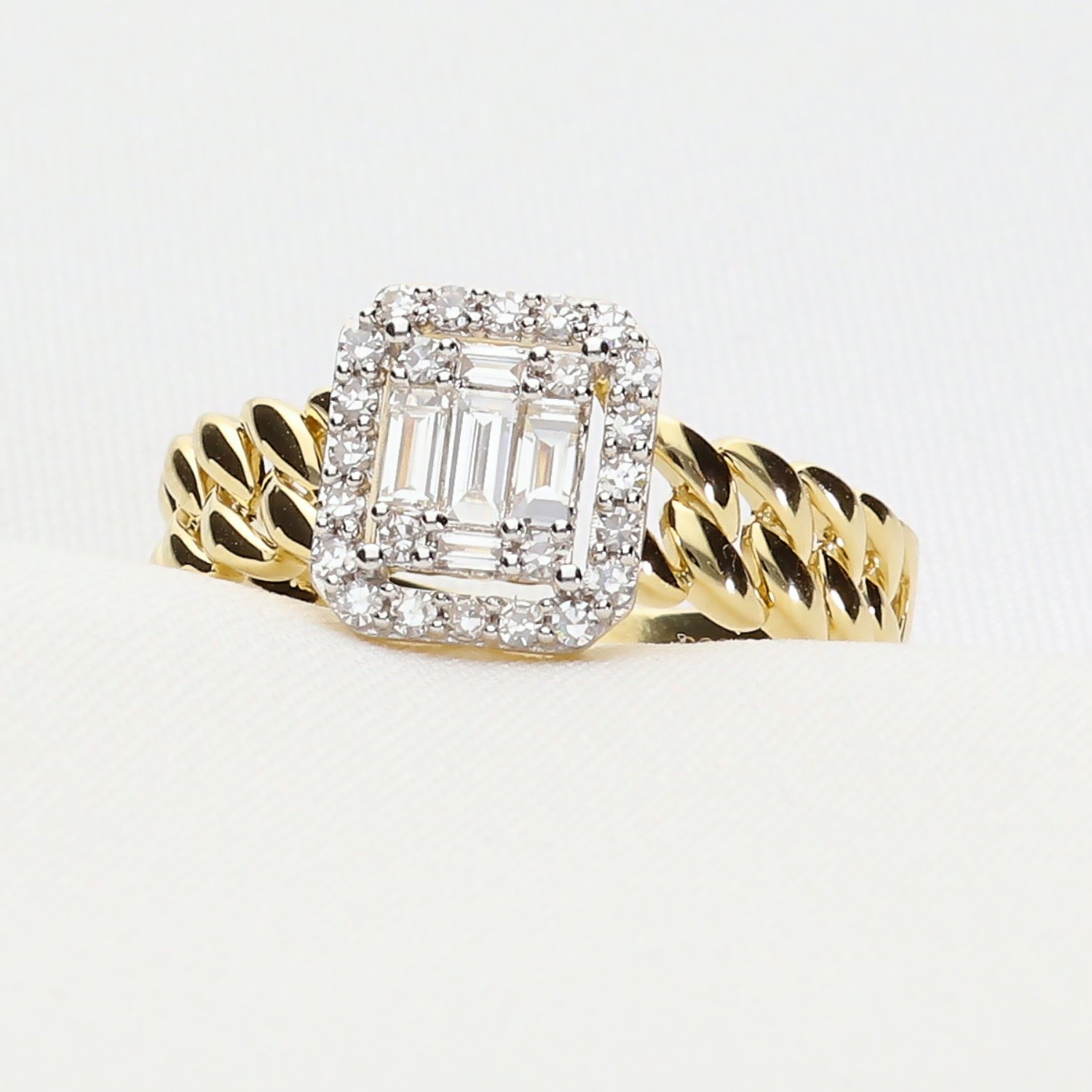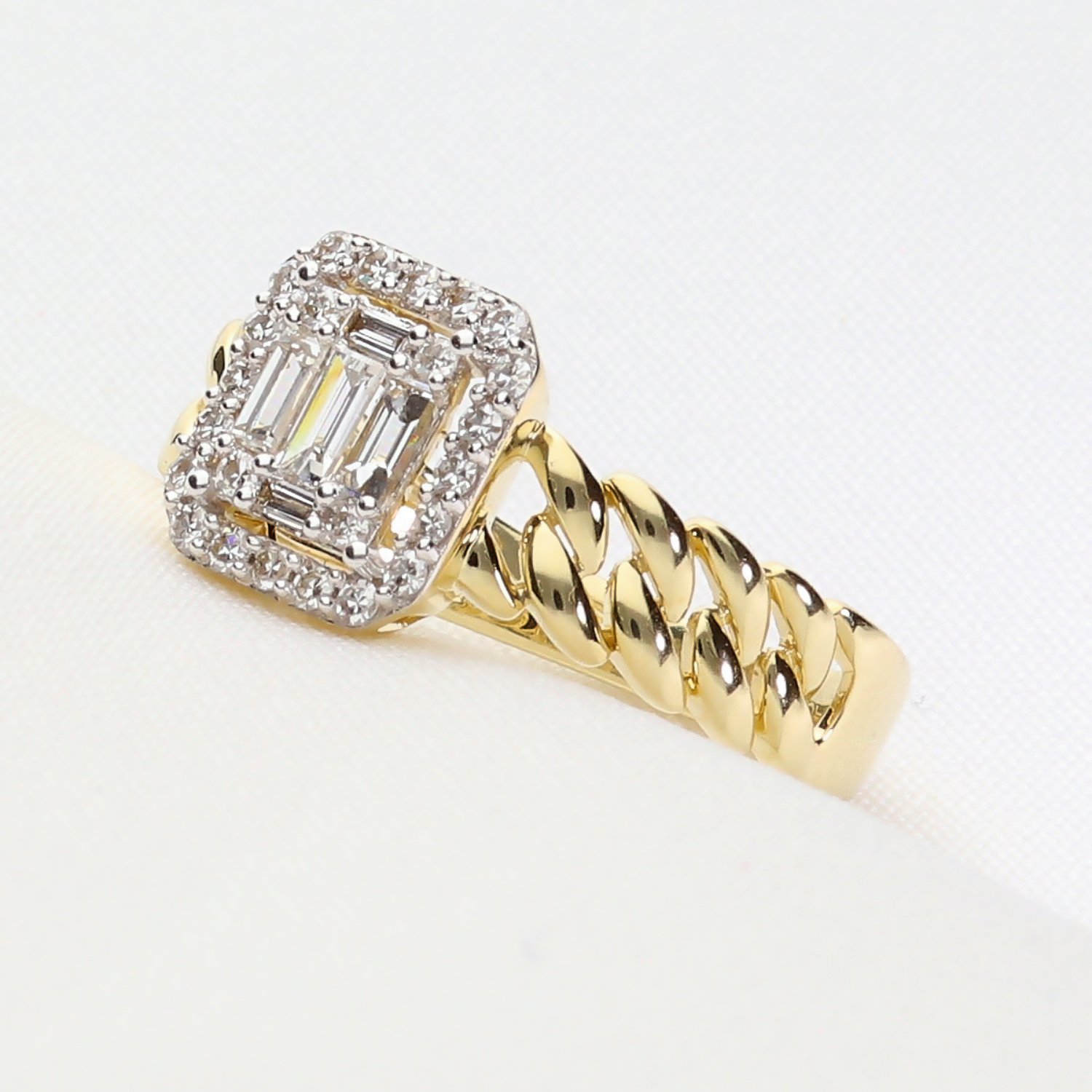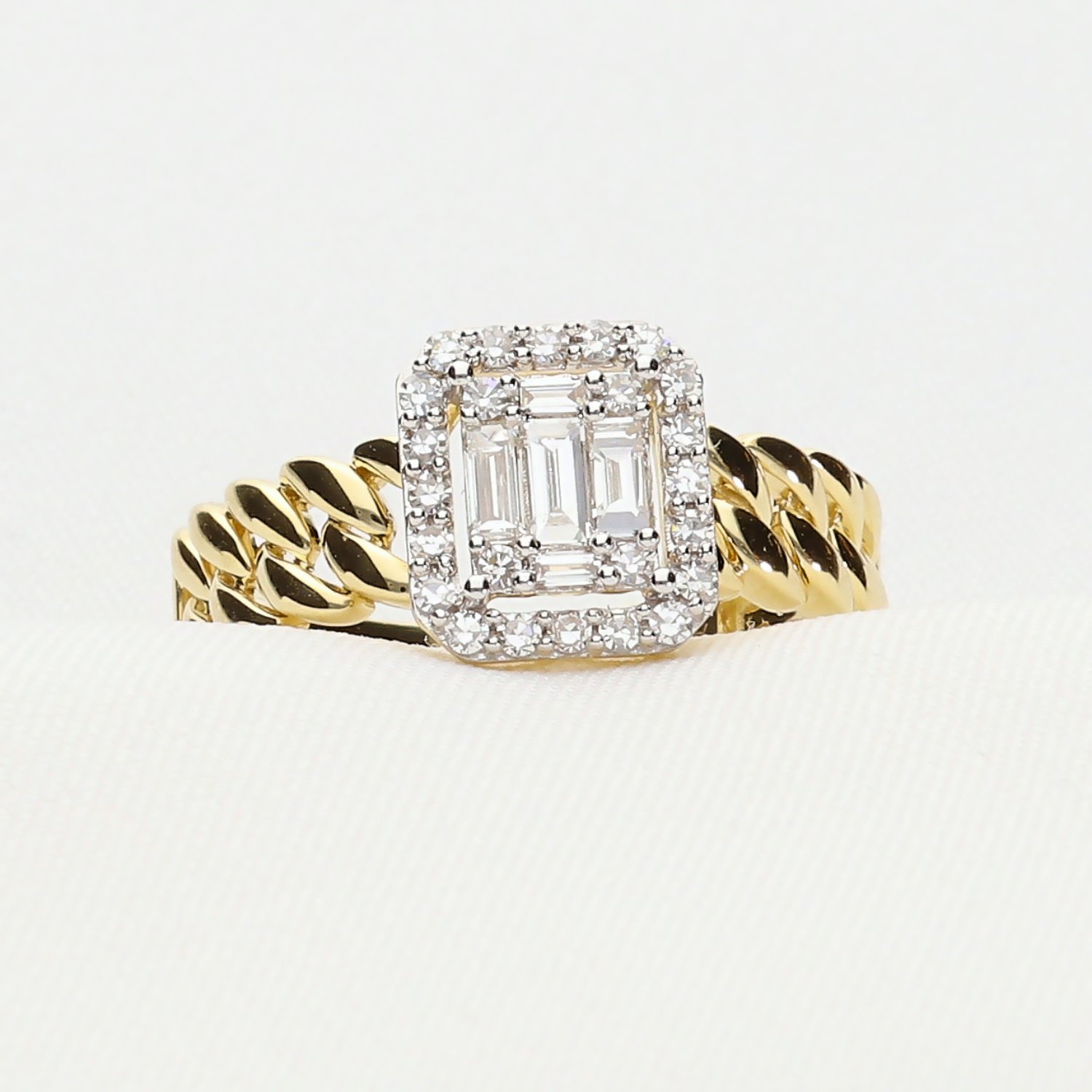 Główną osnowę pierścionka stanowi szyna wykonana w stylu splotu pancerka (Cuban Link). To solidne, wyraziste ogniwa z żółtego złota, które nadają biżuterii charakteru i sprawiają, że pięknie układa się na dłoni.