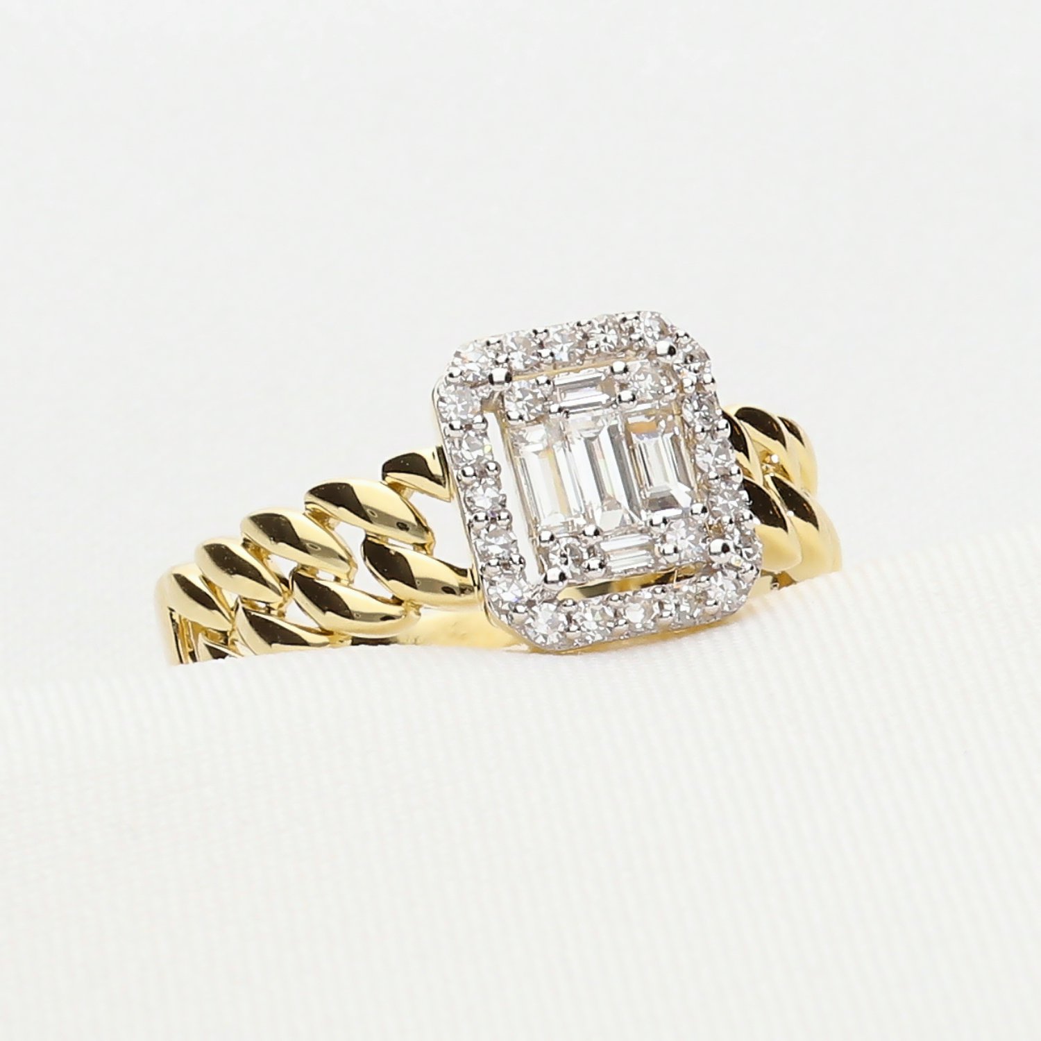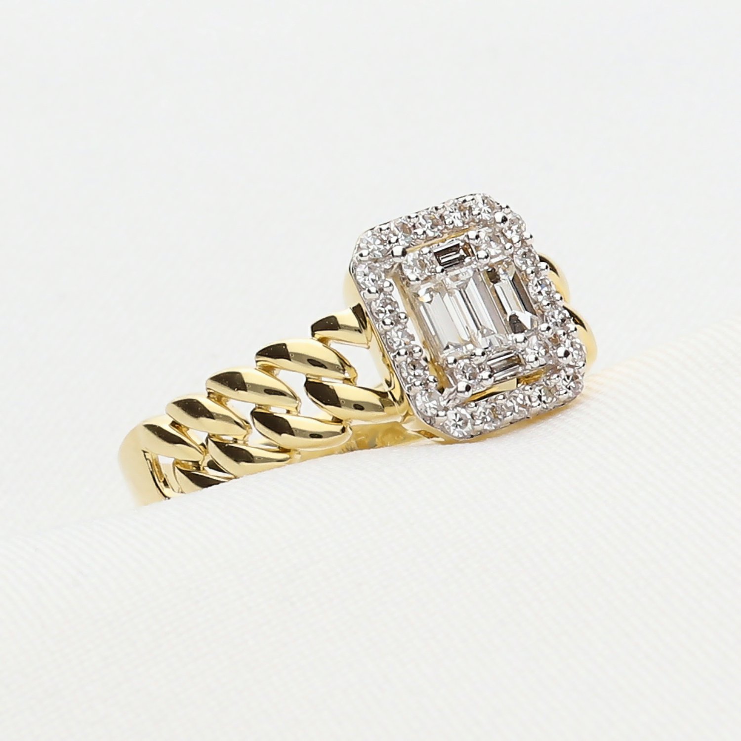 Odkryj definicję nowoczesnego luksusu z naszym wyjątkowym złotym pierścionkiem. Ten model to odważne połączenie klasycznej elegancji diamentów z modnym, biżuteryjnym trendem ostatnich sezonów.