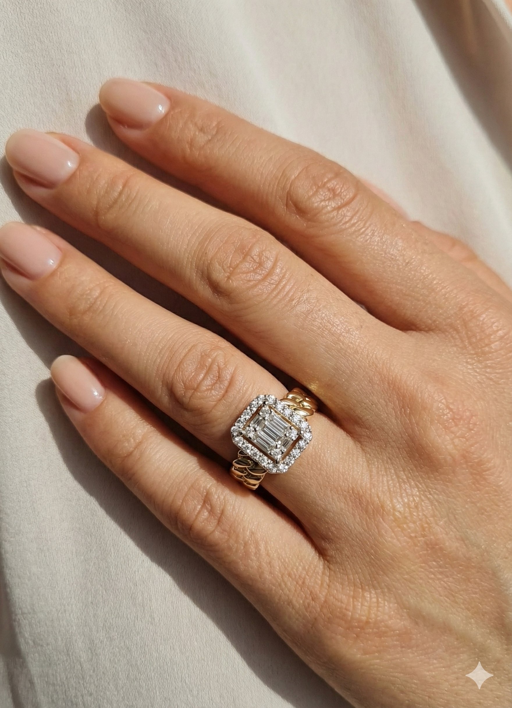 Korona pierścionka to mistrzowska kompozycja w kształcie prostokąta. Centralną część wypełniają diamenty o szlifie bagietowym (prostokątnym), które ułożone obok siebie tworzą taflę niesamowitego blasku, imitującą jeden potężny kamień. Całość otoczona jest ramką (typ Halo) wysadzaną mniejszymi diamentami o szlifie brylantowym, które dodatkowo rozświetlają kompozycję.