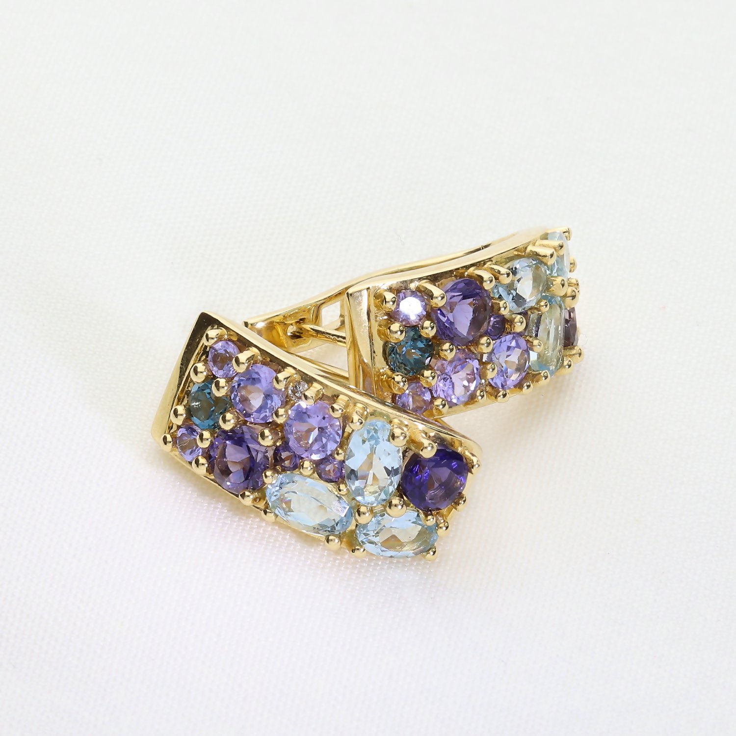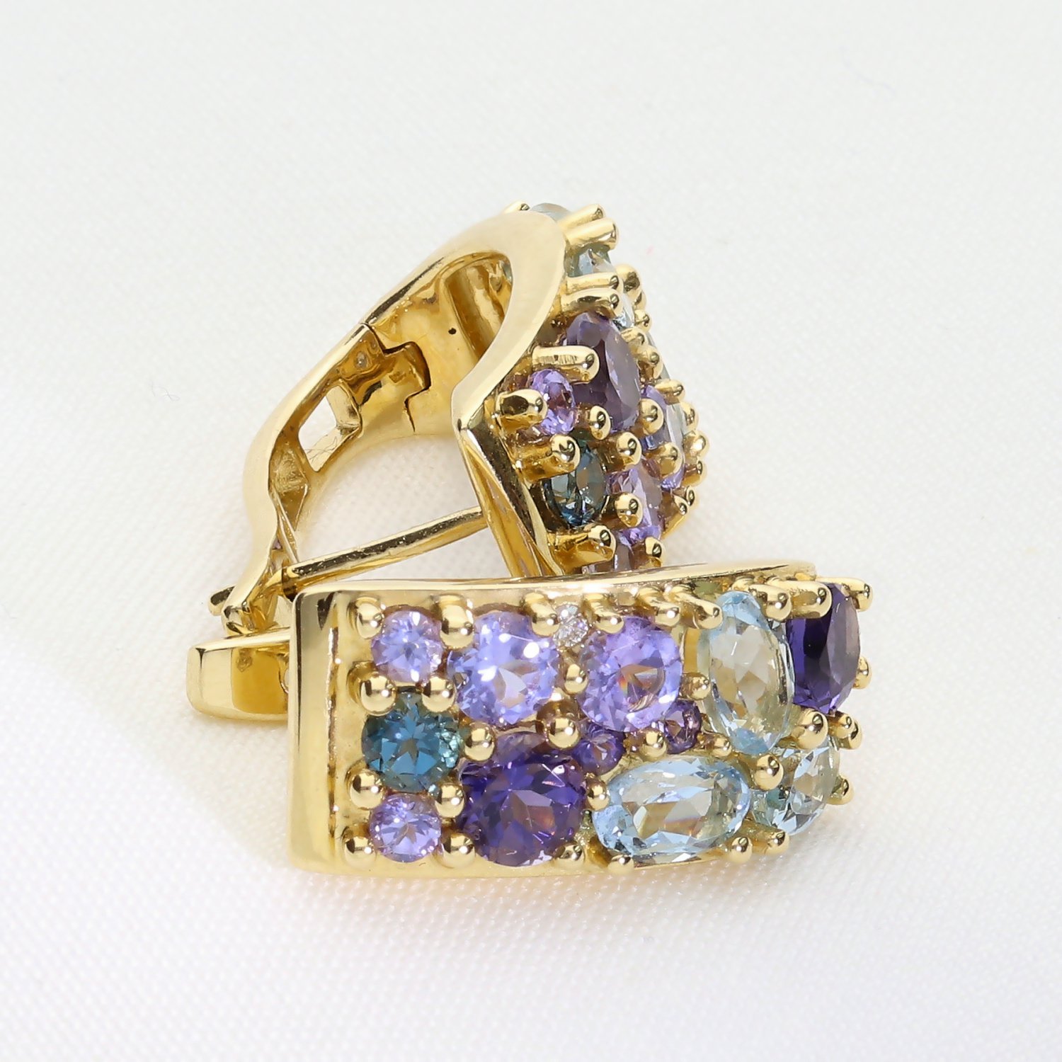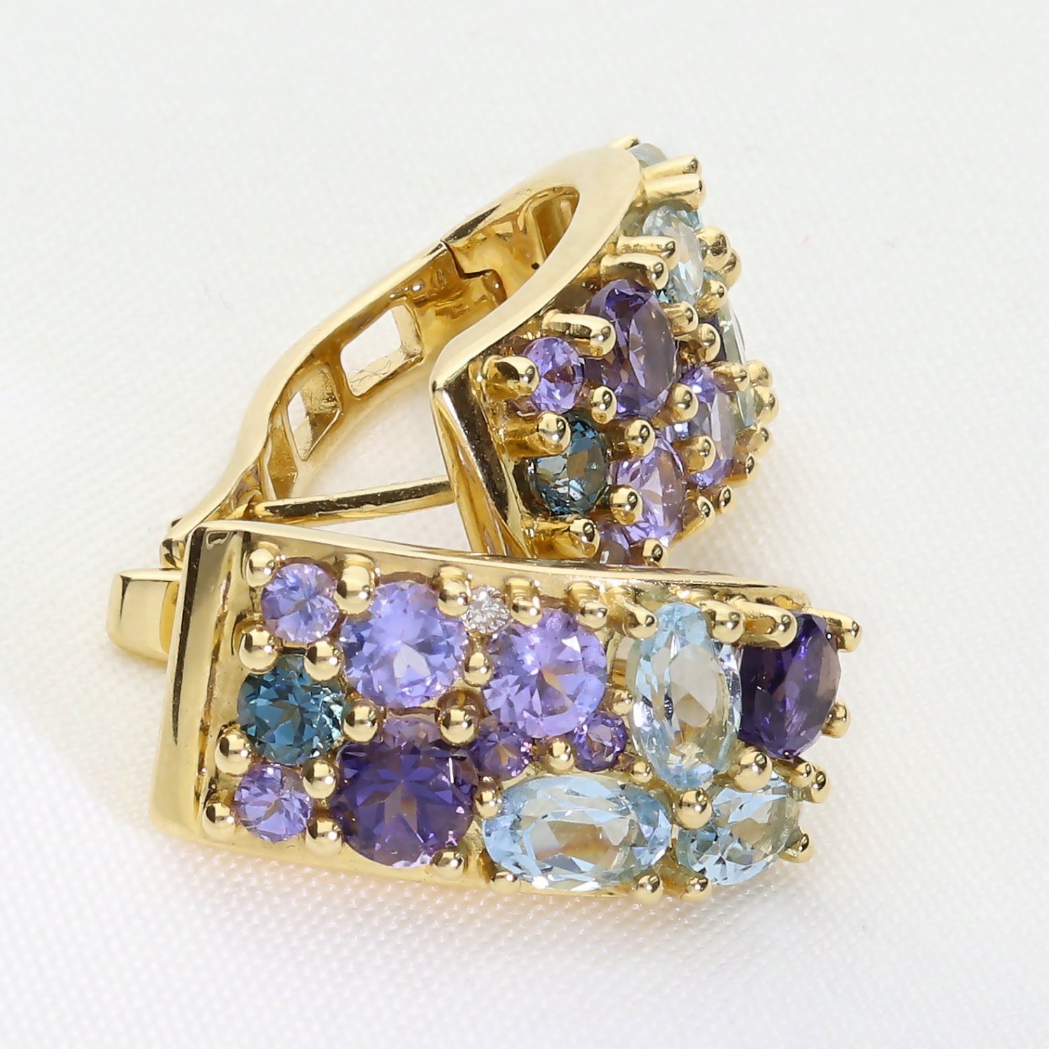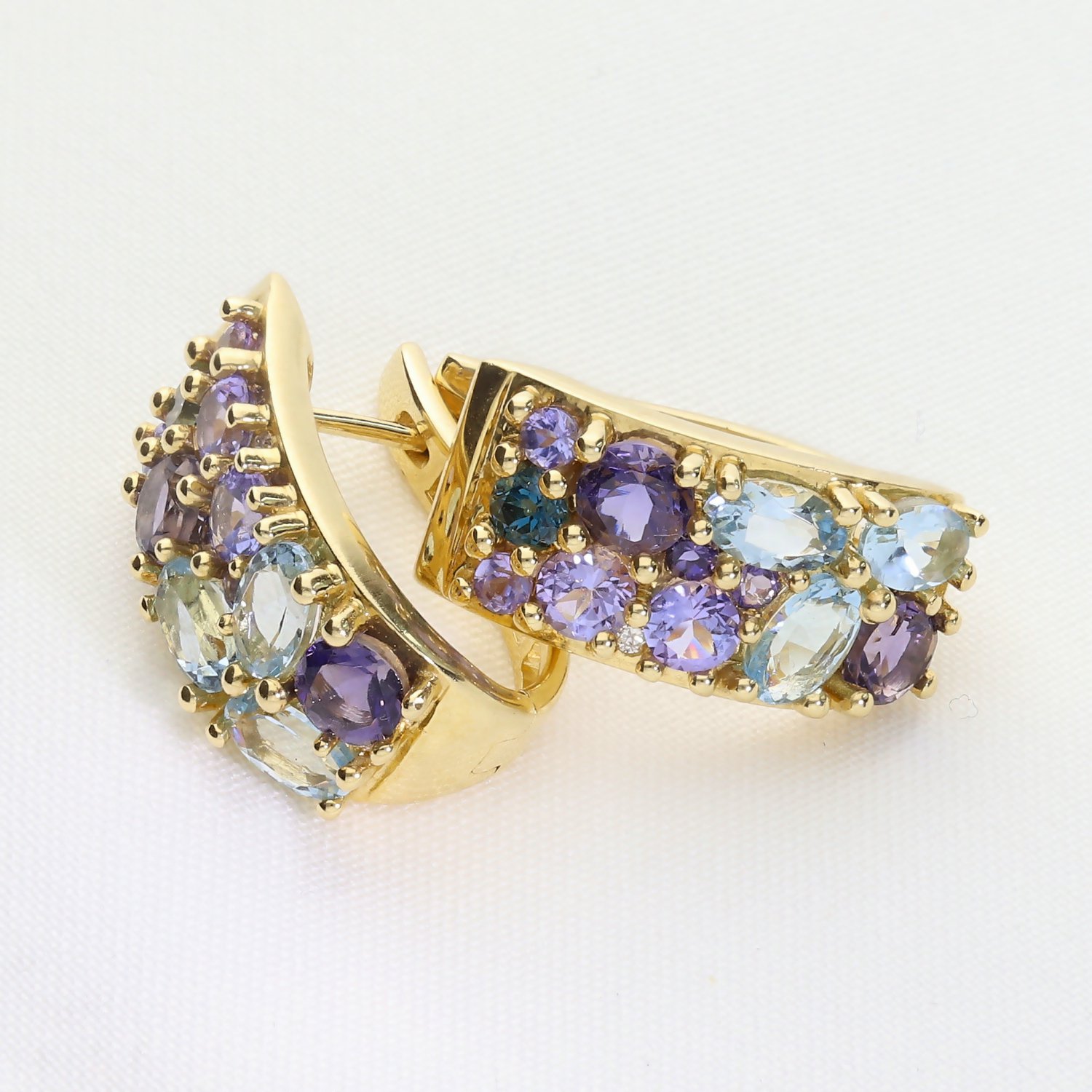 Zanurz się w świecie luksusu i wyrafinowanego stylu z tymi kunsztownymi kolczykami wykonanymi z żółtego złota najwyższej próby. Ta biżuteria to prawdziwa symfonia barw i blasku, stworzona, by zachwycać. Centralną część każdego kolczyka zdobi mistrzowska kompozycja naturalnych kamieni szlachetnych. Spokojny, chłodny odcień błękitnych topazów przeplata się z głębokim, nasyconym granatem topazów London Blue, tworząc hipnotyzujący kontrast. Pomiędzy nimi pysznią się rzadkie tanzanity o unikalnej, fioletowo-niebieskiej barwie, dodając całości królewskiego charakteru. Aby zapewnić niezapomniany blask, kompozycja została zwieńczona precyzyjnie osadzonymi diamentami o brylantowym szlifie. Brylanty te pięknie łapią i odbijają światło przy każdym, nawet najmniejszym ruchu głowy, rozświetlając twarz noszącej je kobiety. Konstrukcja kolczyków to eleganckie, złote blaszki wysadzane kamieniami, które subtelnie wyginają się, dopasowując do ucha. Wygodne i bezpieczne zapięcie typu sztyft gwarantuje komfort noszenia przez cały dzień, zarówno na co dzień, jak i podczas wielkich wyjść.