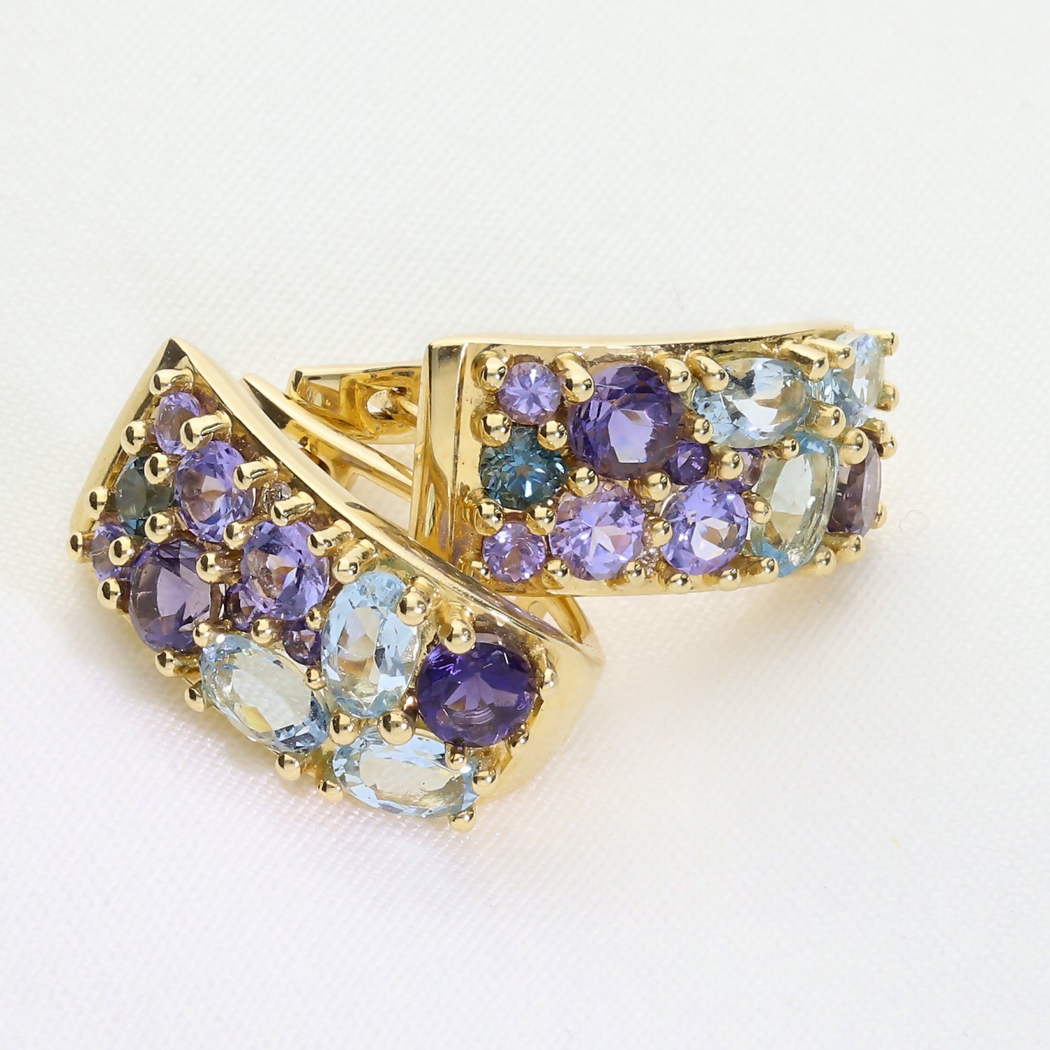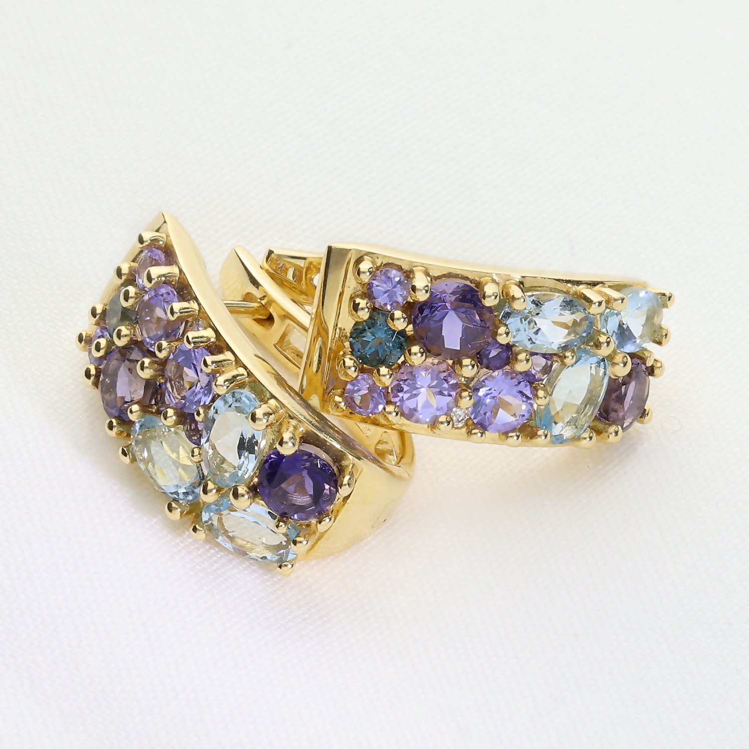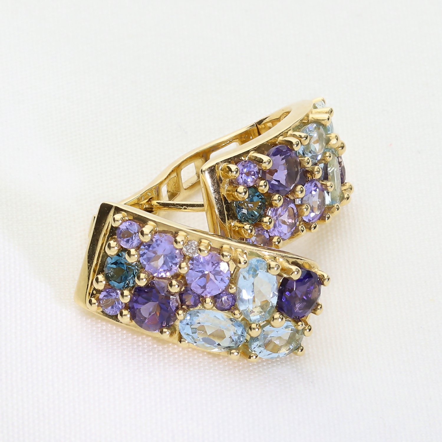 Zanurz się w świecie luksusu i wyrafinowanego stylu z tymi kunsztownymi kolczykami wykonanymi z żółtego złota najwyższej próby. Ta biżuteria to prawdziwa symfonia barw i blasku, stworzona, by zachwycać. Centralną część każdego kolczyka zdobi mistrzowska kompozycja naturalnych kamieni szlachetnych. Spokojny, chłodny odcień błękitnych topazów przeplata się z głębokim, nasyconym granatem topazów London Blue, tworząc hipnotyzujący kontrast. Pomiędzy nimi pysznią się rzadkie tanzanity o unikalnej, fioletowo-niebieskiej barwie, dodając całości królewskiego charakteru. Aby zapewnić niezapomniany blask, kompozycja została zwieńczona precyzyjnie osadzonymi diamentami o brylantowym szlifie. Brylanty te pięknie łapią i odbijają światło przy każdym, nawet najmniejszym ruchu głowy, rozświetlając twarz noszącej je kobiety. Konstrukcja kolczyków to eleganckie, złote blaszki wysadzane kamieniami, które subtelnie wyginają się, dopasowując do ucha. Wygodne i bezpieczne zapięcie typu sztyft gwarantuje komfort noszenia przez cały dzień, zarówno na co dzień, jak i podczas wielkich wyjść.