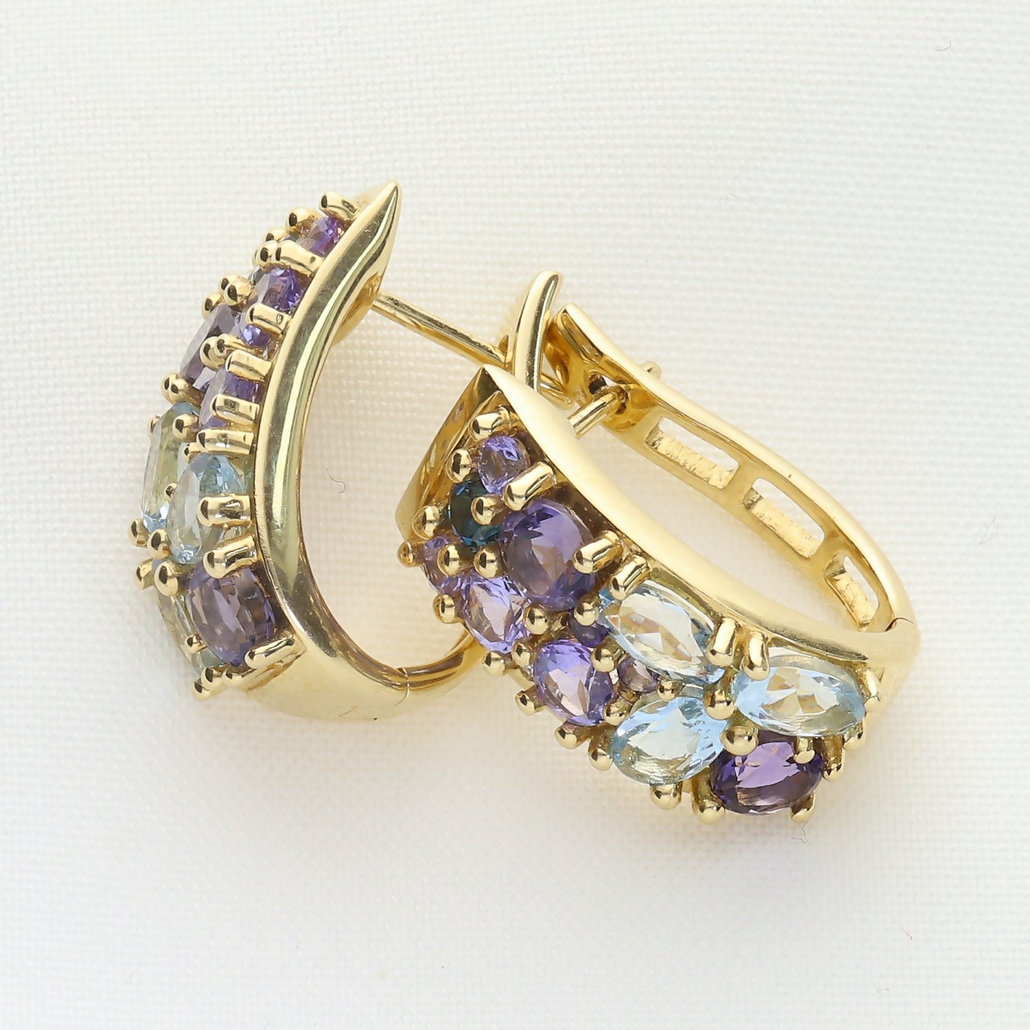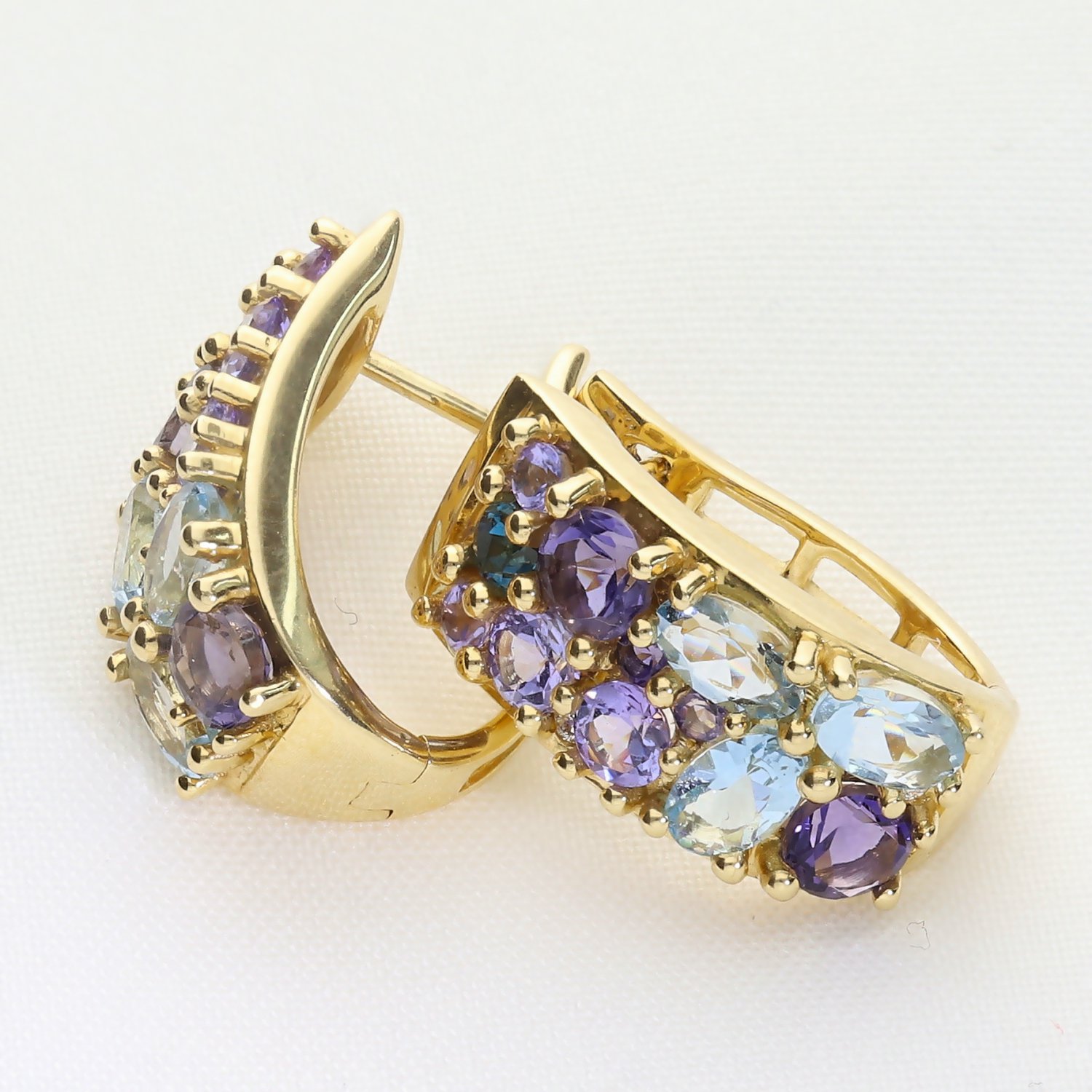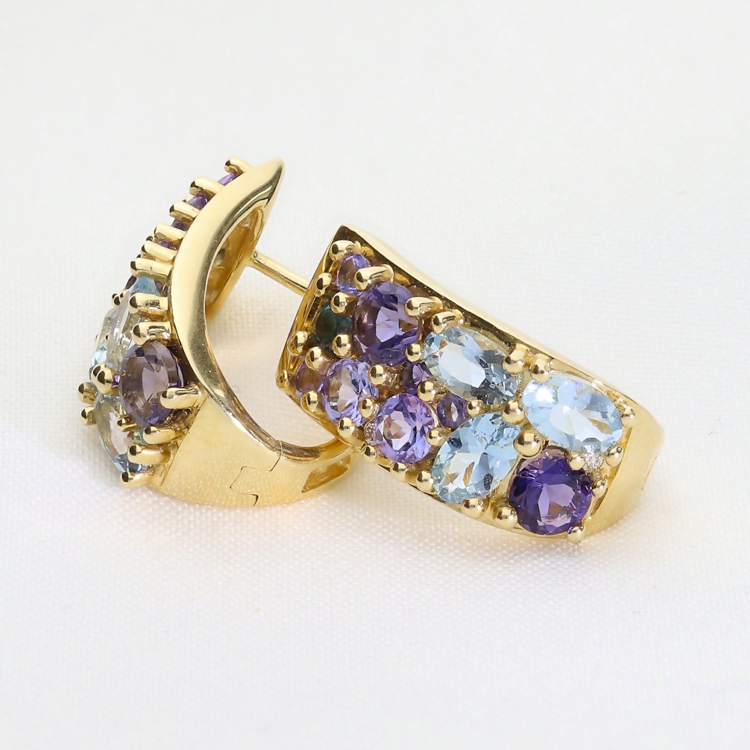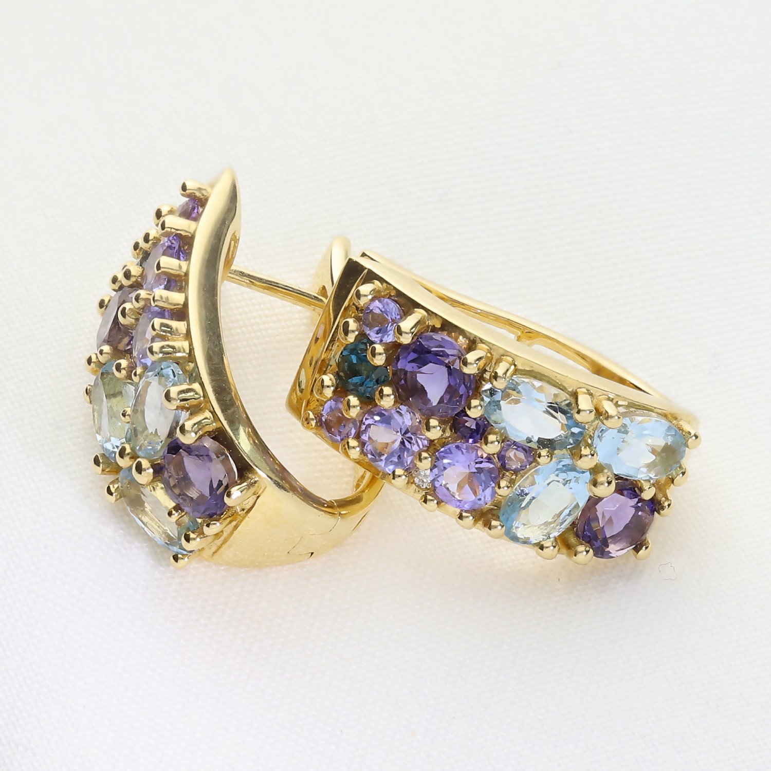 Zanurz się w świecie luksusu i wyrafinowanego stylu z tymi kunsztownymi kolczykami wykonanymi z żółtego złota najwyższej próby. Ta biżuteria to prawdziwa symfonia barw i blasku, stworzona, by zachwycać. Centralną część każdego kolczyka zdobi mistrzowska kompozycja naturalnych kamieni szlachetnych. Spokojny, chłodny odcień błękitnych topazów przeplata się z głębokim, nasyconym granatem topazów London Blue, tworząc hipnotyzujący kontrast. Pomiędzy nimi pysznią się rzadkie tanzanity o unikalnej, fioletowo-niebieskiej barwie, dodając całości królewskiego charakteru. Aby zapewnić niezapomniany blask, kompozycja została zwieńczona precyzyjnie osadzonymi diamentami o brylantowym szlifie. Brylanty te pięknie łapią i odbijają światło przy każdym, nawet najmniejszym ruchu głowy, rozświetlając twarz noszącej je kobiety. Konstrukcja kolczyków to eleganckie, złote blaszki wysadzane kamieniami, które subtelnie wyginają się, dopasowując do ucha. Wygodne i bezpieczne zapięcie typu sztyft gwarantuje komfort noszenia przez cały dzień, zarówno na co dzień, jak i podczas wielkich wyjść.