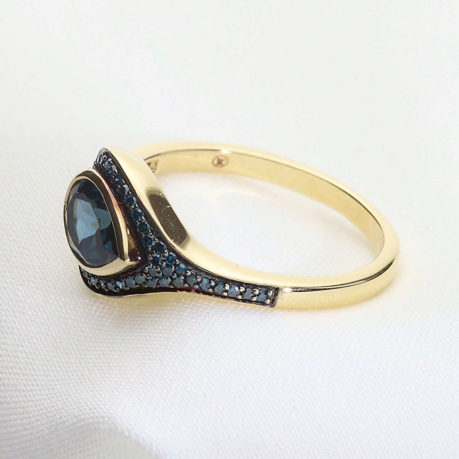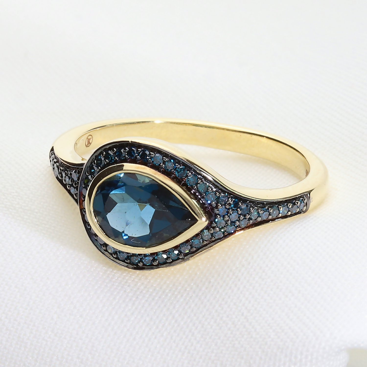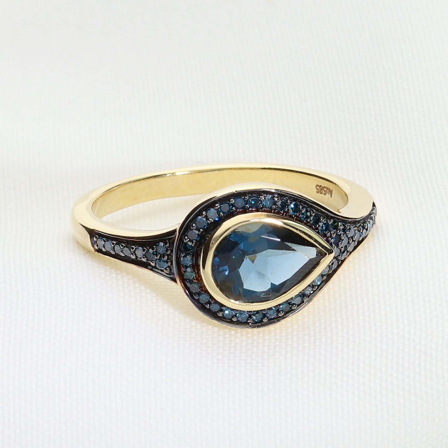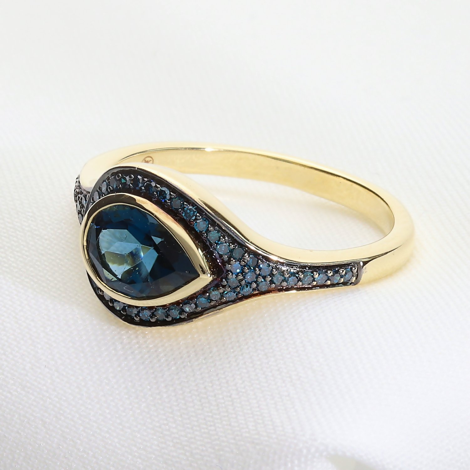 Złoty pierścionek z topazem London Blue i błękitnymi brylantami