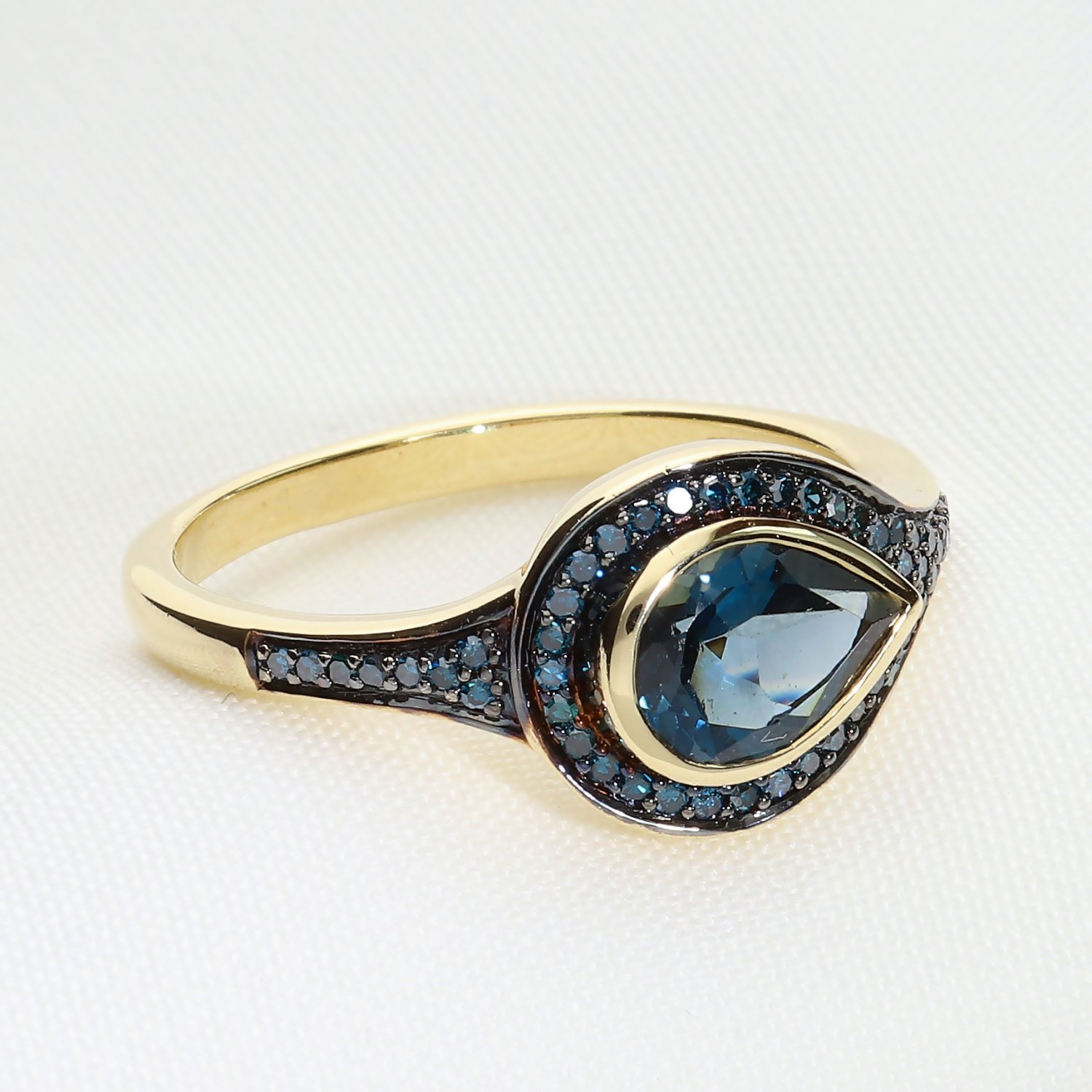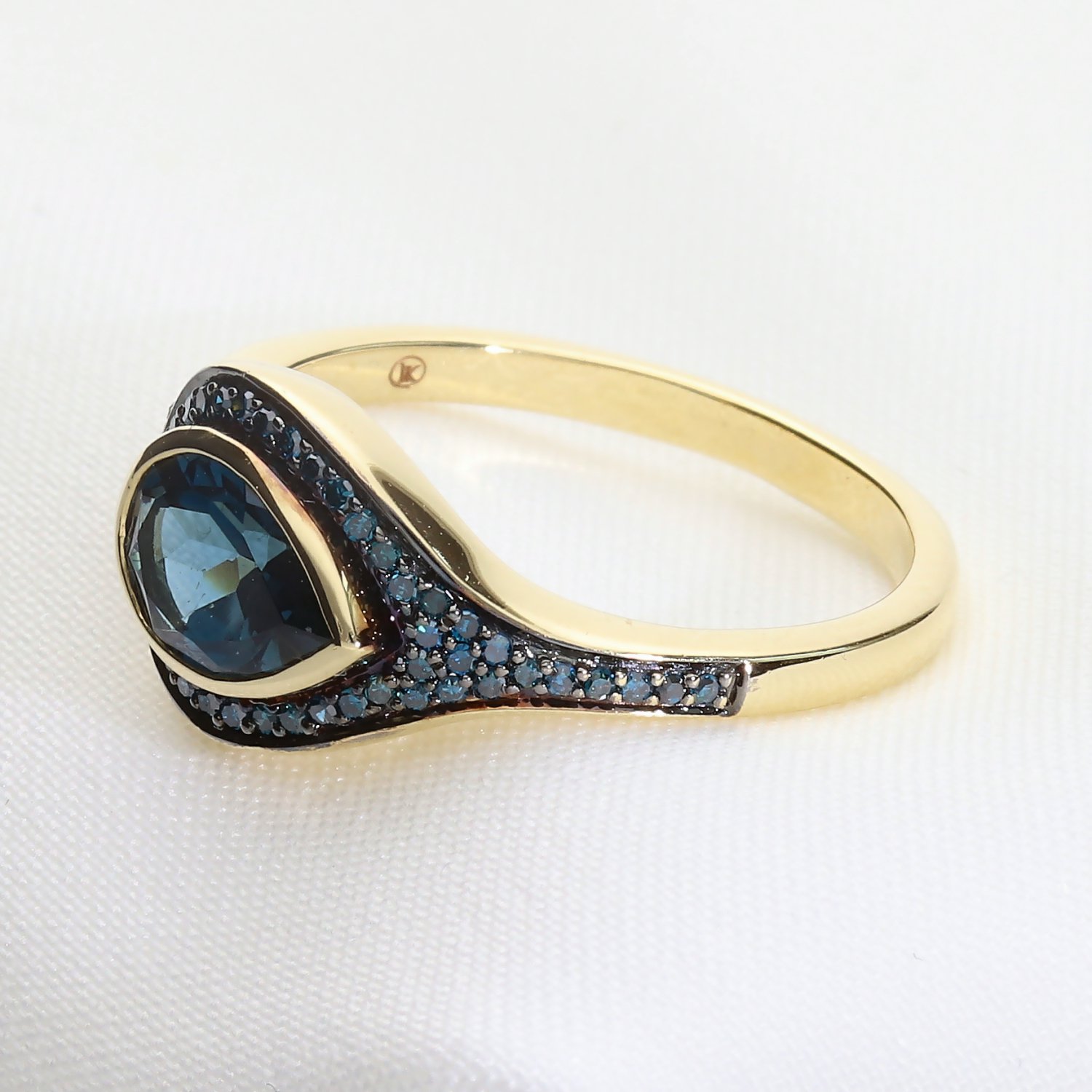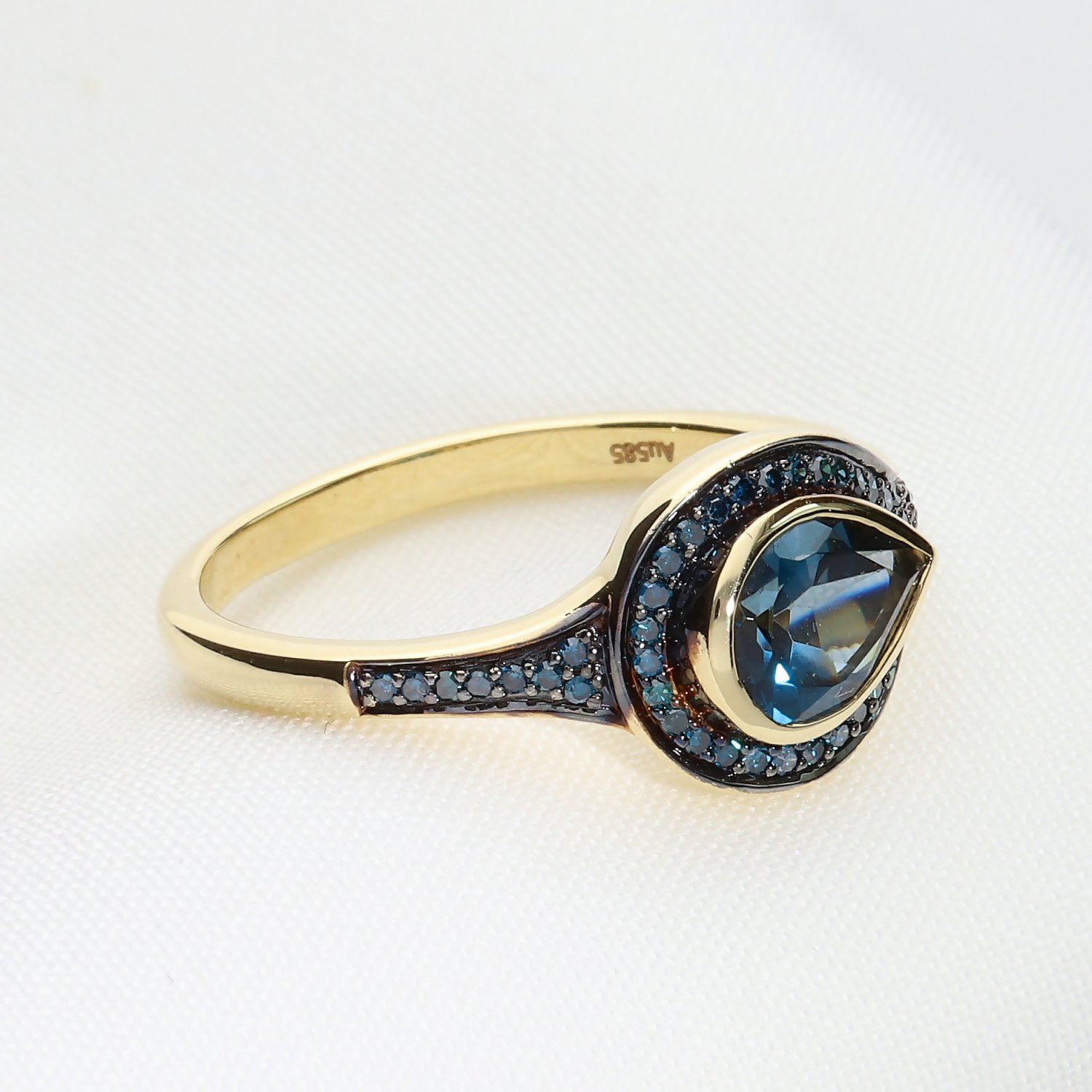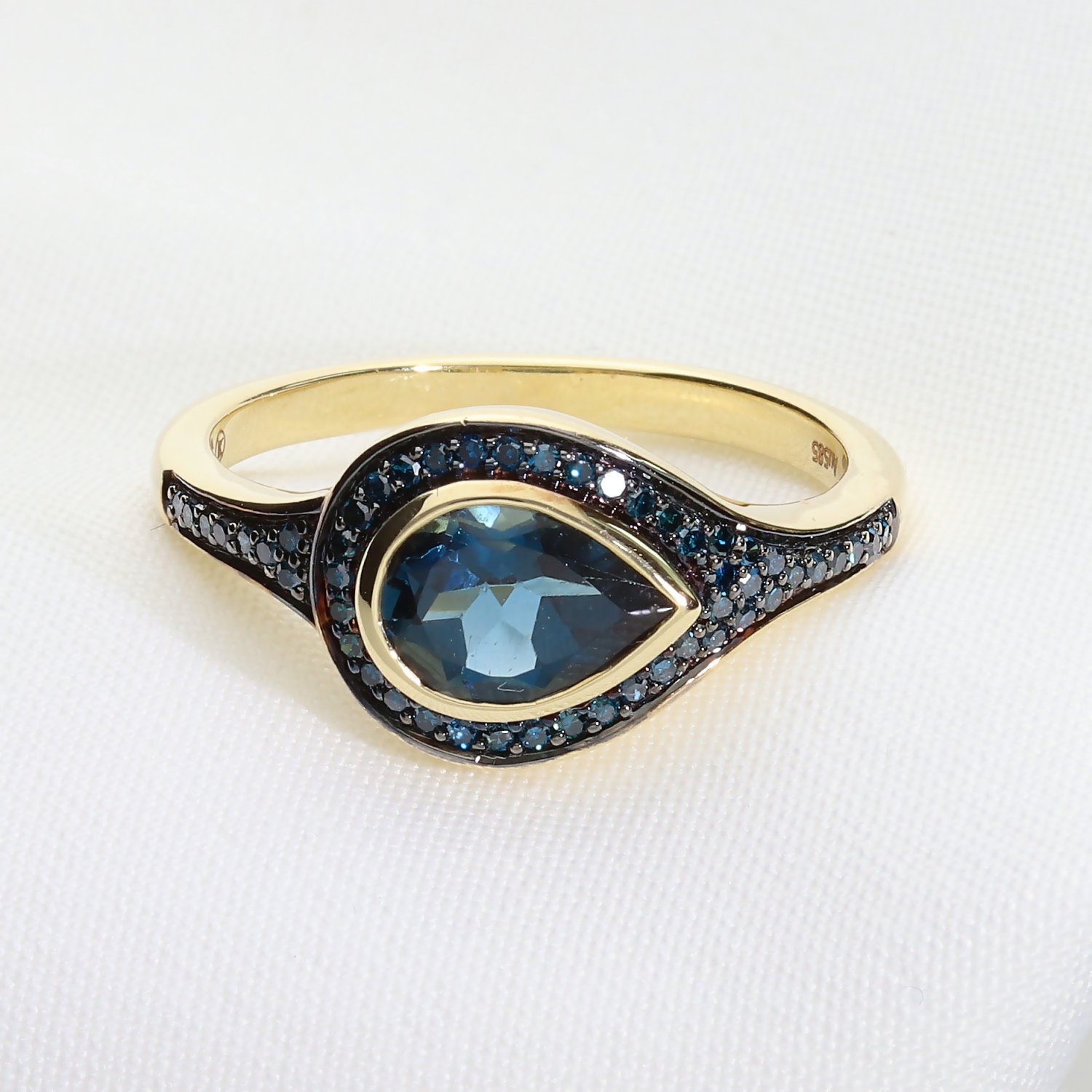 Złoty pierścionek z topazem London Blue i błękitnymi brylantami