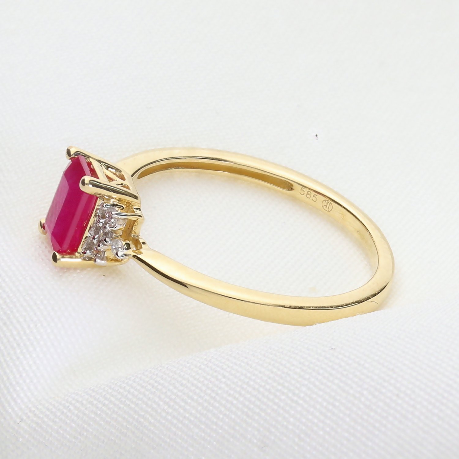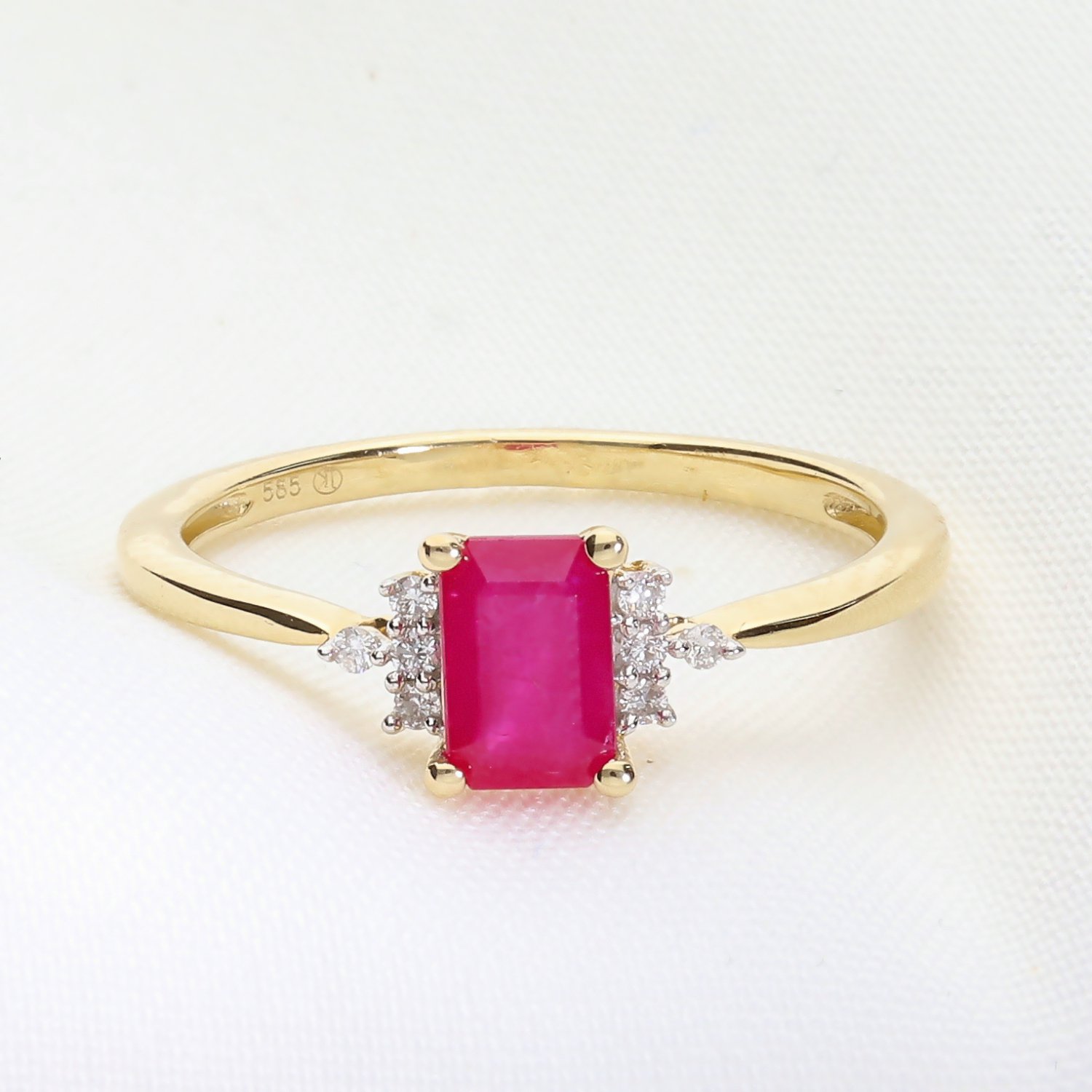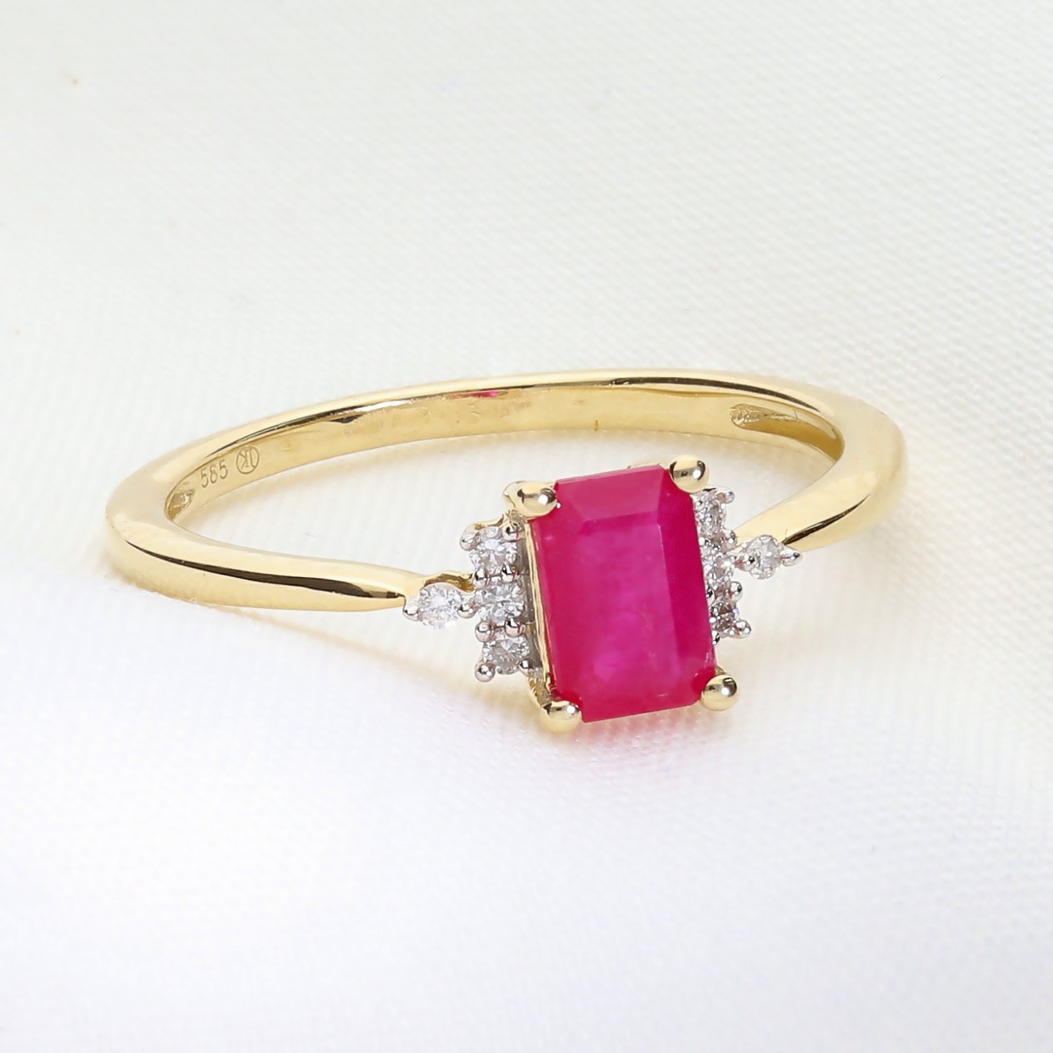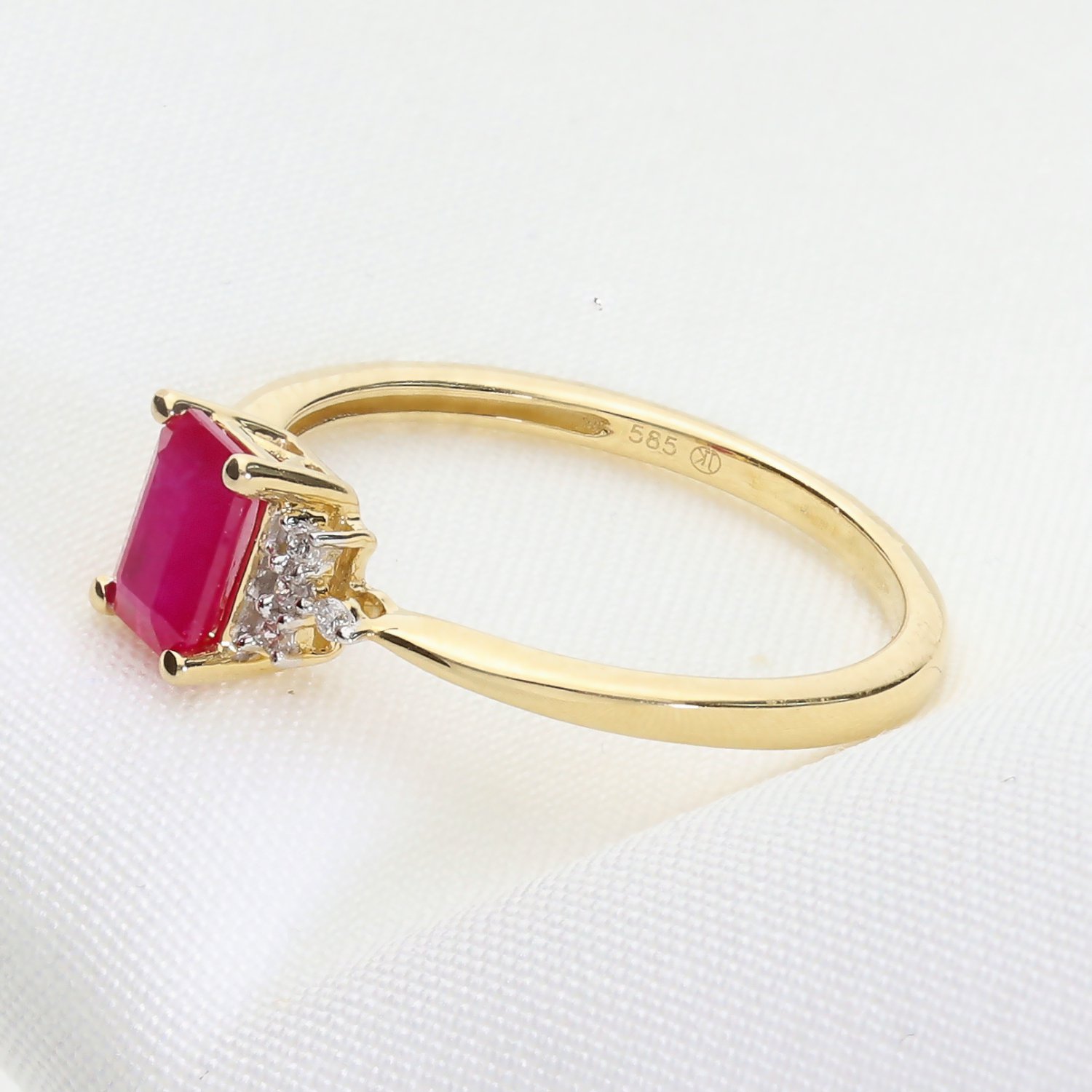 Kategoria: Pierścionki Kruszec: Złoto żółte Kamień centralny: Rubin o masie 1,29 ct. Kamień boczny: Brylanty, 8 szt. o łącznej masie 0,051 ct. Czystość: SI Barwa: GH Próba: 585 Dla: Niej Masa: 1,8 ct.