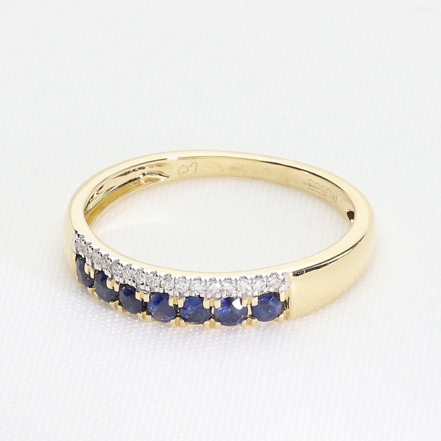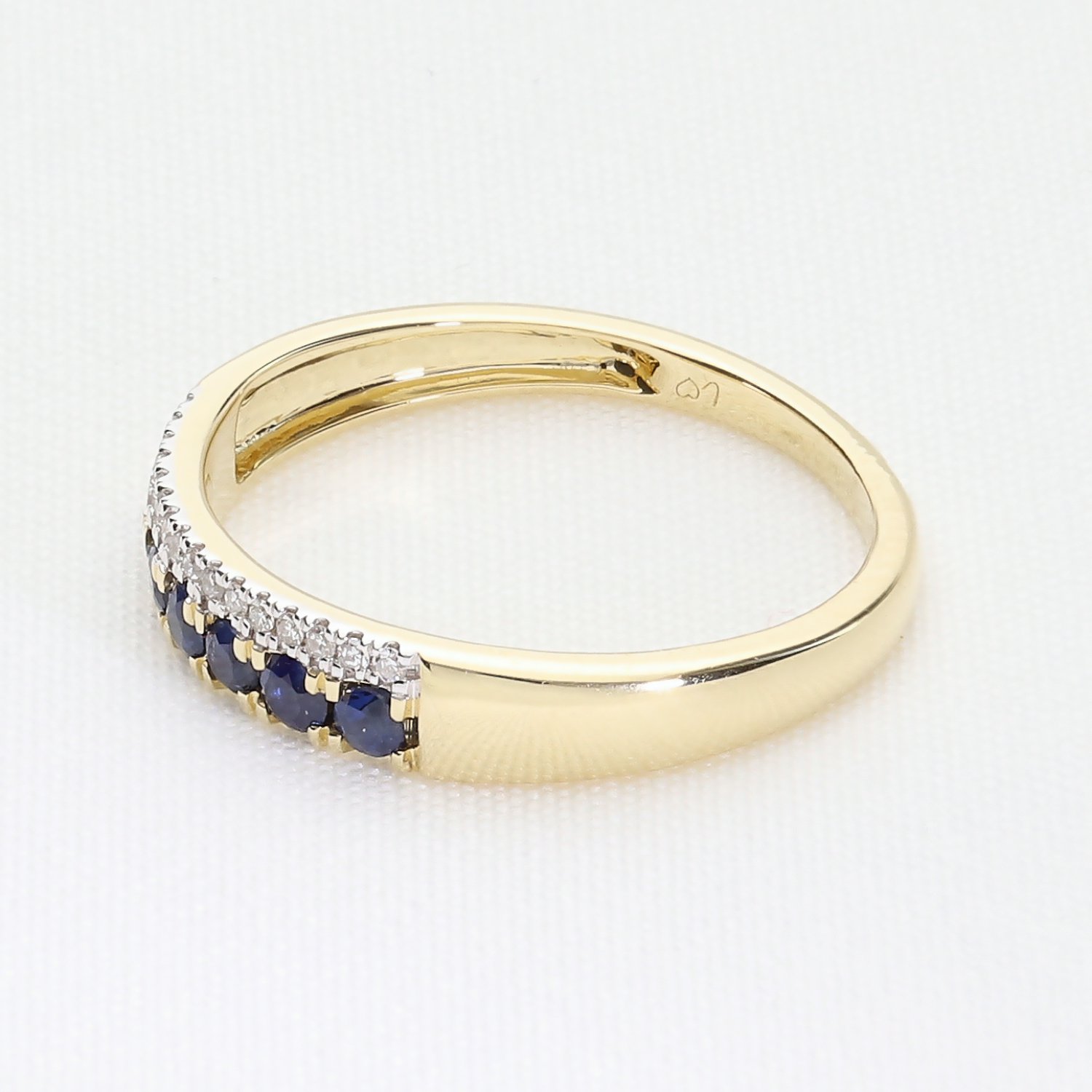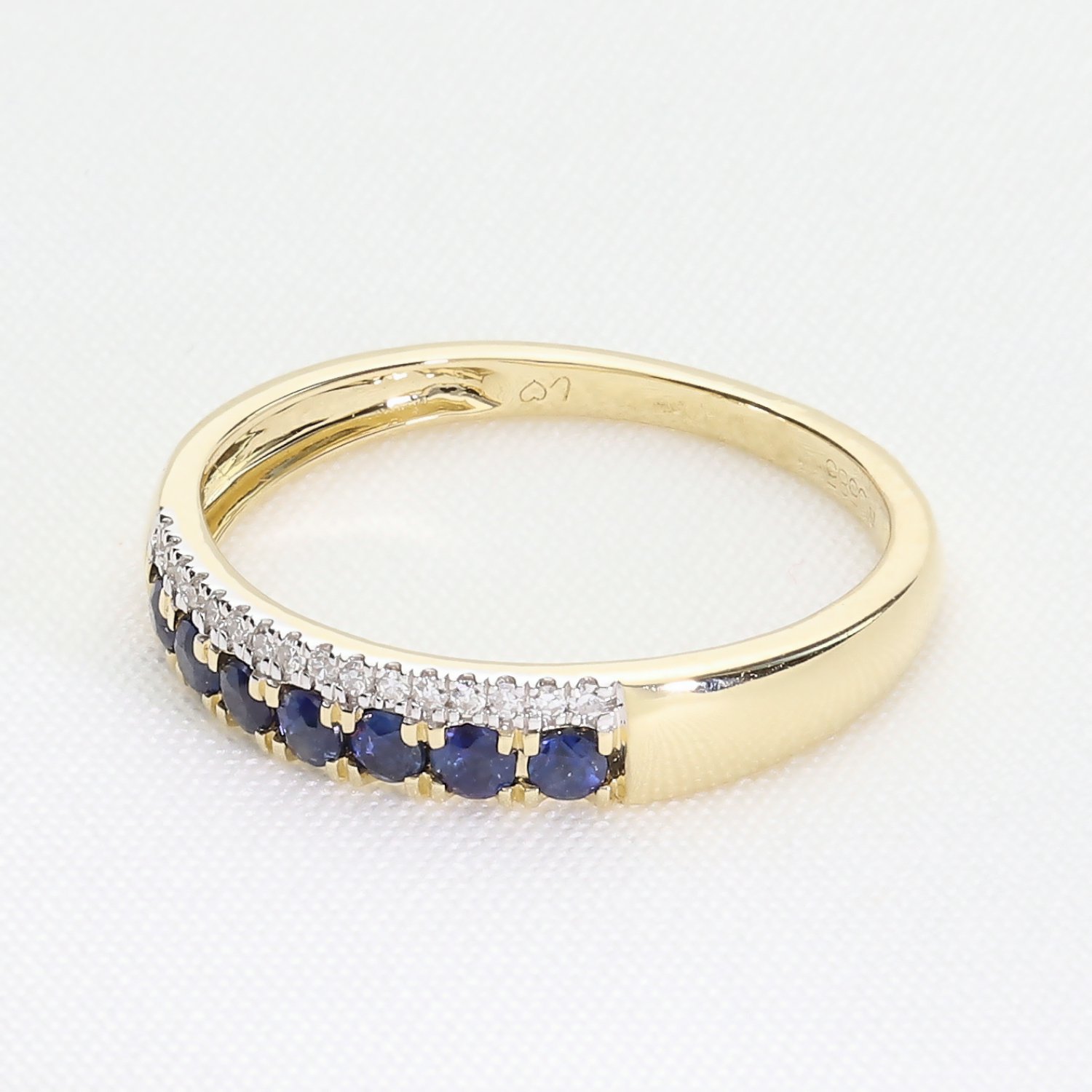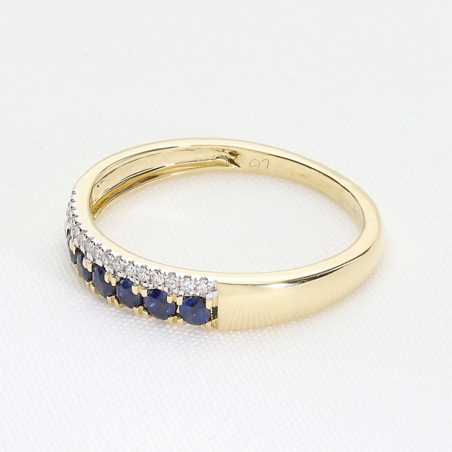 Głęboki granat szafirów w połączeniu z żółtym złotem to zestawienie niezwykle eleganckie. Pierścionek będzie głównym punktem każdej stylizacji – od wieczorowych sukni po biznesowe garnitury. Świetnie komponuje się z bielą, szarością, czernią oraz wszelkimi odcieniami błękitu, dodając całości szlachetnego charakteru.